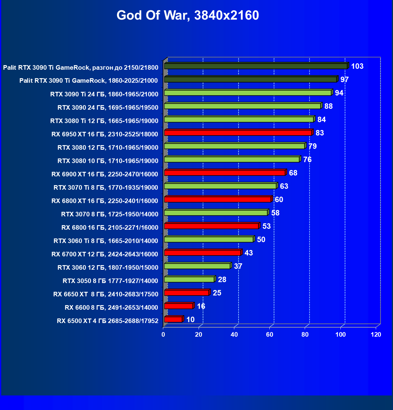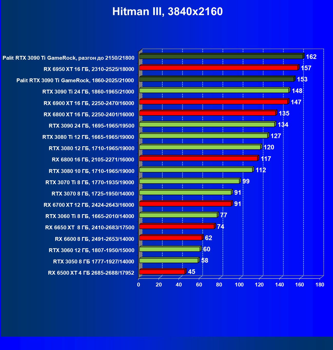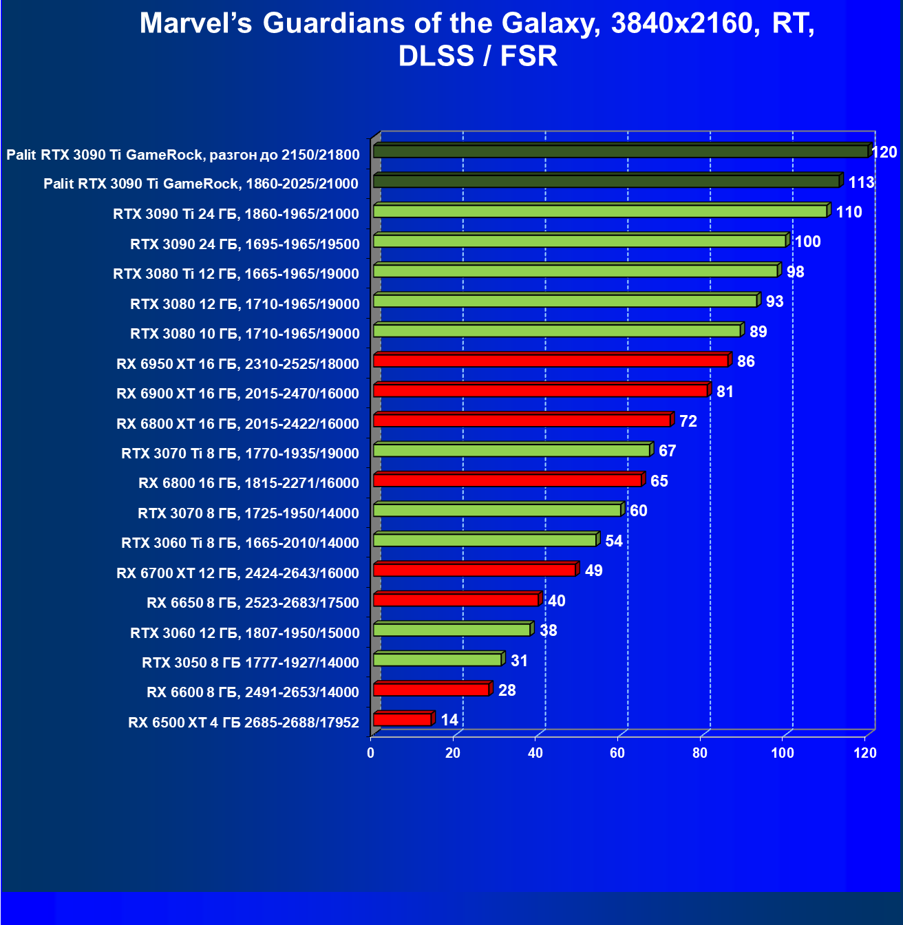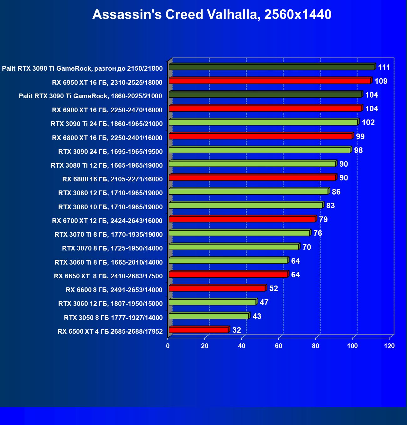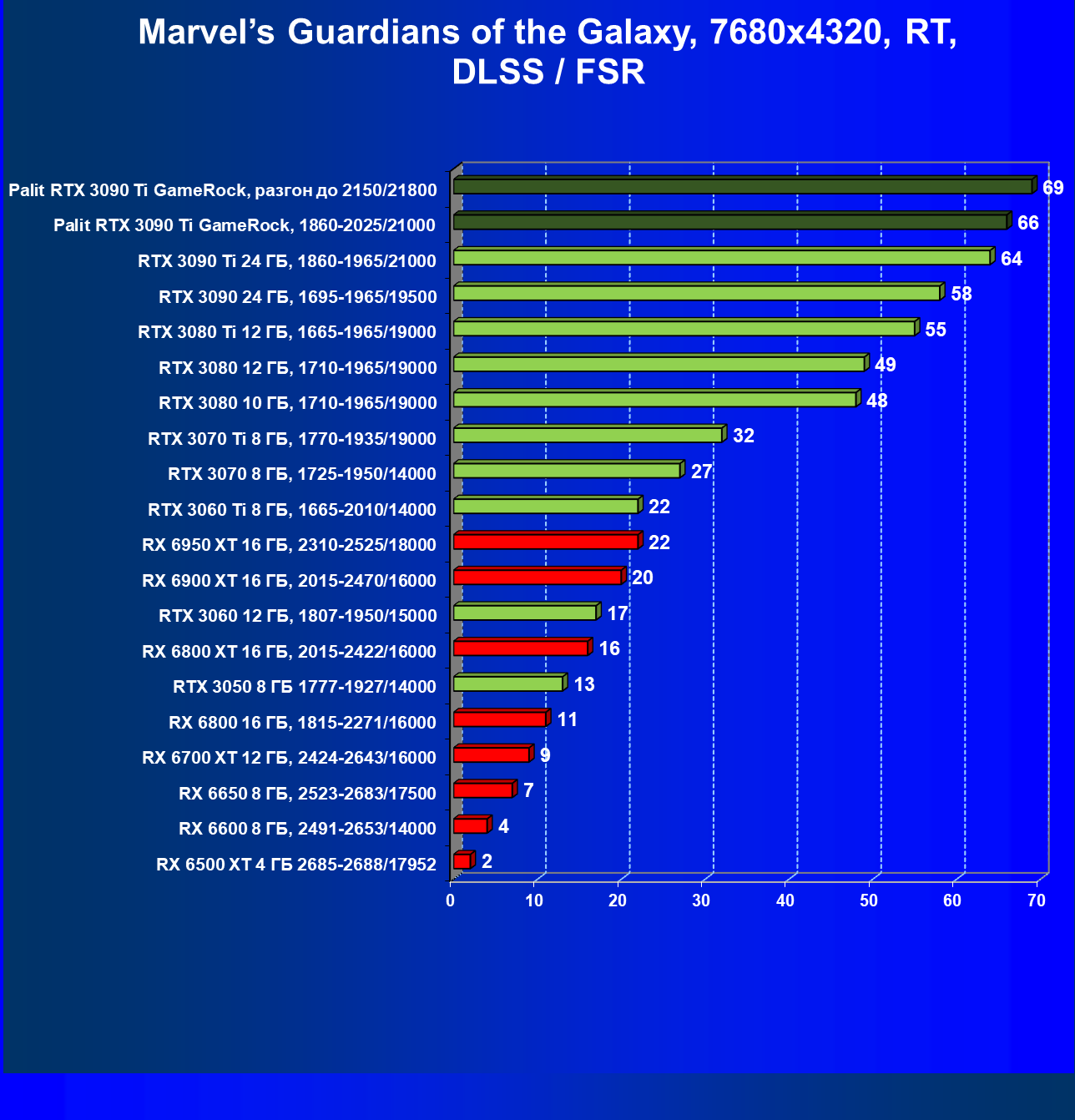 | 14 | RX 6950 XT 16 ГБ, 2310—2525/18000 | 63 | 678 | 108 000 |