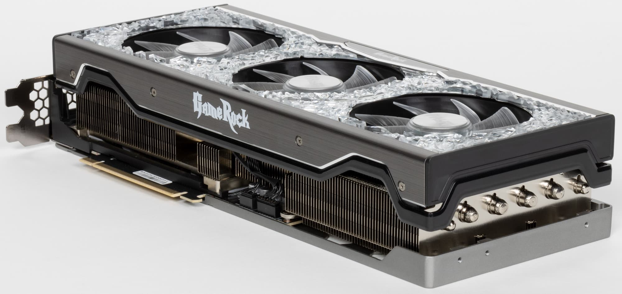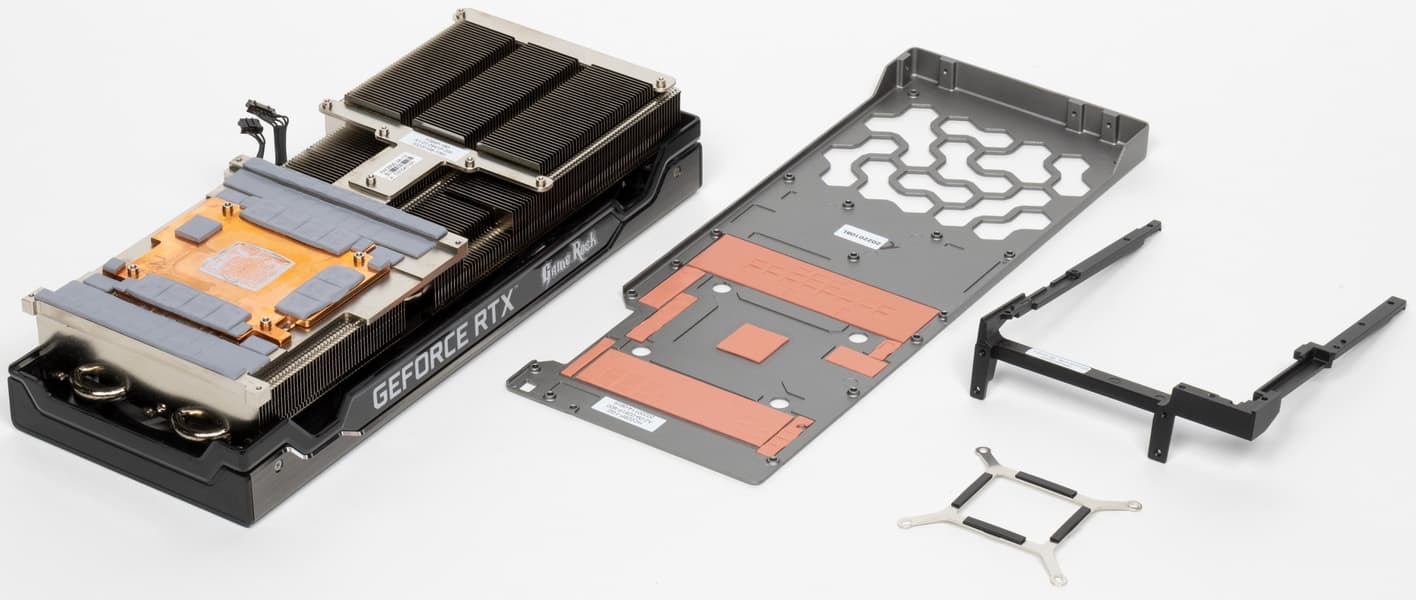 В целом концепция СО у этой карты соответствует той, что рекомендовала Nvidia при выпуске RTX 3xxx серии: компактная PCB и система охлаждения, продувающая крайним вентилятором радиатор насквозь. Собственно, инженеры Palit по сути усилили такой вариант: основой кулера является огромный многосекционный пластинчатый никелированный радиатор с тепловыми трубками, распределяющими тепло по ребрам радиатора. Трубки припаяны к огромному медному плато (подошве). Испарительной камеры в данном случае нет, просто сама подошва весьма толстая.