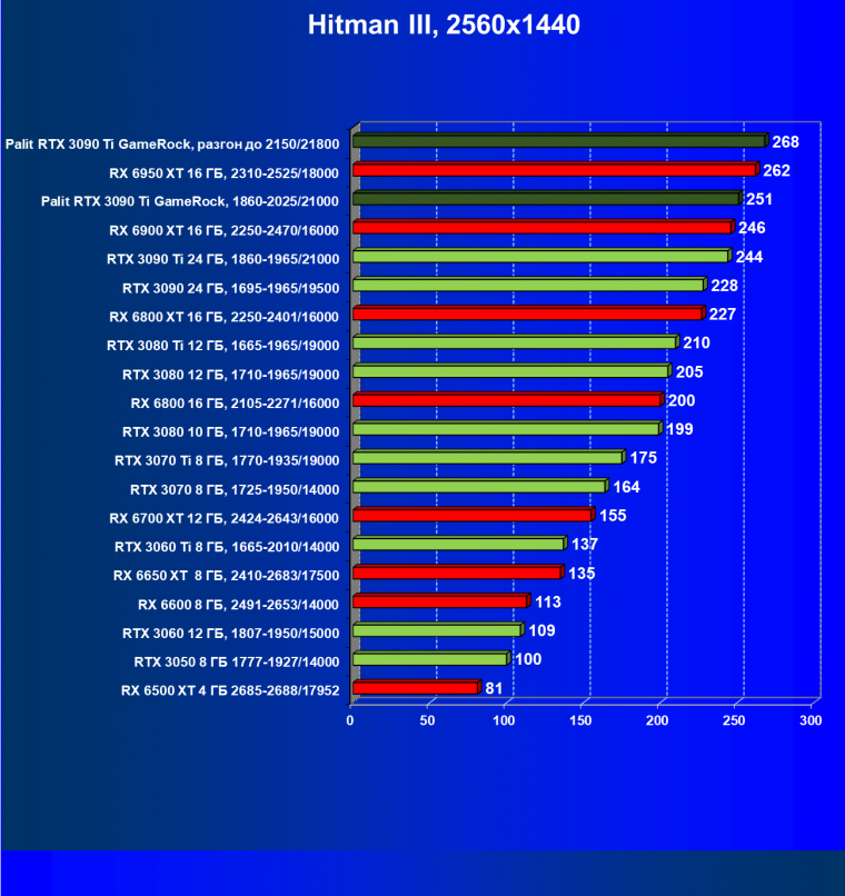 Все вышесказанное в отношении RTX 3090/3090 Ti справедливо и здесь. Однако уже снова видим, что из-за более драматичного падения производительности RX 6950 XT, несмотря на гораздо более низкую стоимость, все же уступил лидерство карте Palit.