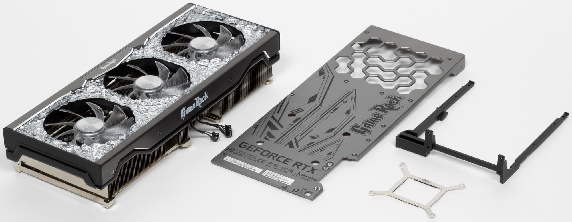 Такая подставка способна также поддерживать две карты, если они установлены в системном блоке. Для этого имеется особый кронштейн, надеваемый на опору. В целом идея отличная, ибо ранее просто бездумно комплектовали карты серии GameRock тем же акриловым кронштейном-подставкой, что и серию GamingPro. А тот кронштейн крепится под видеокартой, занимая два слота под ней. И если в случае GamingPro карты упираются в подставку просто кожухом, то карты GameRock должны были упираться той самой «хрустальной» отделкой с подсветкой, что как бы не способствовало целостности оной.