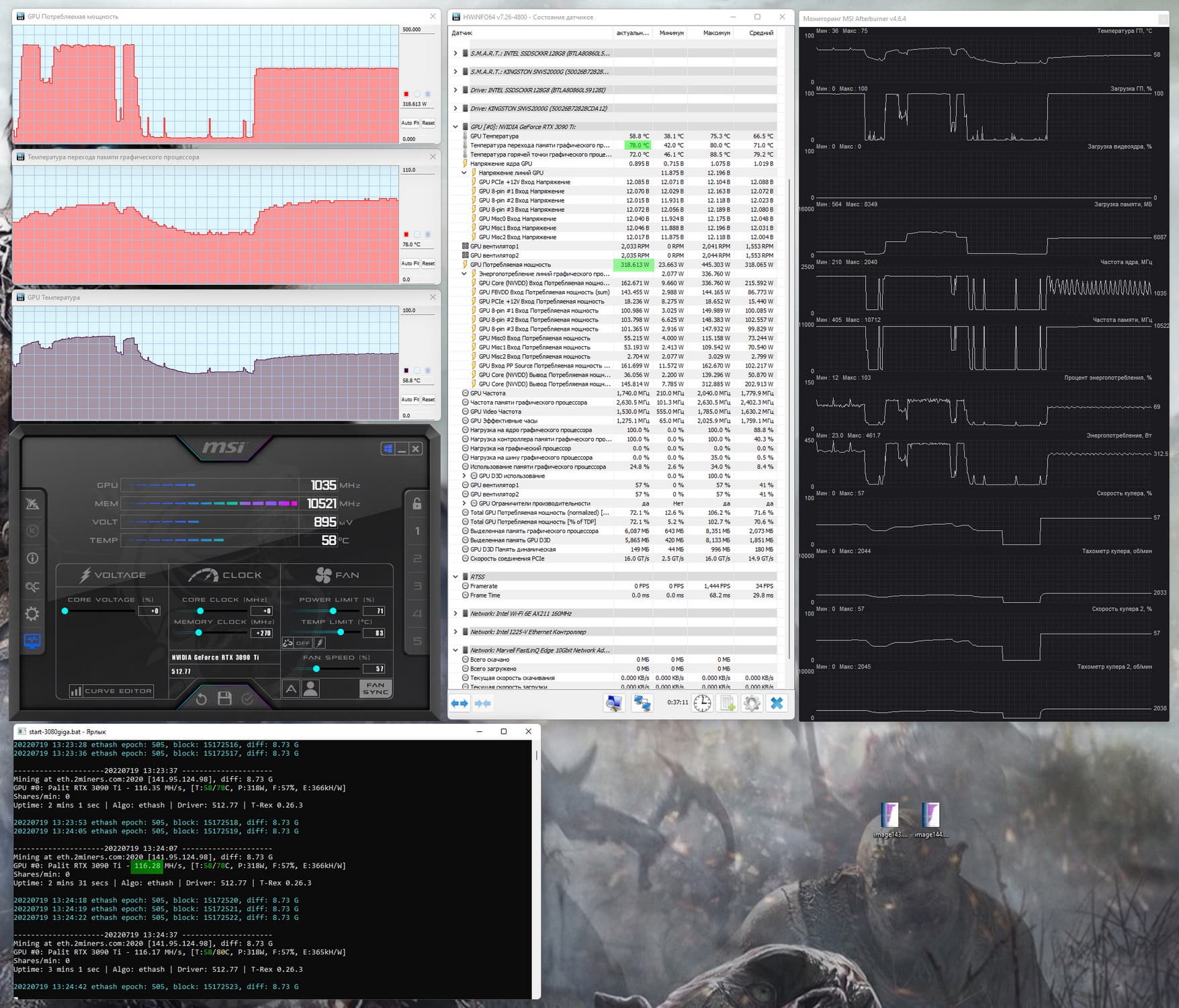 Как и RTX 3090, карты на базе RTX 3090 Ti не имеют защит от майнинга Ethereum. Разумеется, RTX 3090 Ti демонстрирует самый максимальный хэшрейт, из того что может выдать видеокарта. Правда на момент написания материала курс ETH катастрофически упал, а карты подобные 3090 Ti потребляют очень много (даже с оптимизациями), поэтому вряд ли сейчас имеет смысл рассматривать такие ускорители для майнинга.
