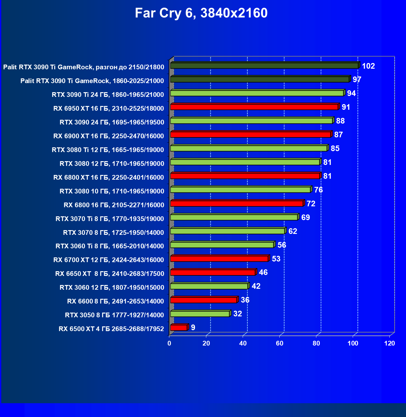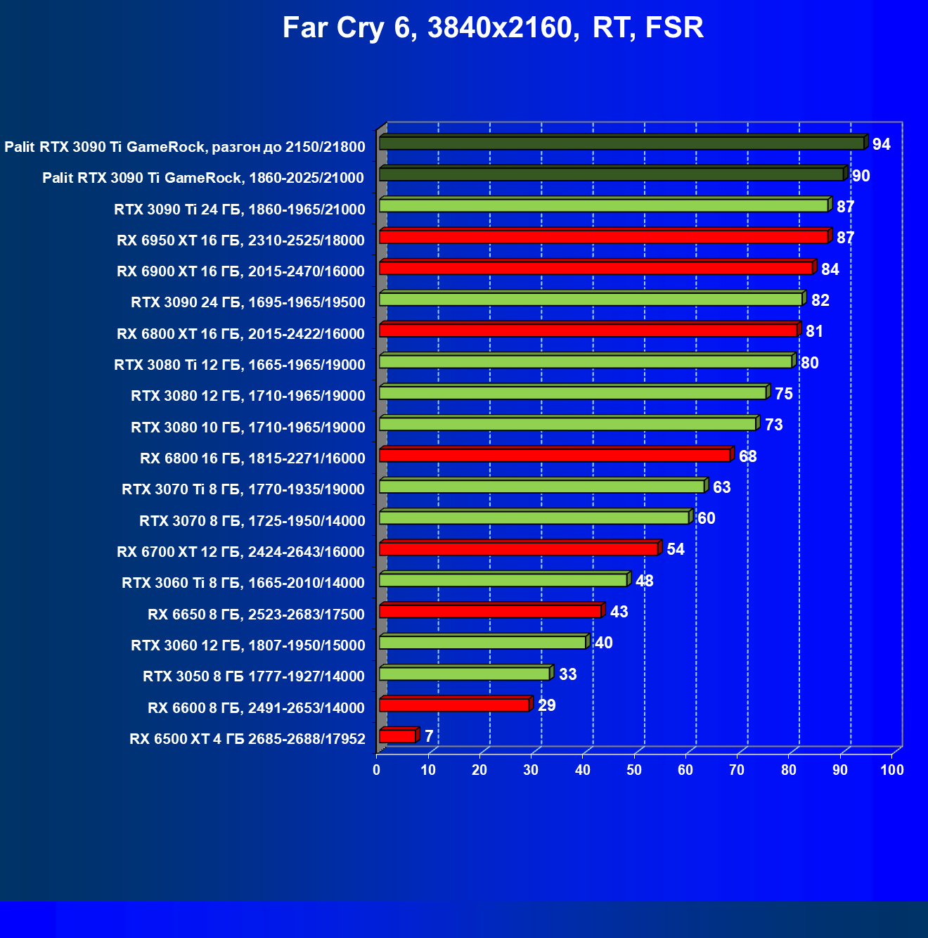 | 13 | RX 6900 XT 16 ГБ, 2250—2470/16000 | 91 | 834 | 92 000 |