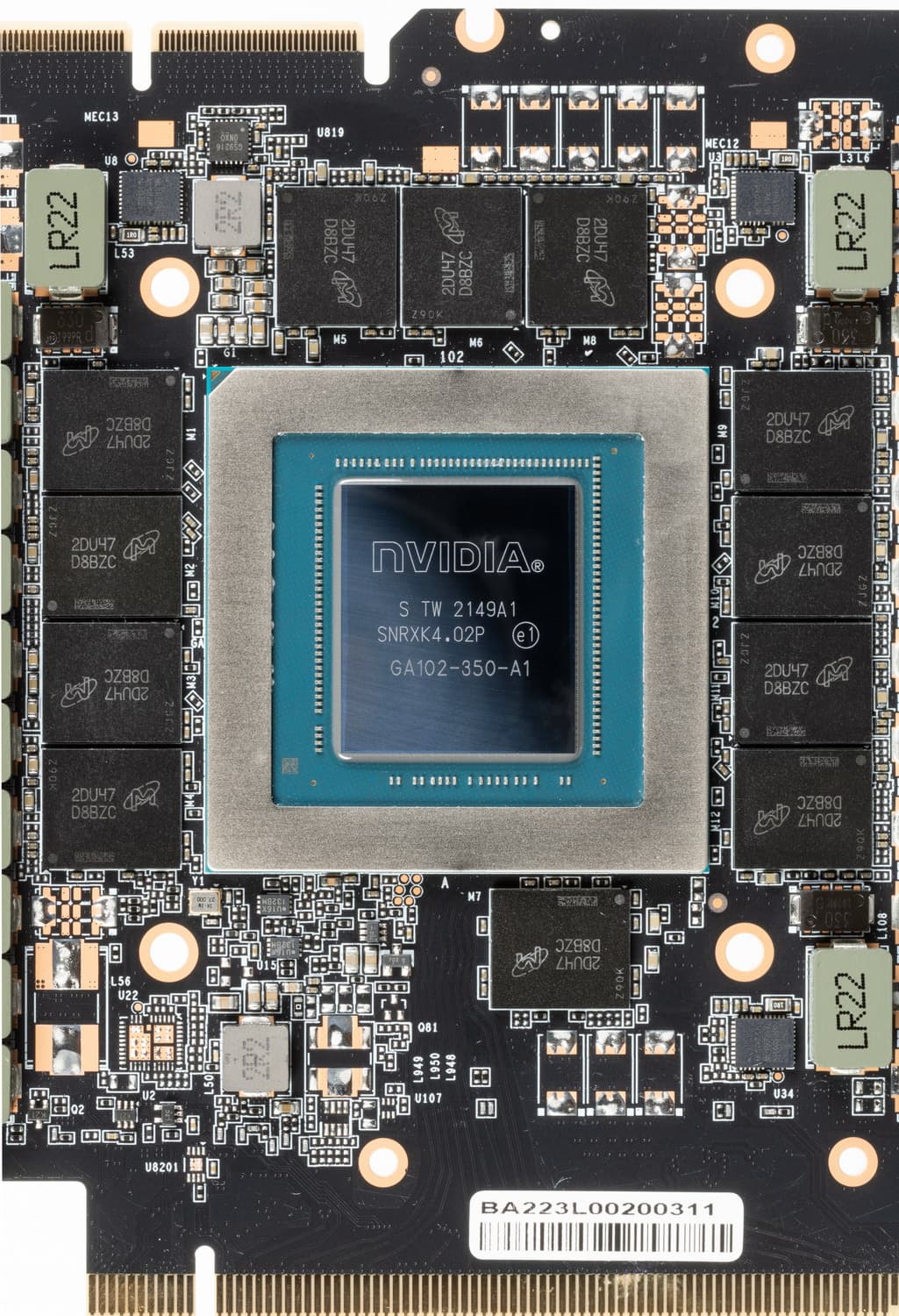Карта имеет 24 ГБ памяти GDDR6X SDRAM, размещенной в 12 микросхемах по 16 Гбит на лицевой стороне PCB. Микросхемы памяти Micron (GDDR6X, MT61K512M32KPA-21 / D8BZC) рассчитаны на номинальную частоту работы в 2625 (21000) МГц.