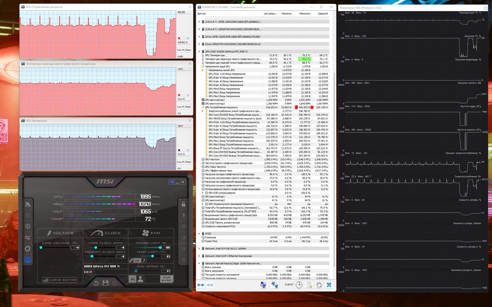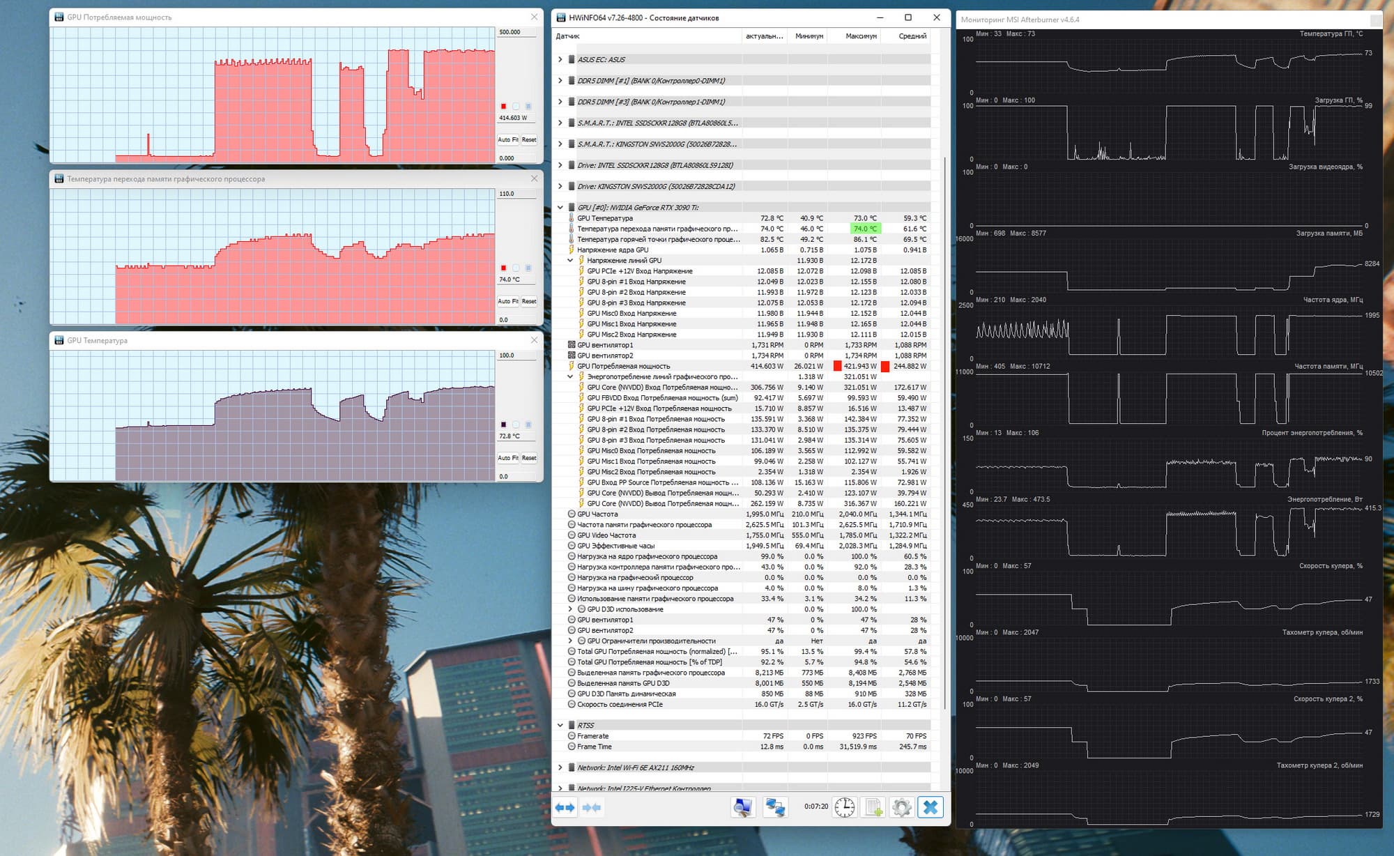 После 2-часового прогона под нагрузкой максимальная температура ядра не превысила 73 градусов, а температура микросхем памяти — 74 градусов, что является прекрасным результатом для видеокарт флагманского уровня. Энергопотребление карты доходило до 470 Вт (в пиковых случаях, в среднем не выше 422 МГц). Напомним, что безопасный предел нагрева памяти GDDR6X — 105 °C.