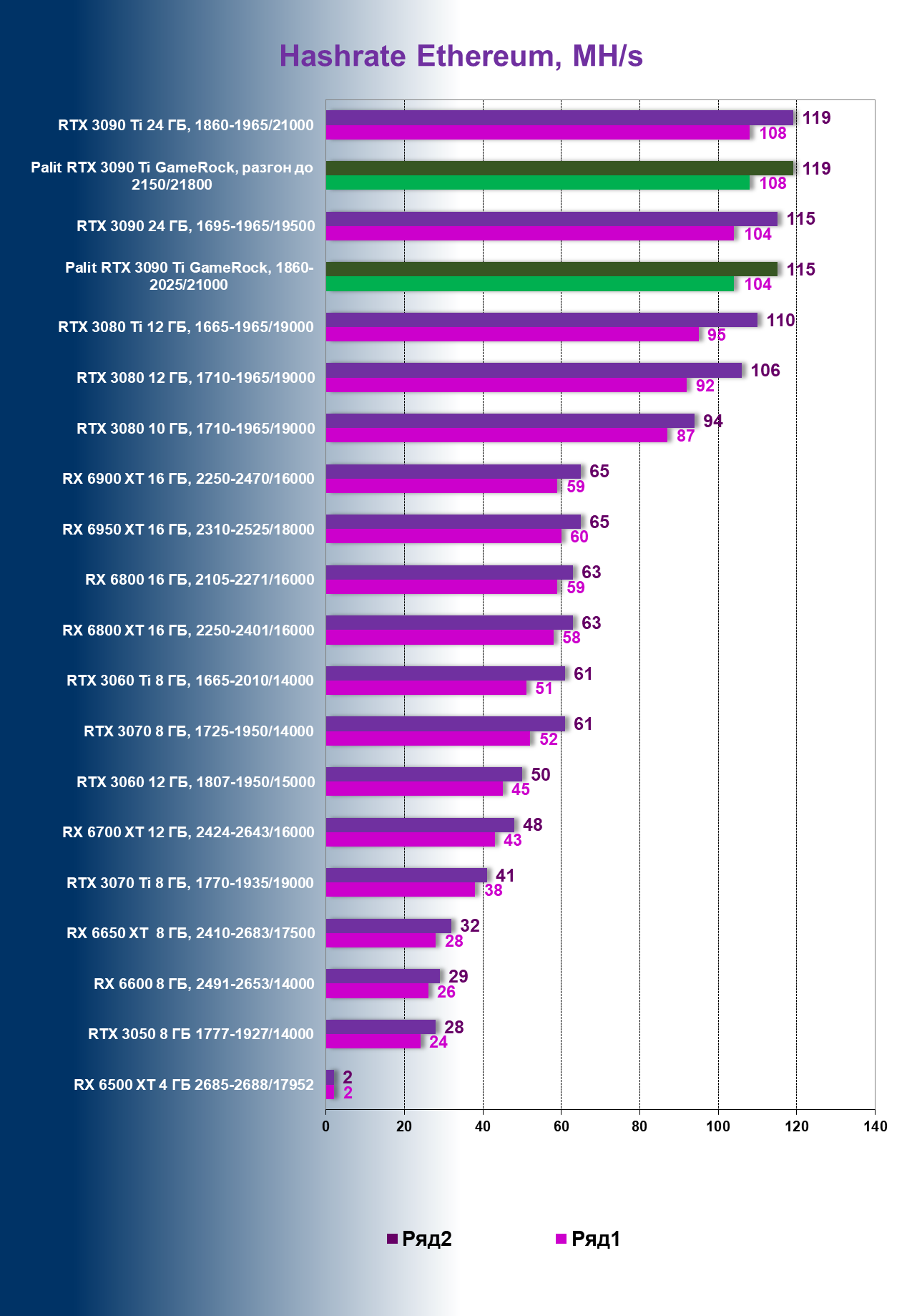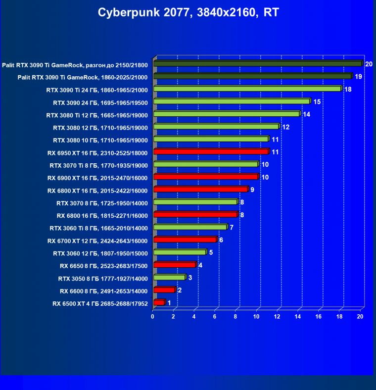| 16 | Palit RTX 3090 Ti GameRock, 1860—2025/21000 | 83 | 1222 | 147 000 |