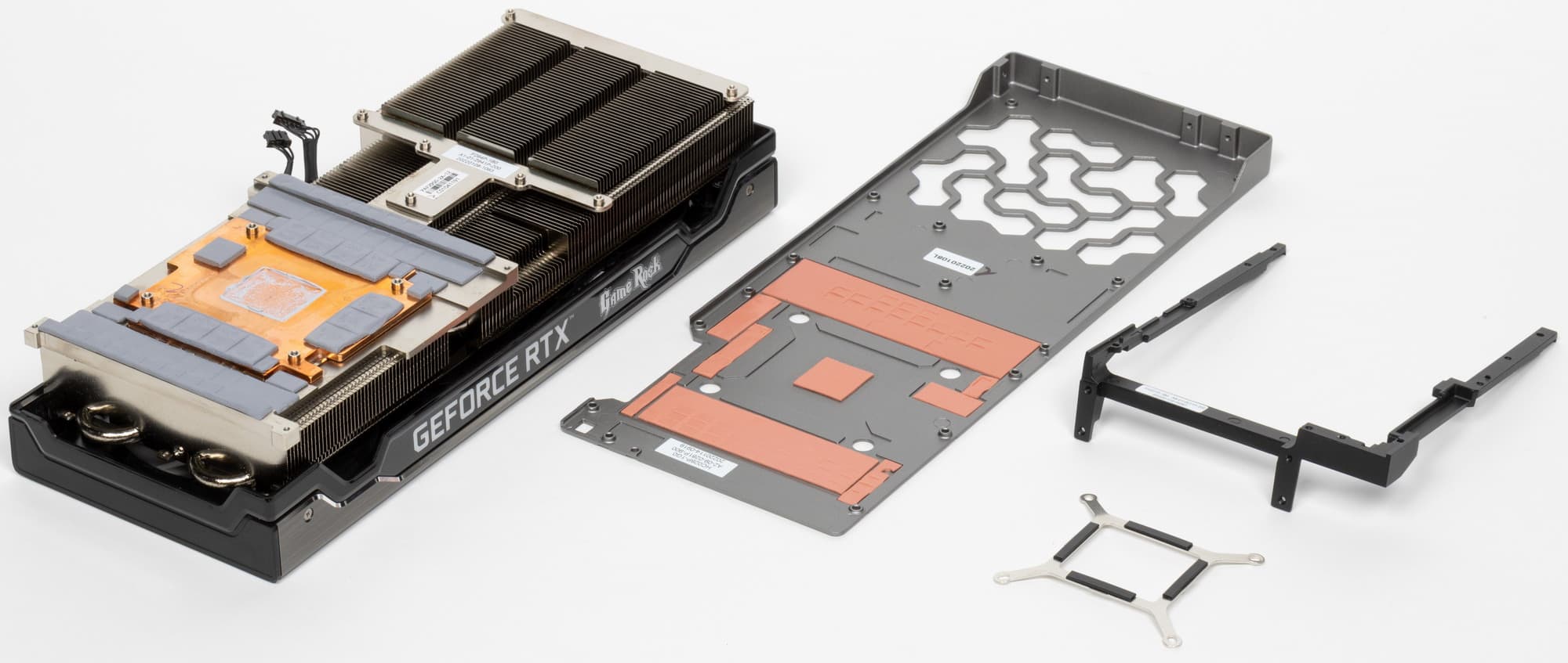 Задняя пластина также участвует в охлаждении оборотной стороны платы через термопрокладки, а также служит элементом защиты и усиления жесткости PCB. Концепция в целом предусматривает тройную защиту печатной платы от любых повреждений и изгибов: кроме задней пластины имеется еще и черная рама, связывающая первую с радиатором охлаждения, а также с крепежной планкой, создавая этакий монолит вокруг PCB.