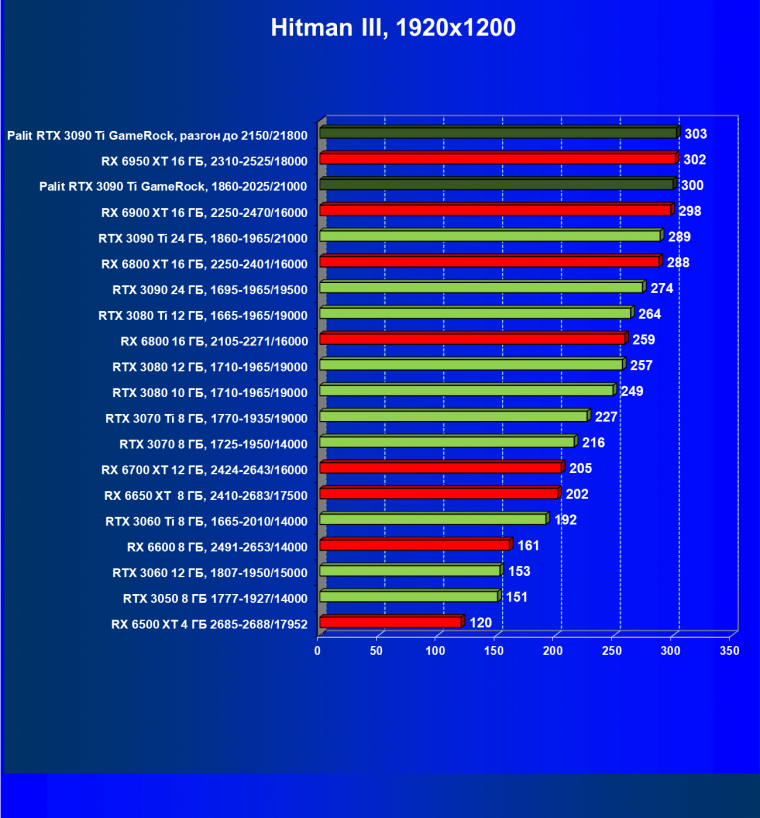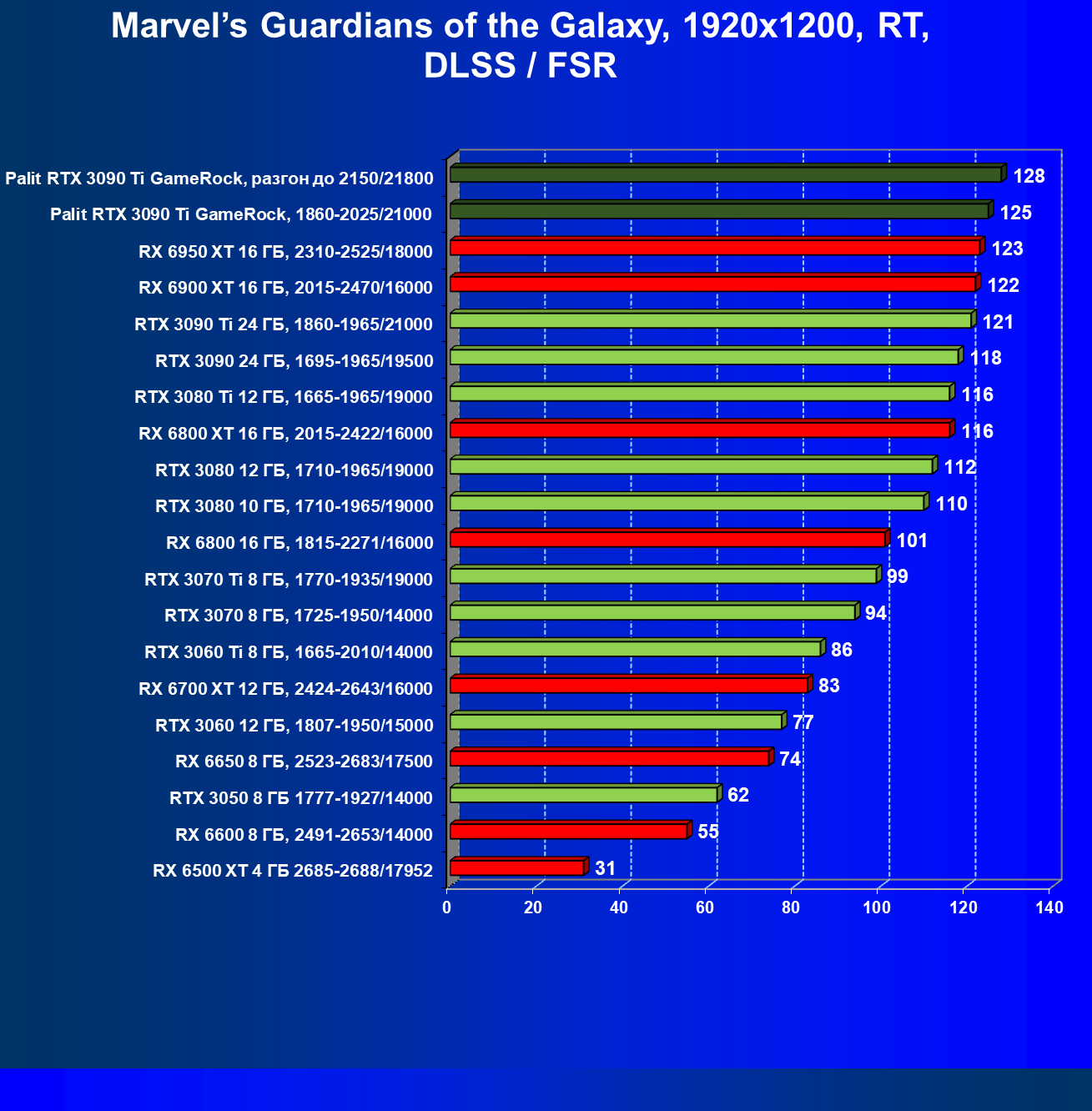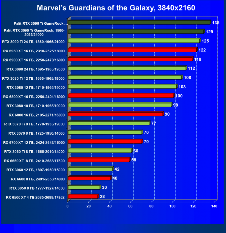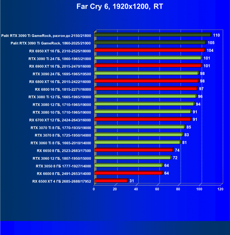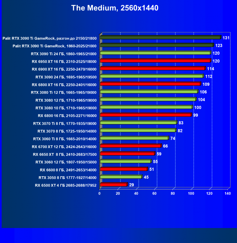 Как ранее мы уже отмечали: лидер есть лидер во всех отношениях, причем повышенные частоты работы карты позволили ей обойти флагмана AMD — Radeon RX 6950 XT.