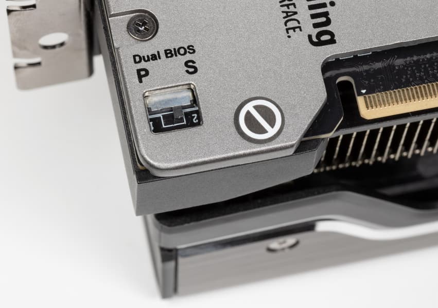 Карта имеет два режима работы, они заложены в двух вариантах BIOS, которые переключаются с помощью переключателя на верхнем торце карты: P (performance / производительный, он же 1) и S (silent / тихий, он же 2). Разница между режимами заключается не только в оборотах вентиляторов, но и максимальные частоты у GPU разные. При этом пик энергопотребления в обоих режимах заложен в 450 Вт.
