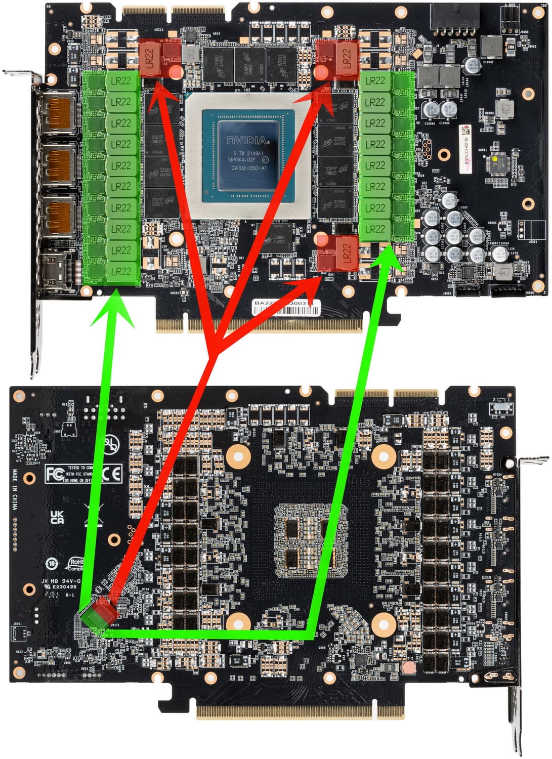 Итак, распределение фаз такое: у GeForce RTX 3090 Ti FE и карты Palit — 18 фаз на ядро и 3 на микросхемы памяти.