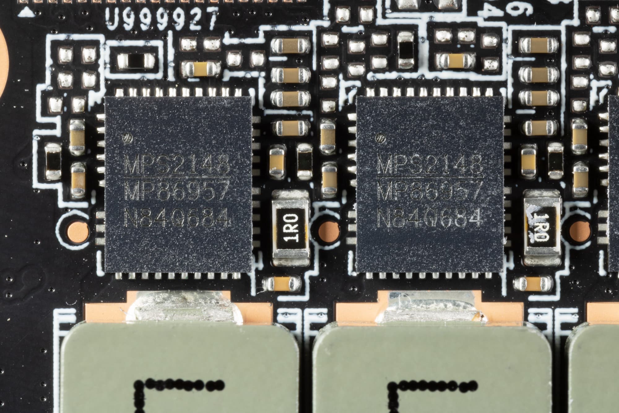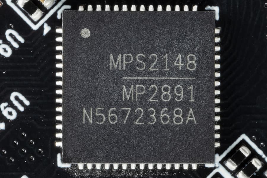 В преобразователе питания, традиционно для всех видеокарт Nvidia, используются транзисторные сборки DrMOS — в данном случае MP86957 (Monolithic Power Systems), каждая из которых рассчитана максимально на 70 А.