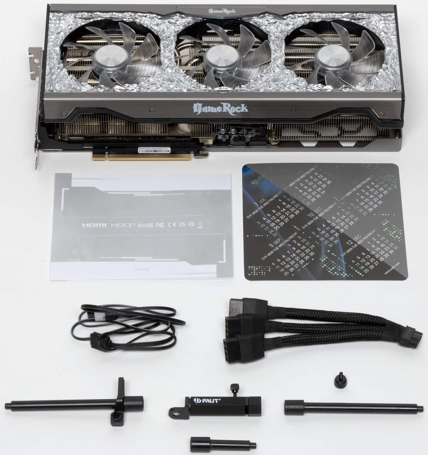 Кроме традиционного краткого руководства пользователя, он включает календарь на этот год (уже пора бы комплектовать аналогичным на 2023 год), разборную металлическую подставку-штатив под карту, адаптер-переходник питания с 12-контактов на три по 8, кабель синхронизации подсветки.