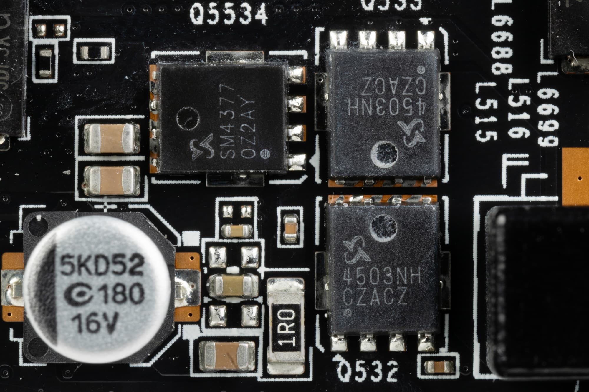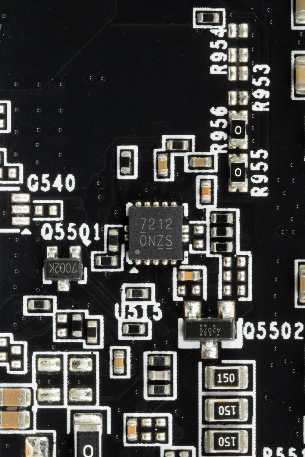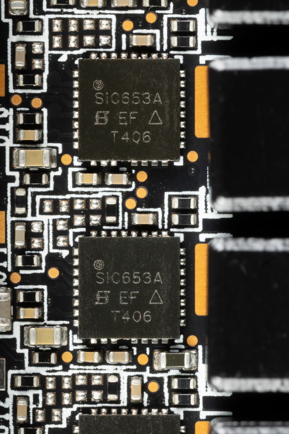 В преобразователе питания ядра используются транзисторные сборки DrMOS — в данном случае SiC653A (Vishay), каждая из которых рассчитана максимально на 50 А.