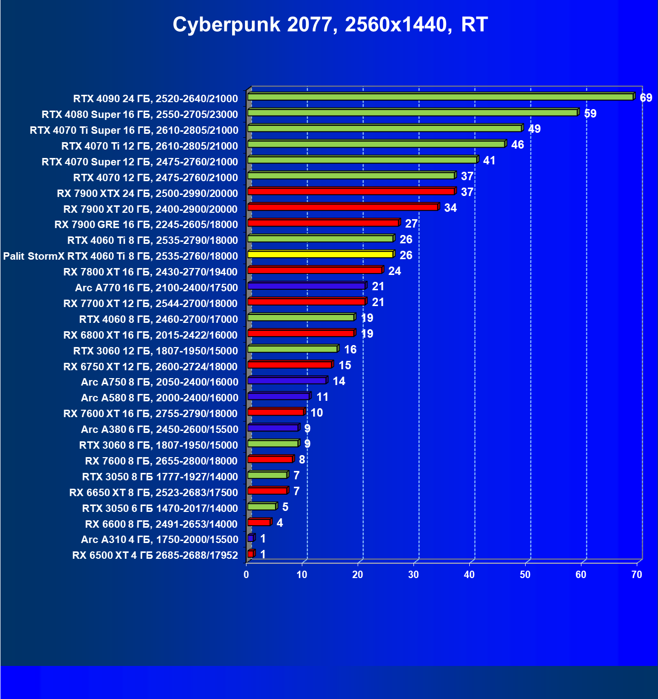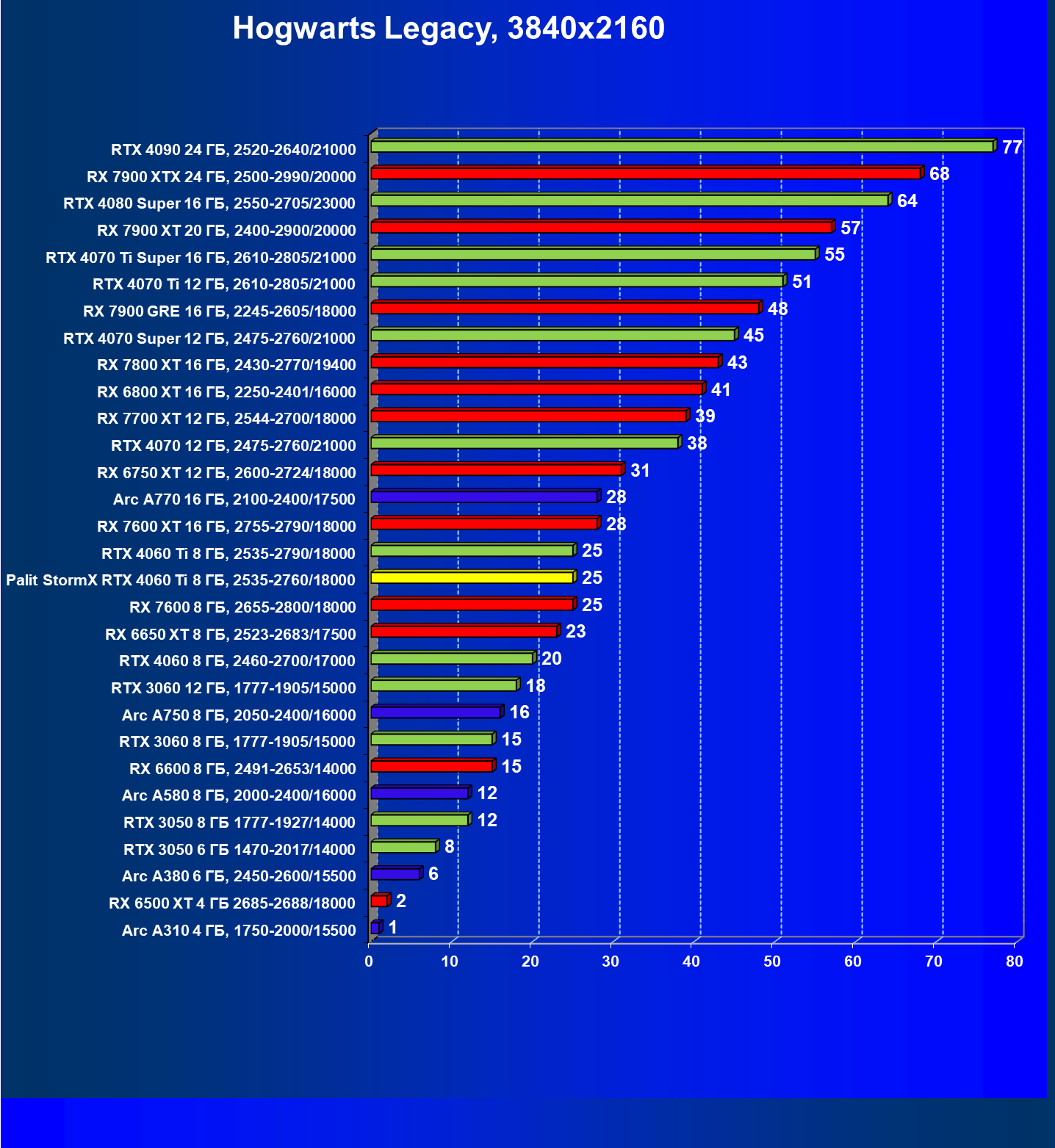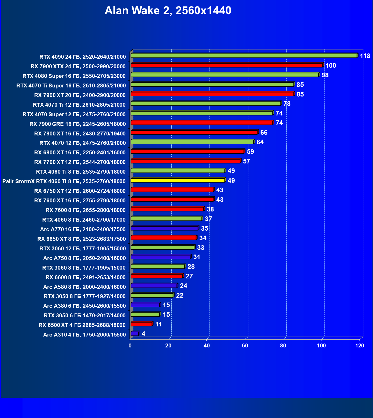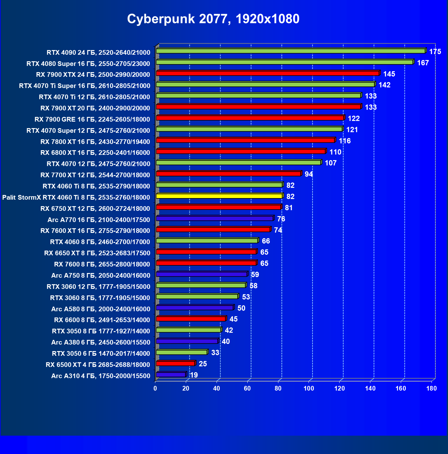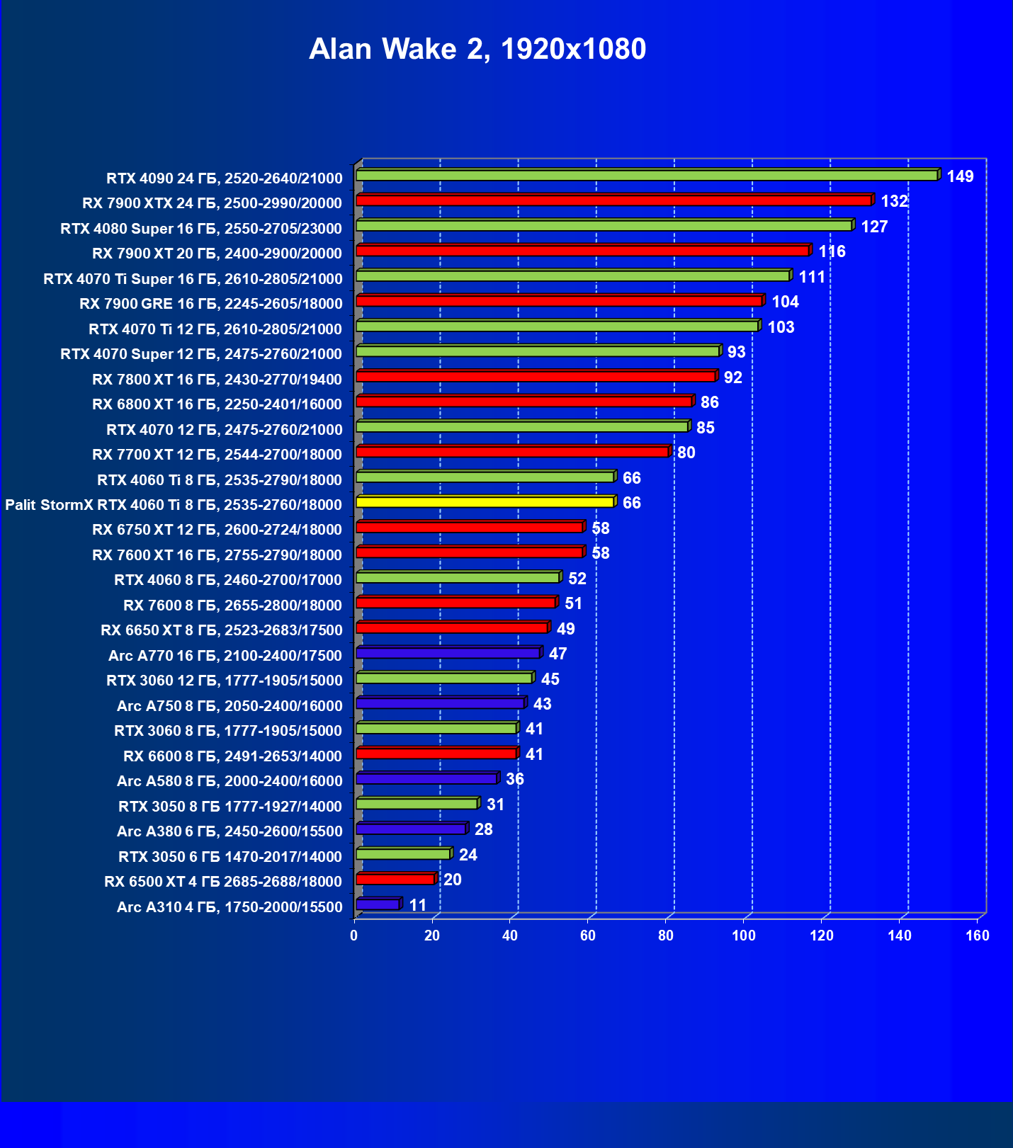 В классических играх без трассировки лучей GeForce RTX 4060 Ti оказался в своей группе на третьем месте (карта Palit не отличается от референсной), уступив Radeon RX 7700 XT и Radeon RX 6750 XT (но они и дороже).