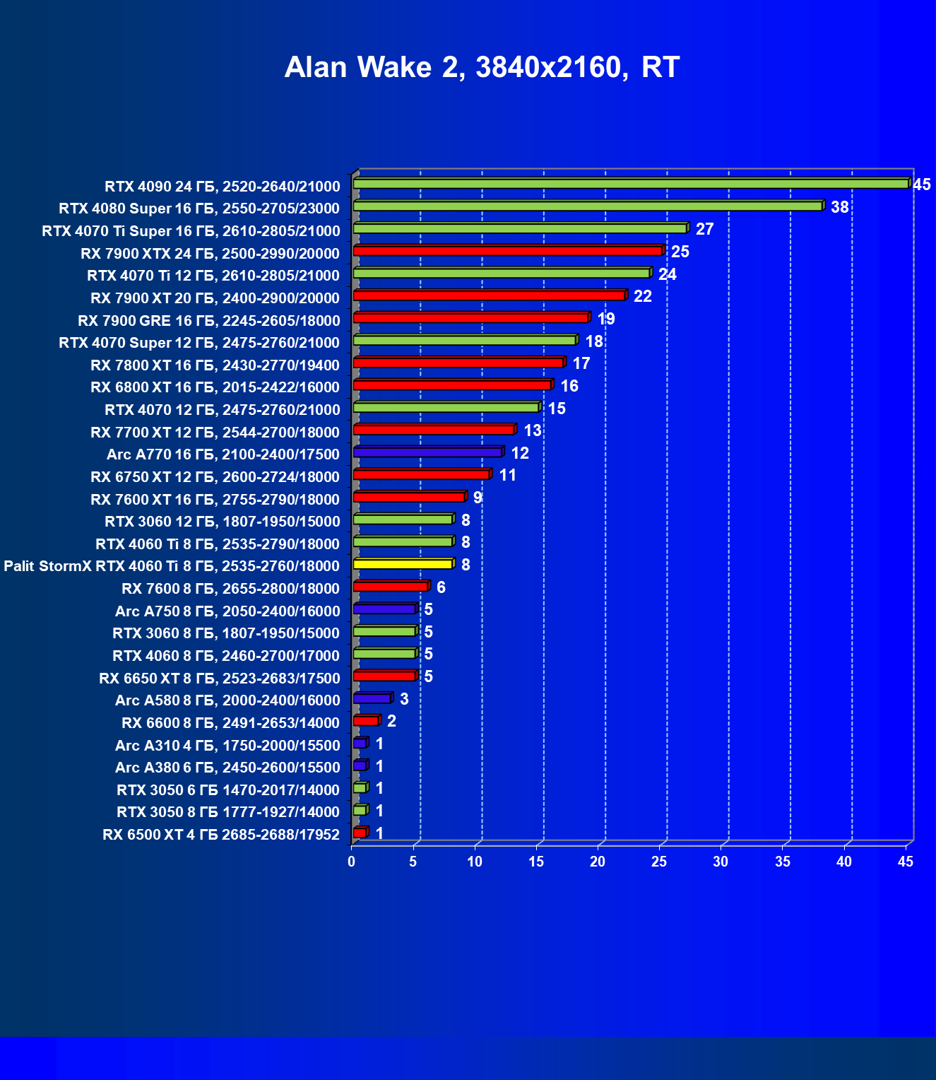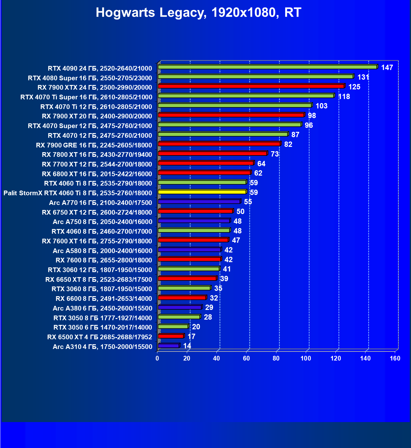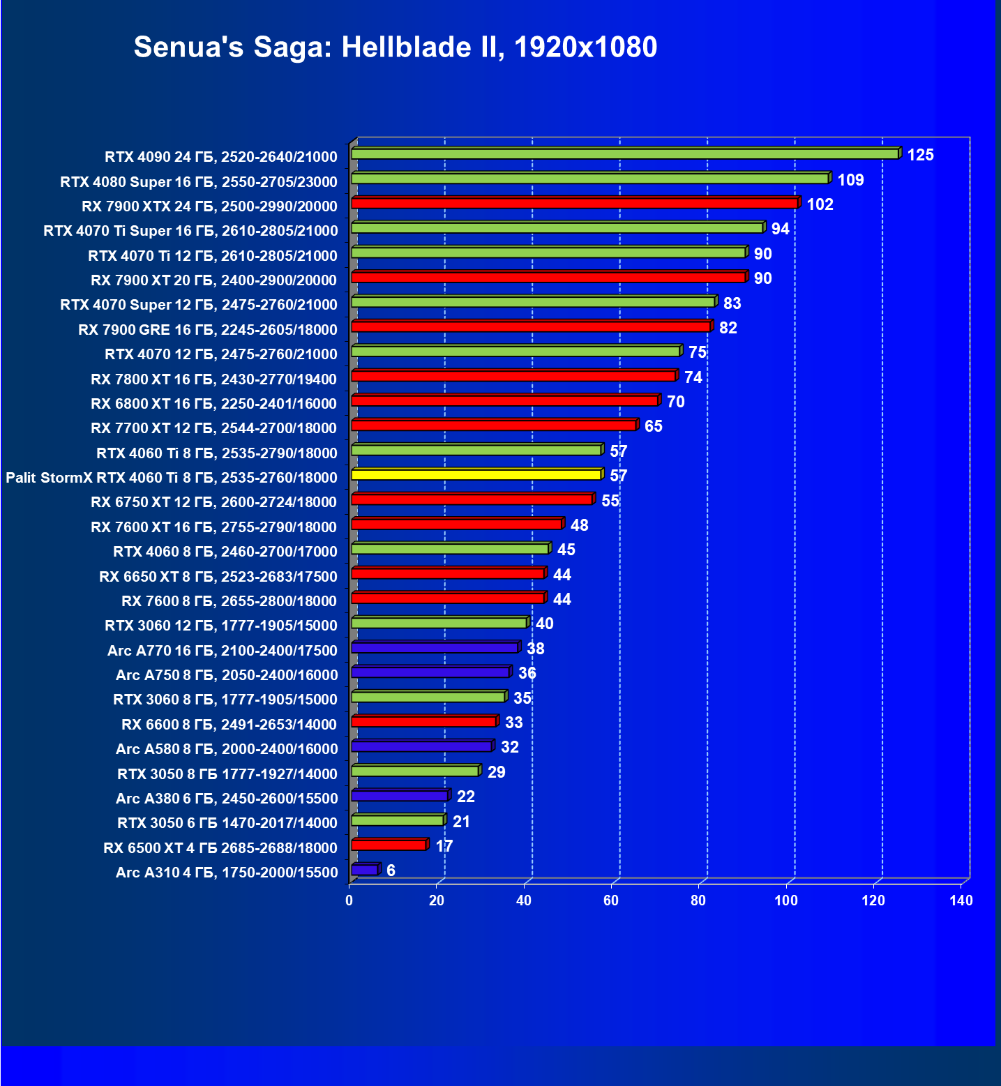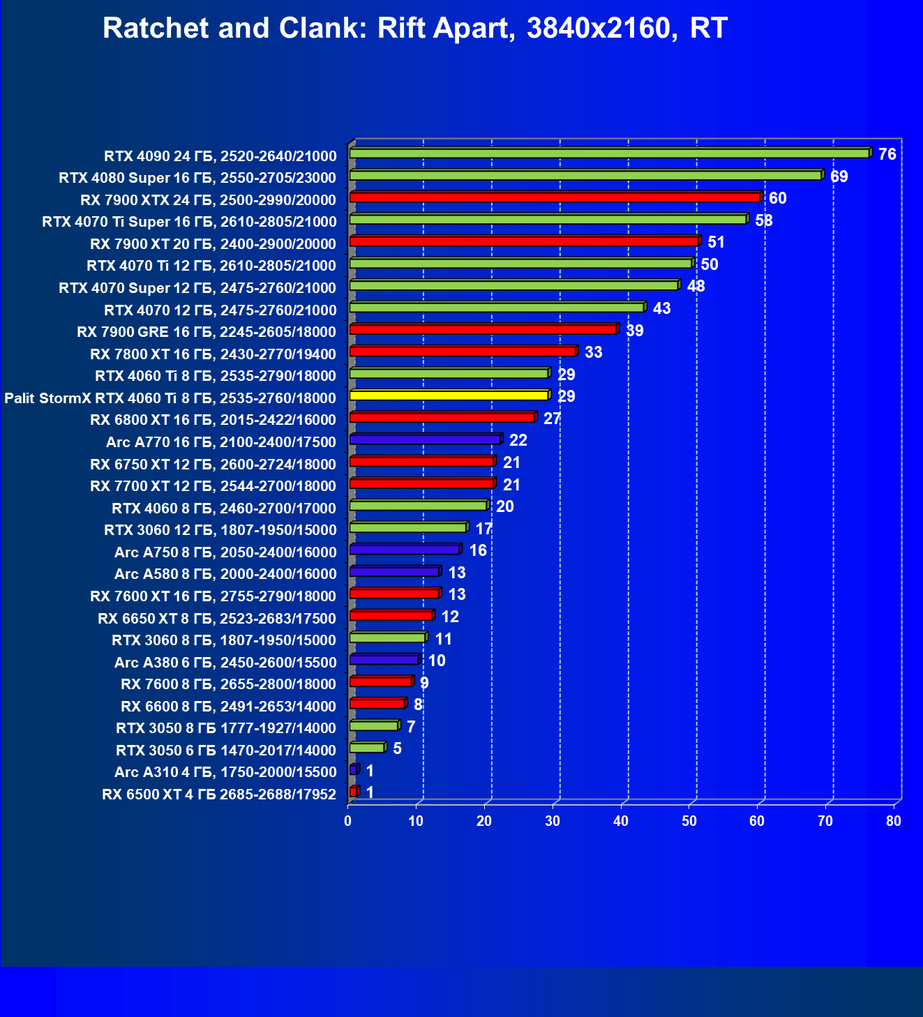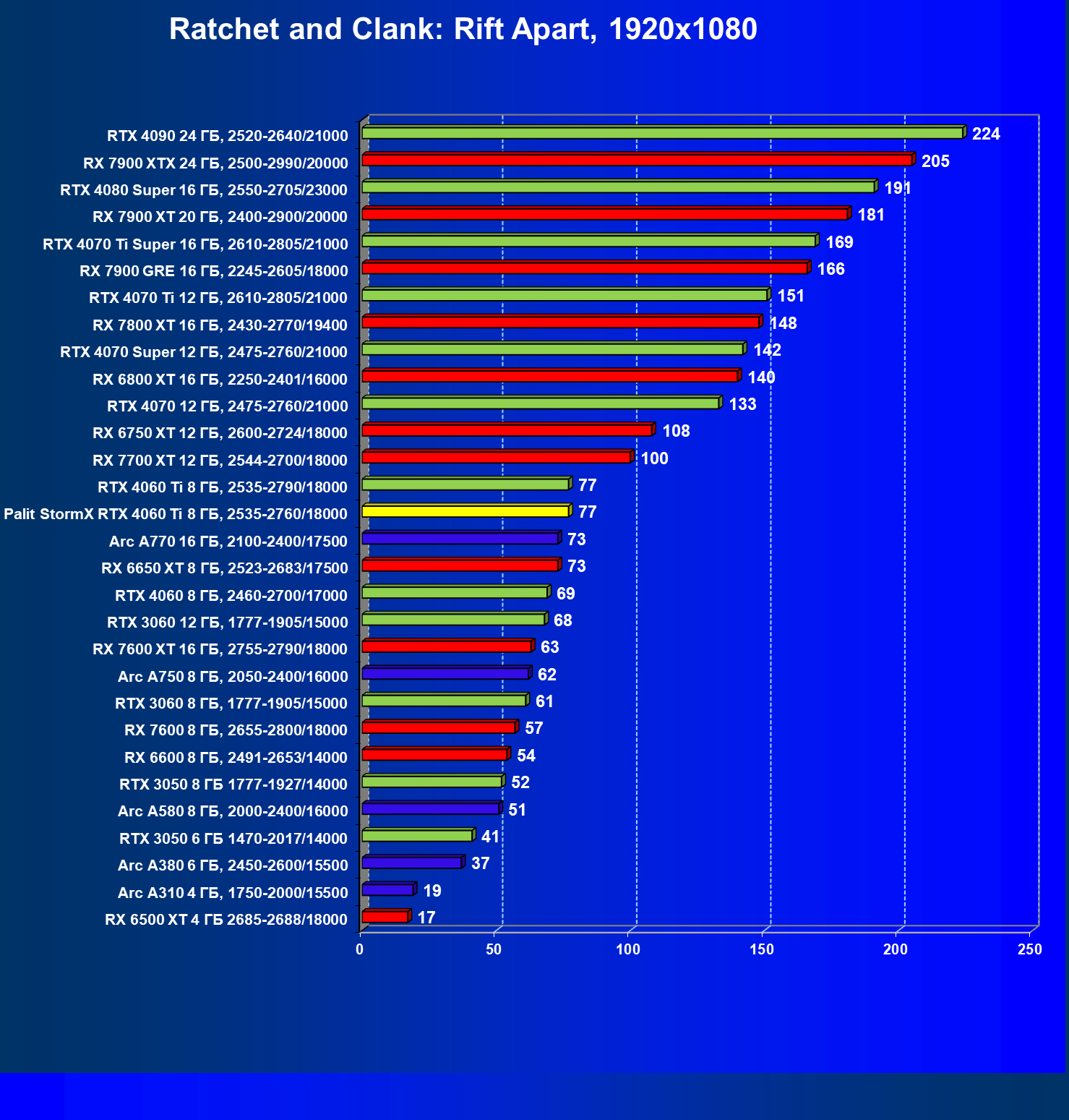 В классических играх без трассировки лучей GeForce RTX 4060 Ti оказался в своей группе на третьем месте (карта Palit не отличается от референсной), уступив Radeon RX 7700 XT и Radeon RX 6750 XT (но они и дороже).