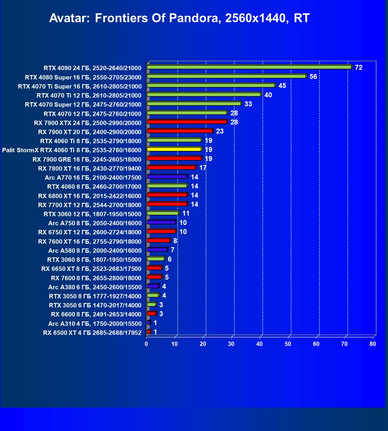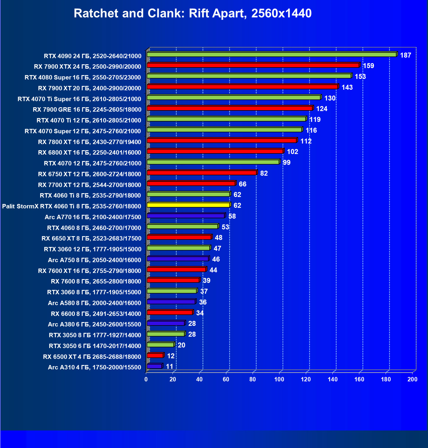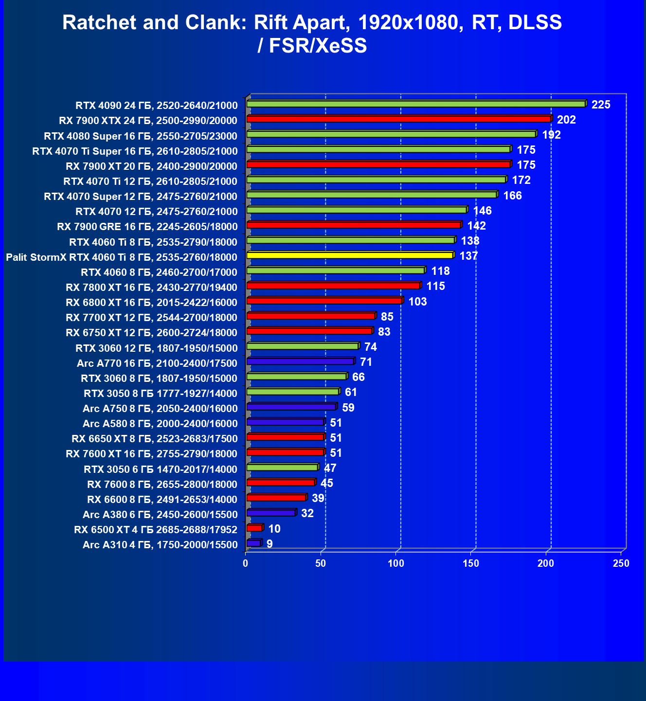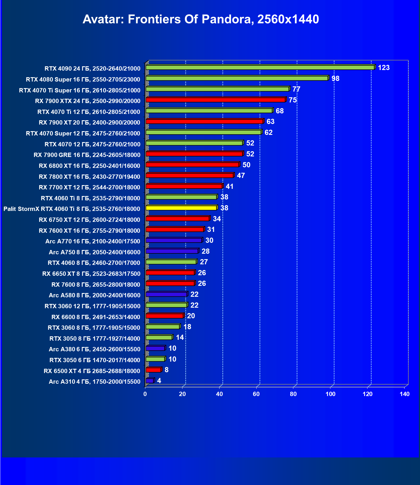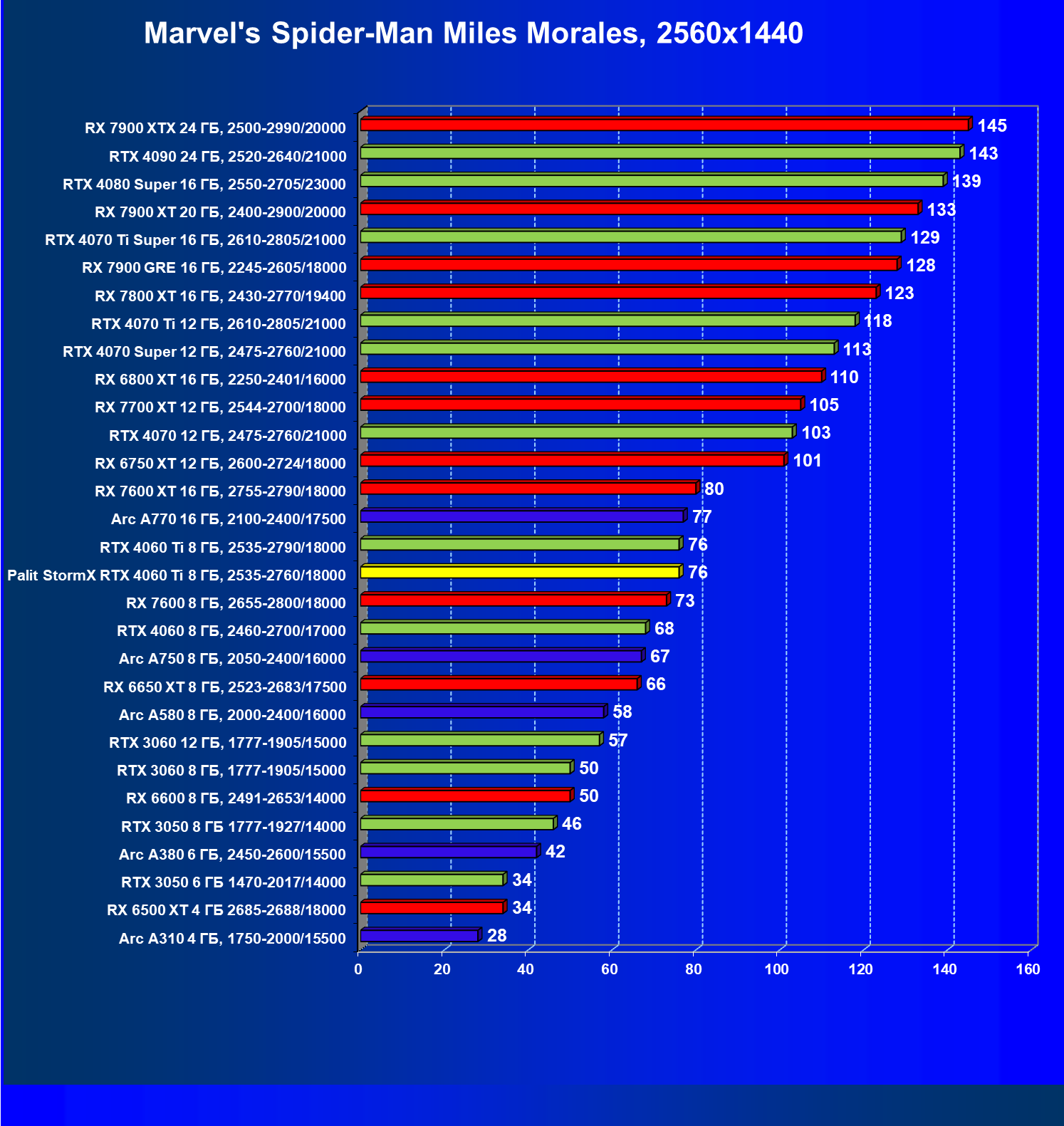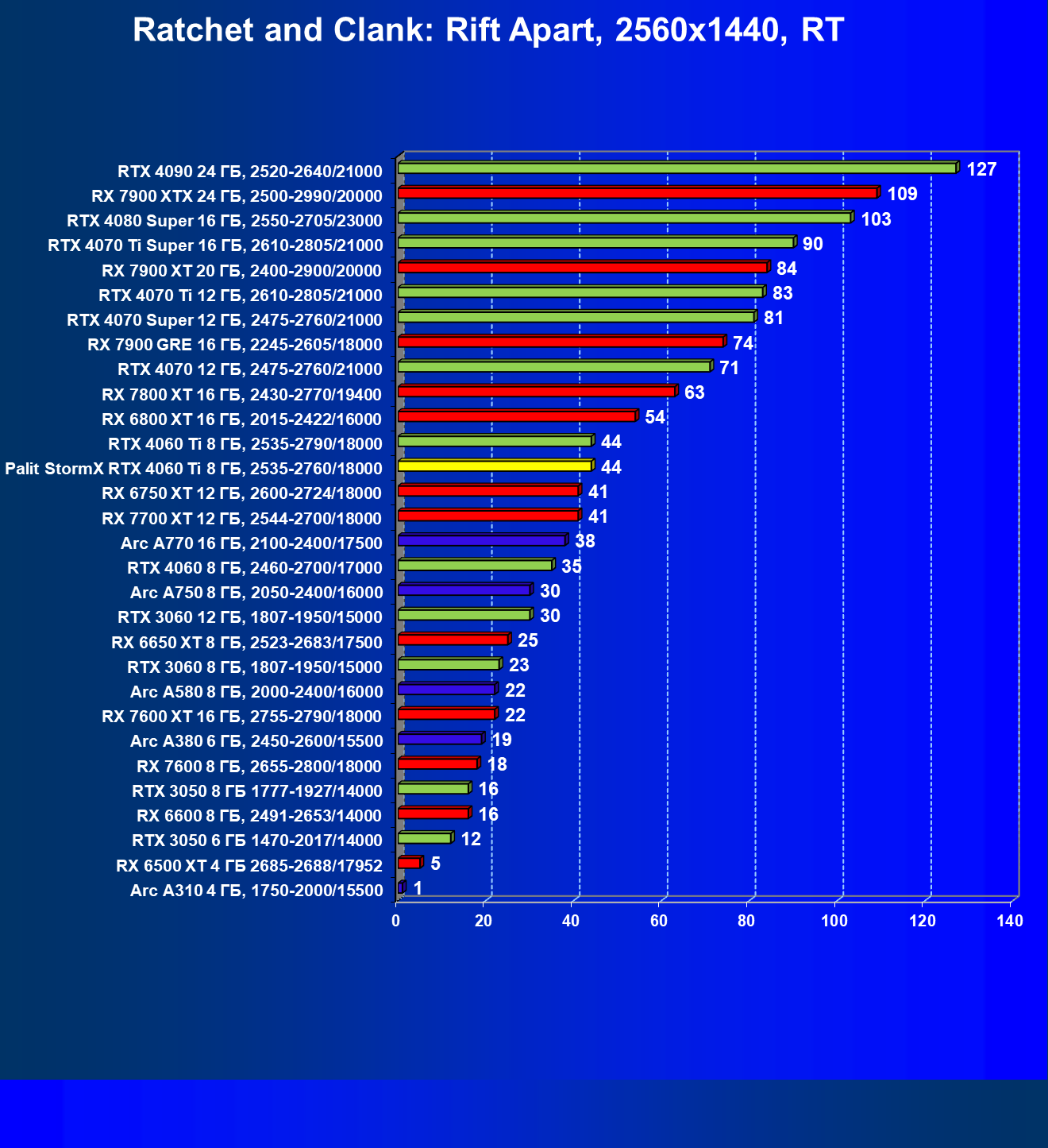 В классических играх без трассировки лучей GeForce RTX 4060 Ti оказался в своей группе на третьем месте (карта Palit не отличается от референсной), уступив Radeon RX 7700 XT и Radeon RX 6750 XT (но они и дороже).
