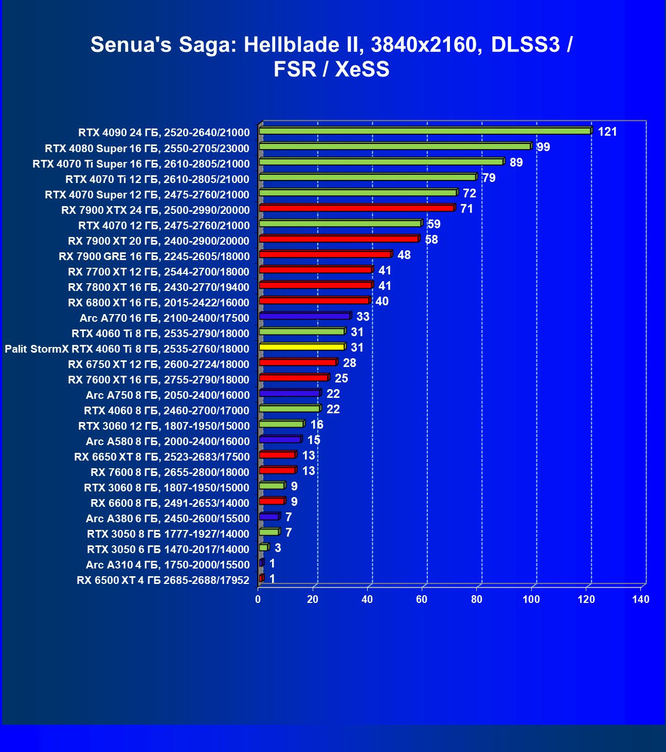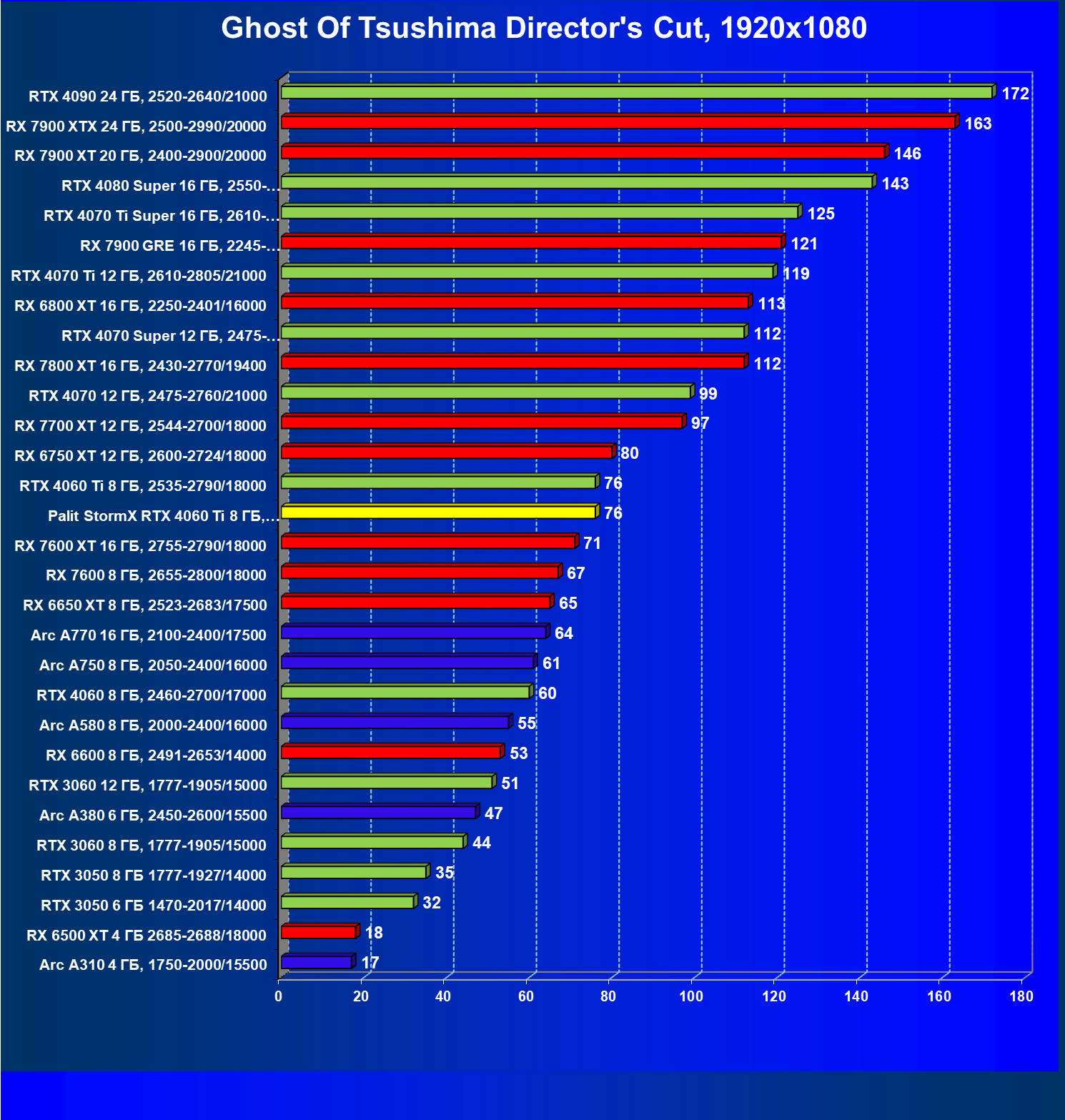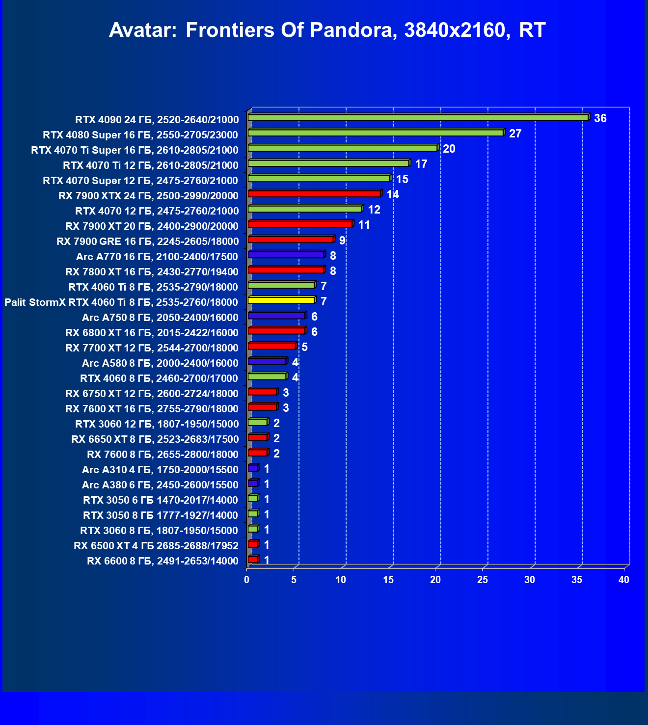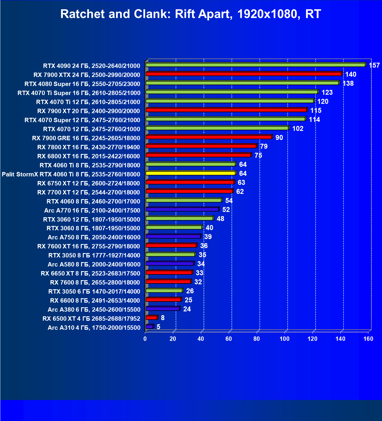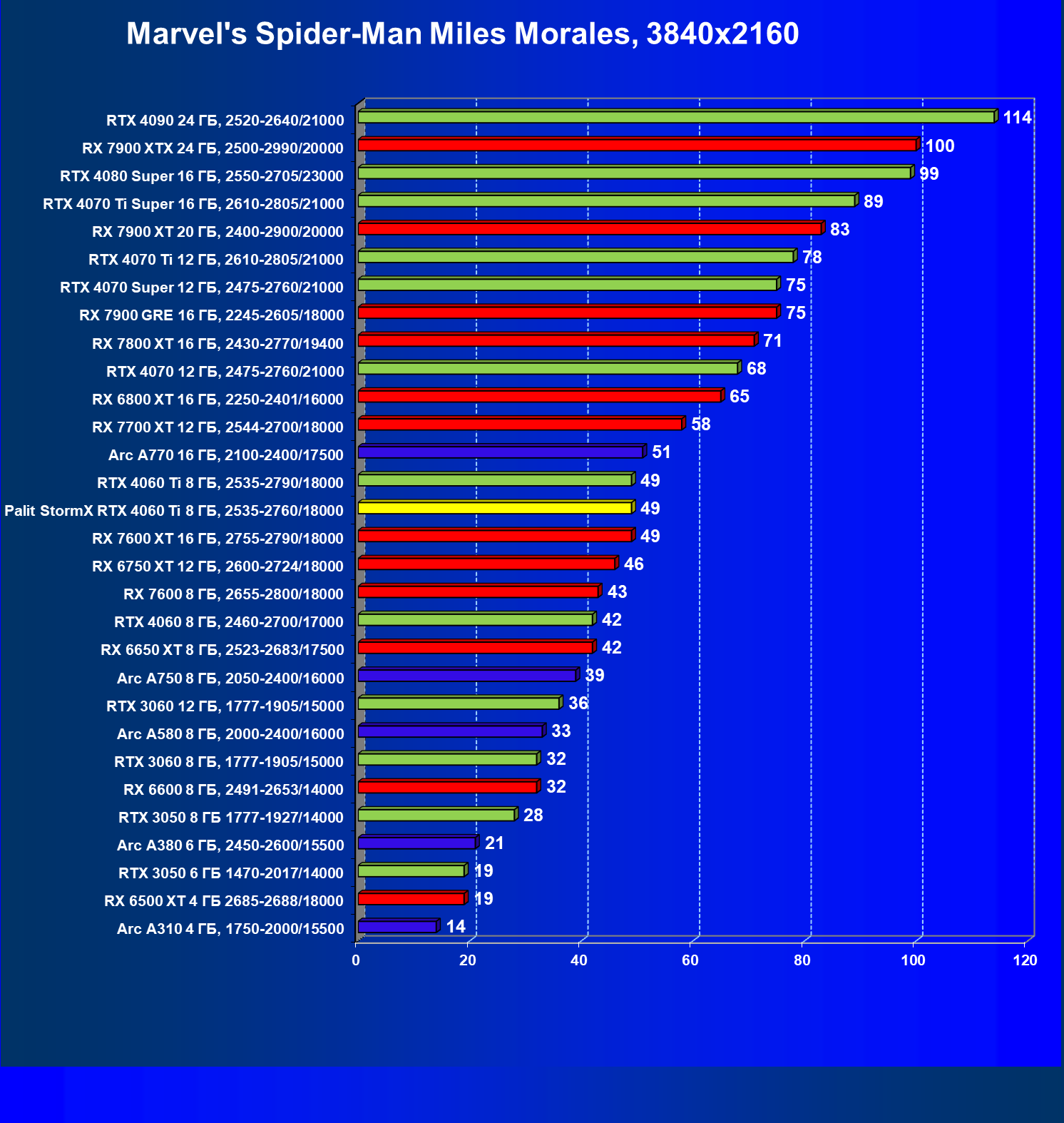 В классических играх без трассировки лучей GeForce RTX 4060 Ti оказался в своей группе на третьем месте (карта Palit не отличается от референсной), уступив Radeon RX 7700 XT и Radeon RX 6750 XT (но они и дороже).