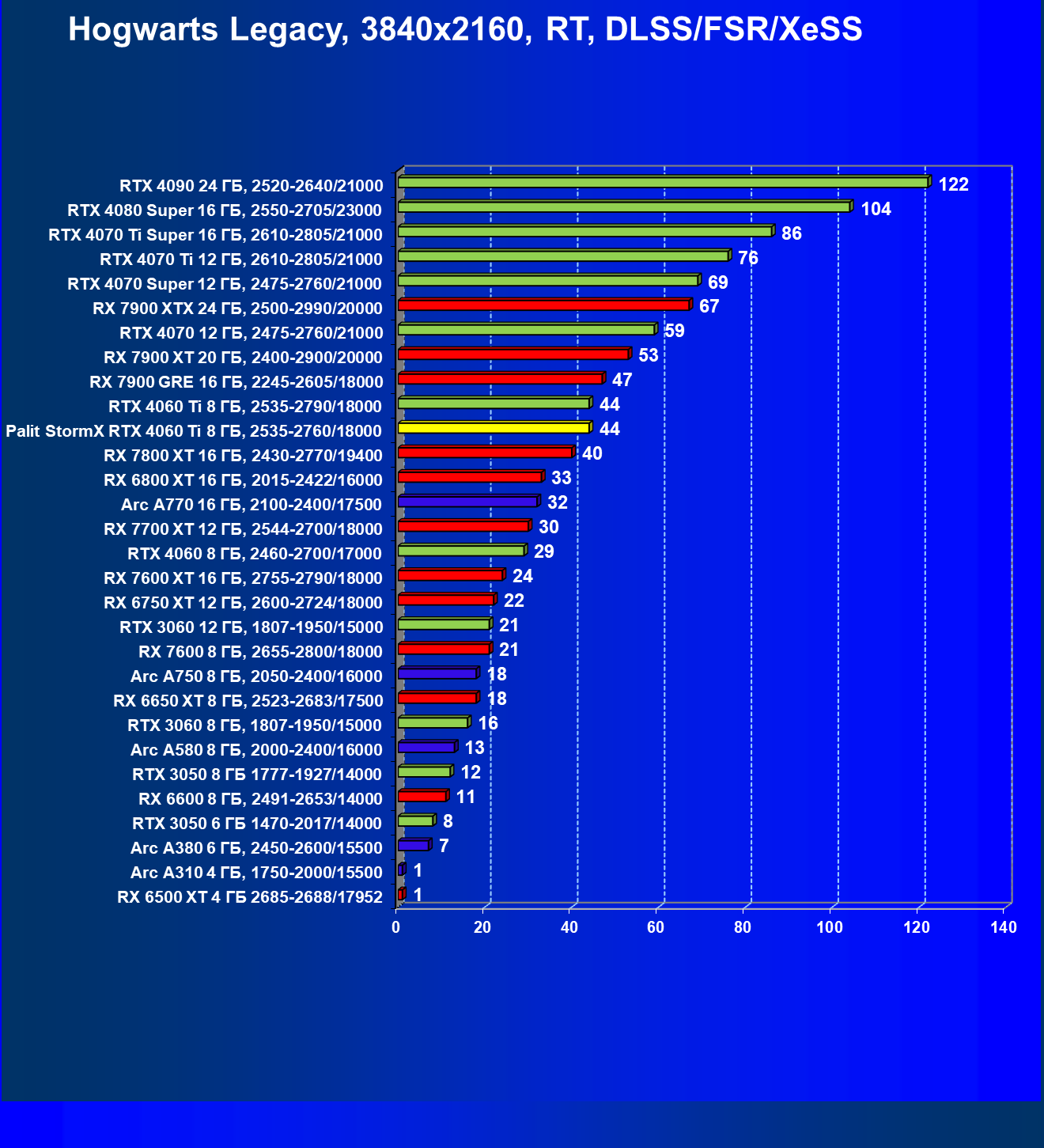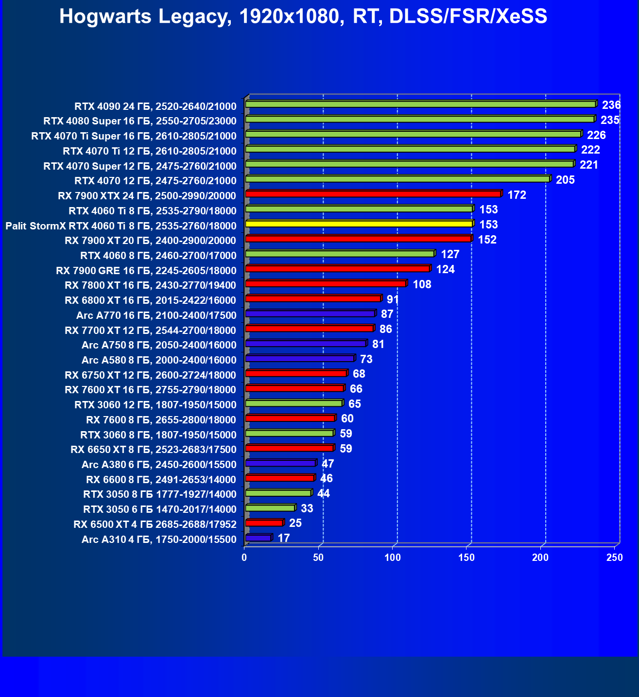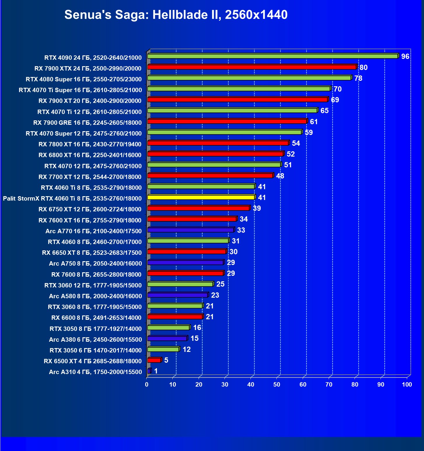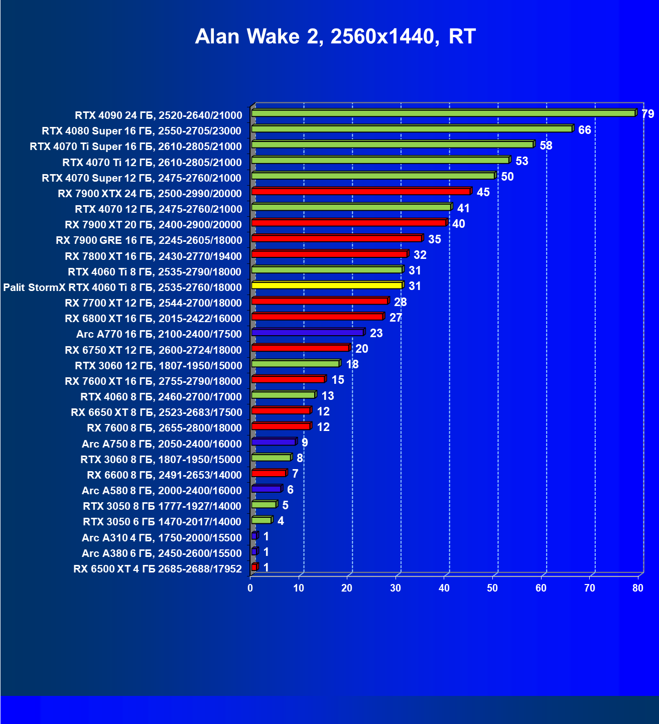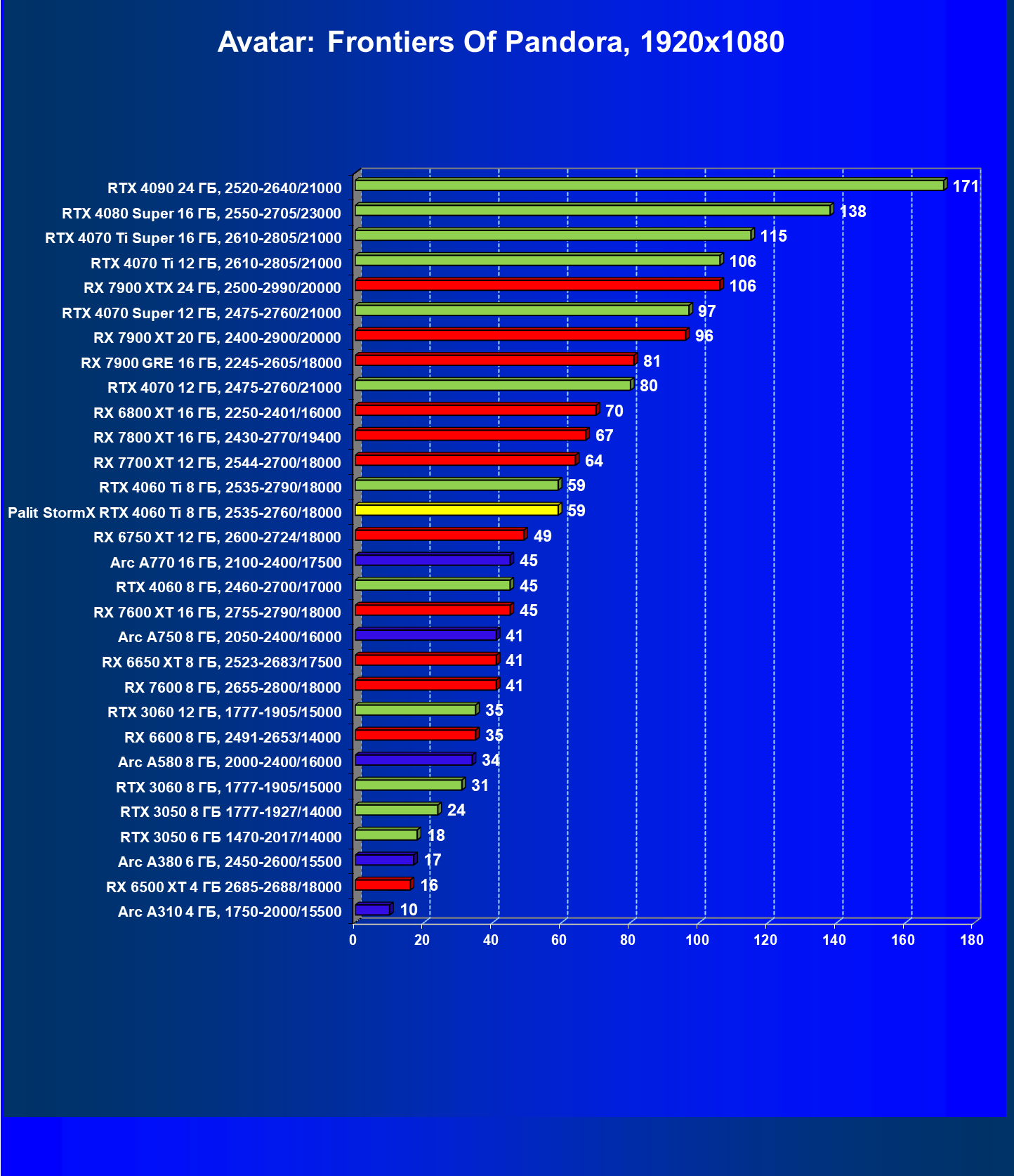 В классических играх без трассировки лучей GeForce RTX 4060 Ti оказался в своей группе на третьем месте (карта Palit не отличается от референсной), уступив Radeon RX 7700 XT и Radeon RX 6750 XT (но они и дороже).