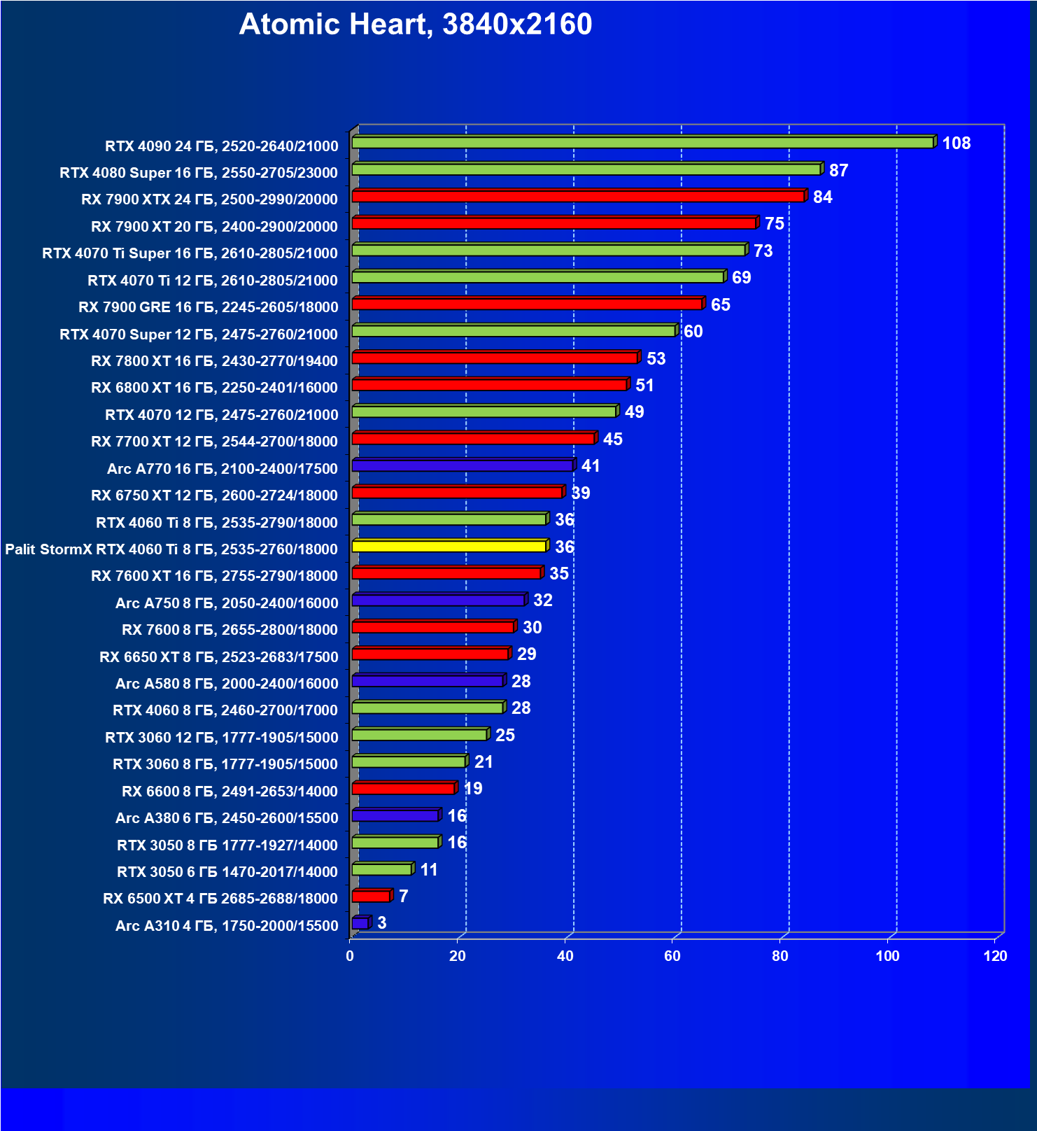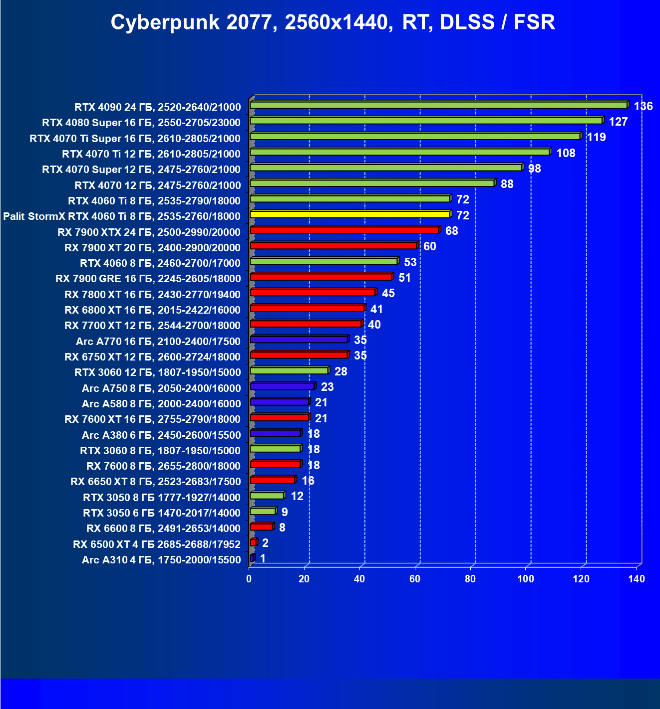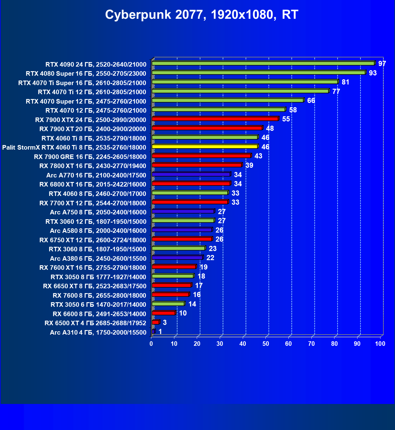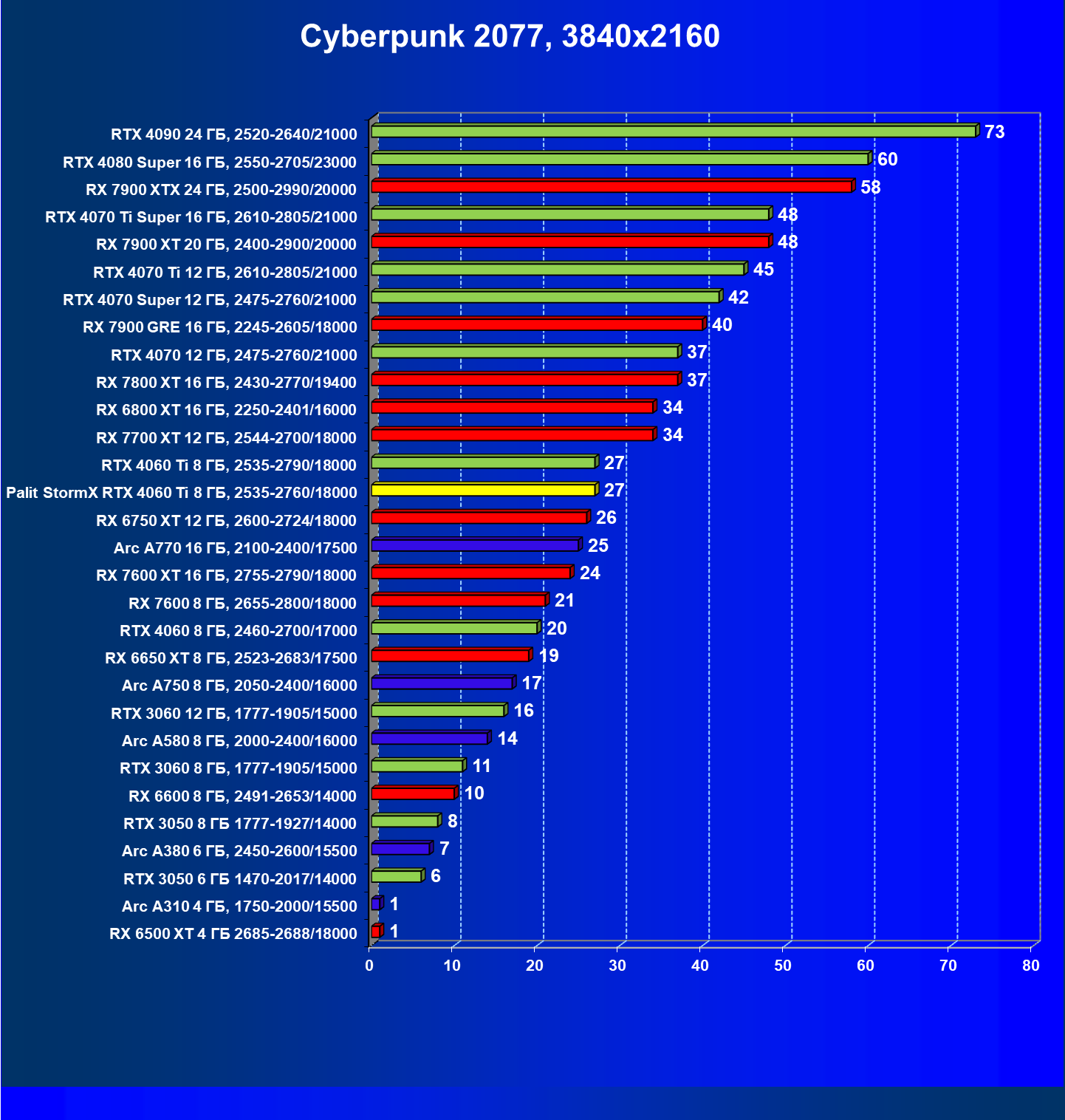 | 11 | Palit StormX RTX 4060 Ti 8 ГБ, 2535—2760/18000 | 1739 | 458 | 38 000 |