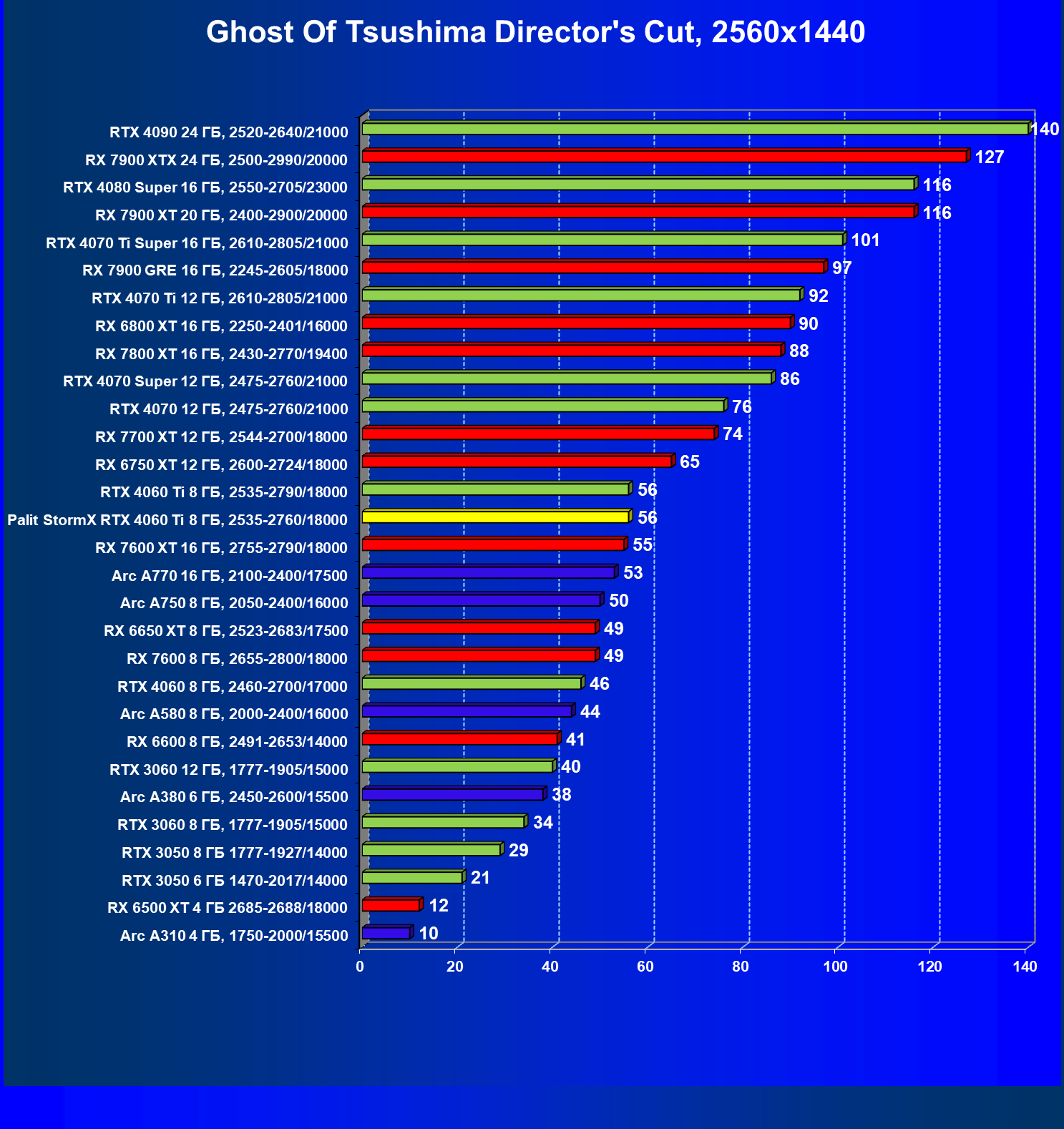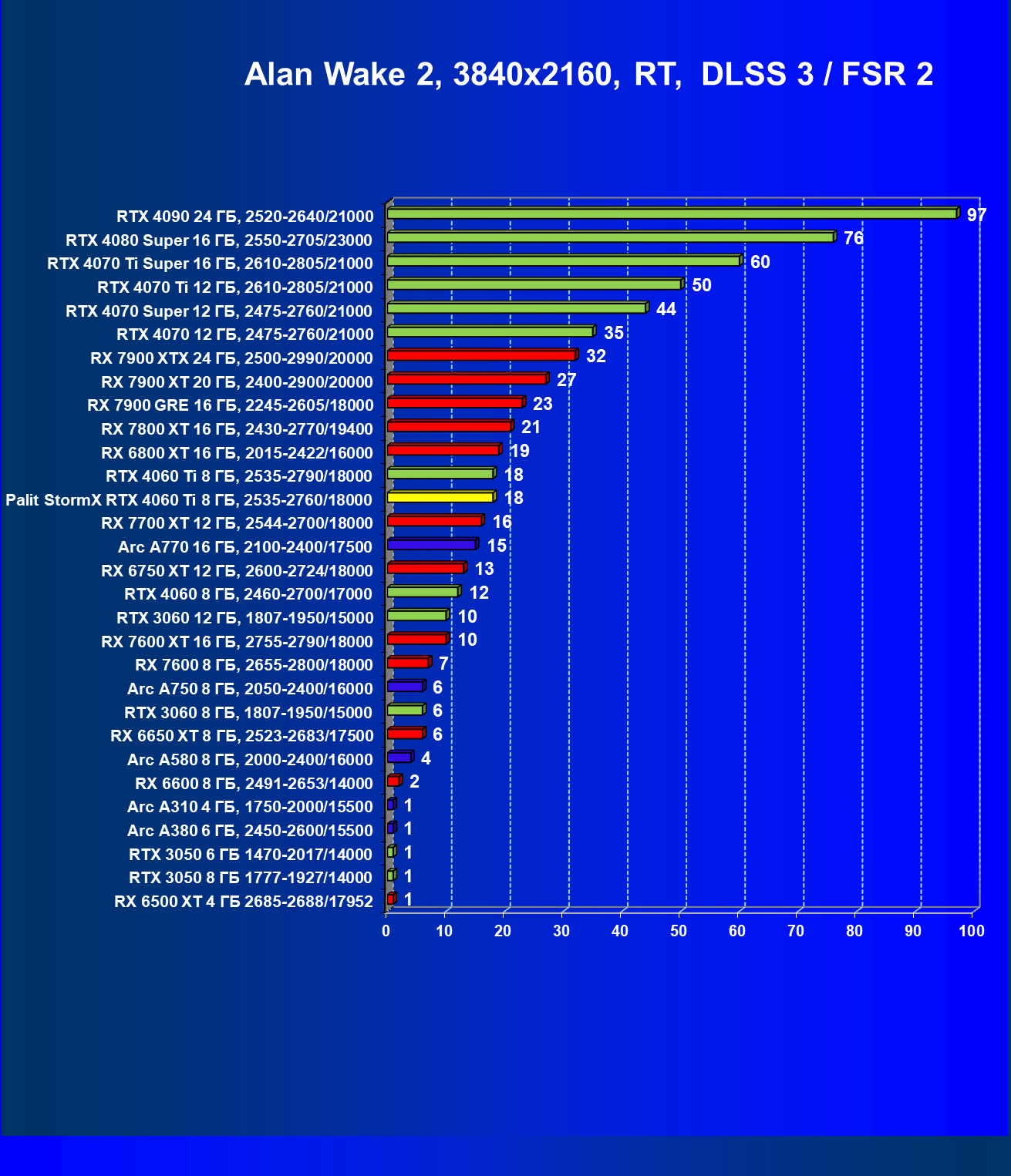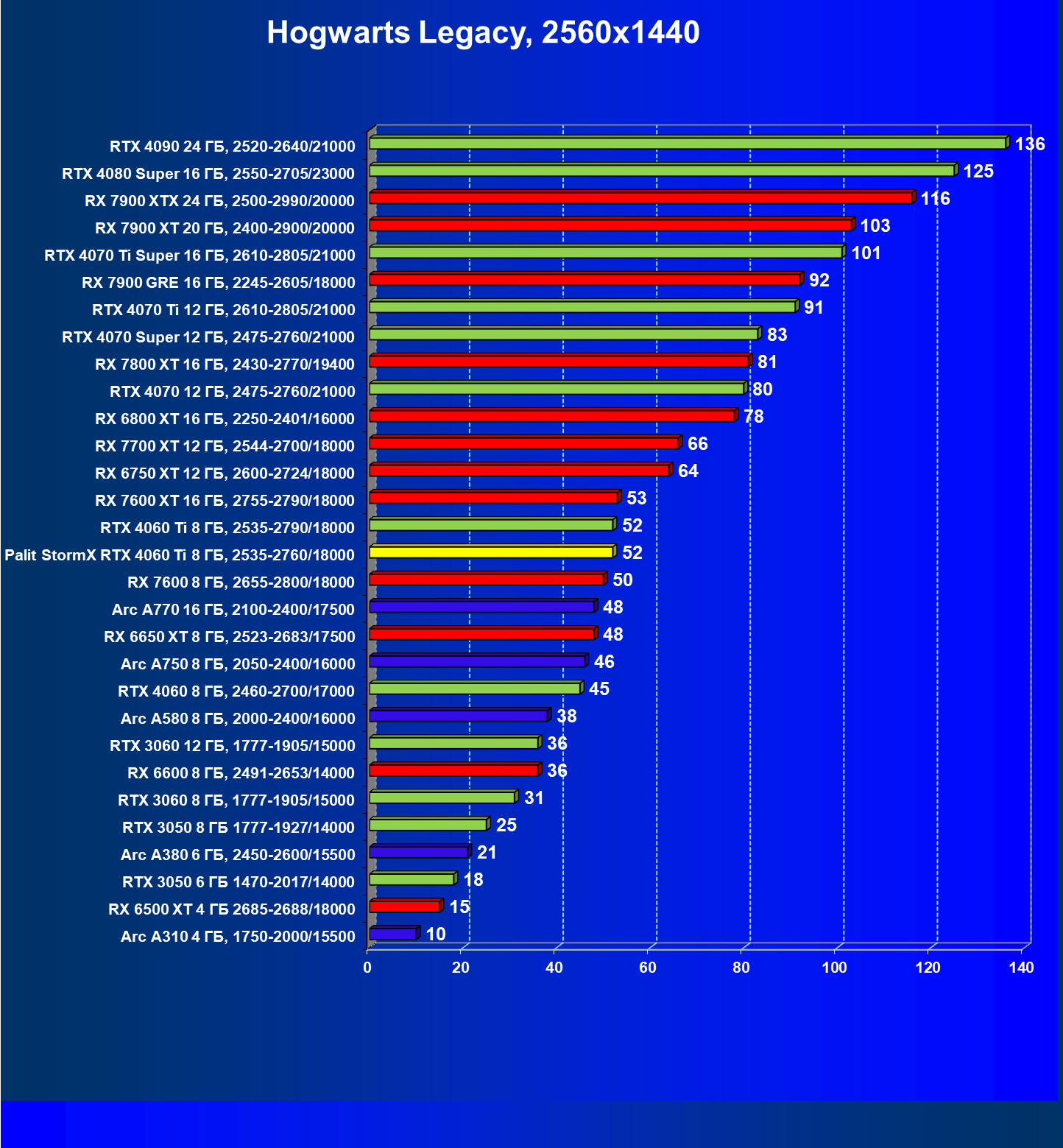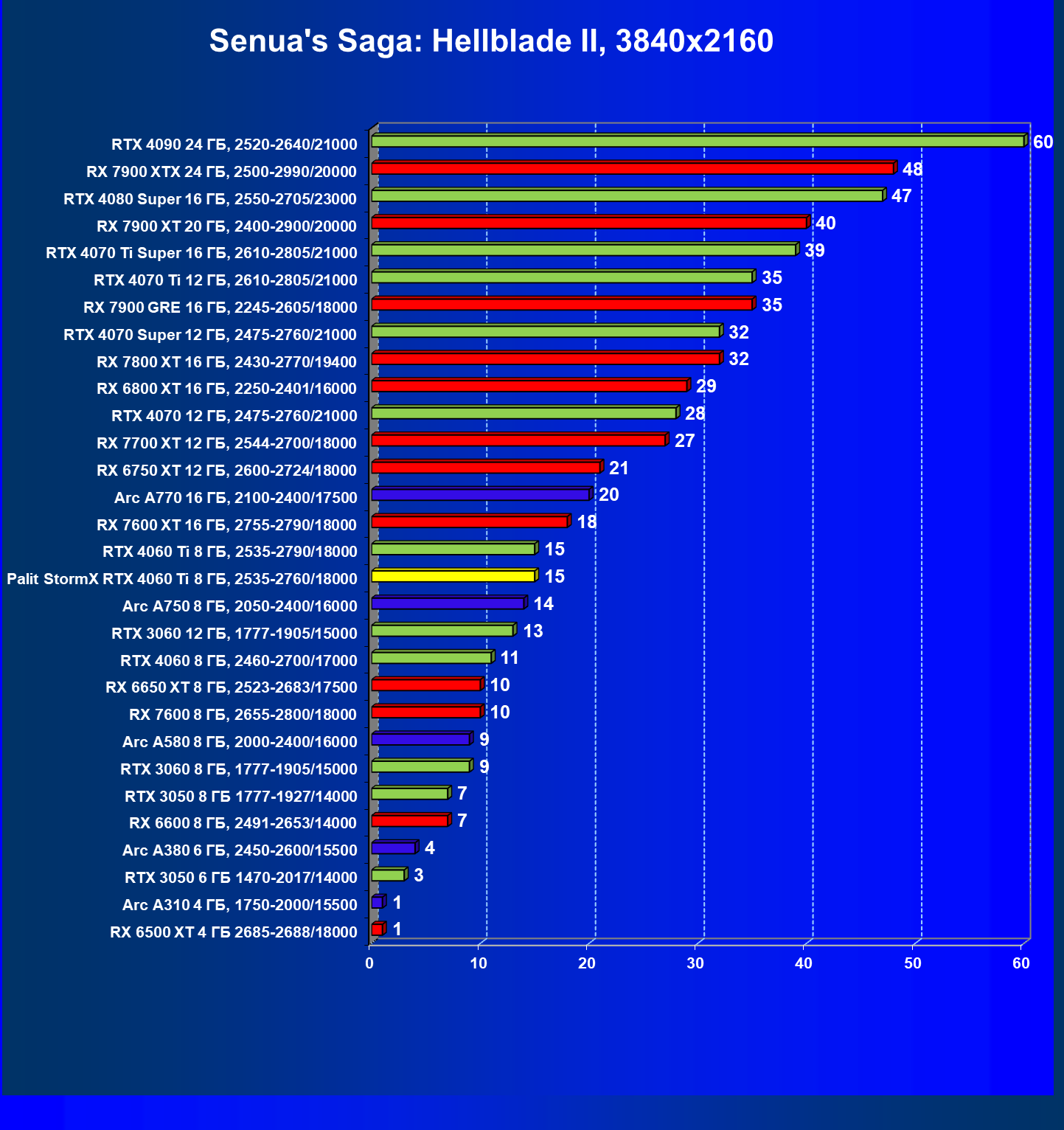 | 11 | Palit StormX RTX 4060 Ti 8 ГБ, 2535—2760/18000 | 1739 | 458 | 38 000 |