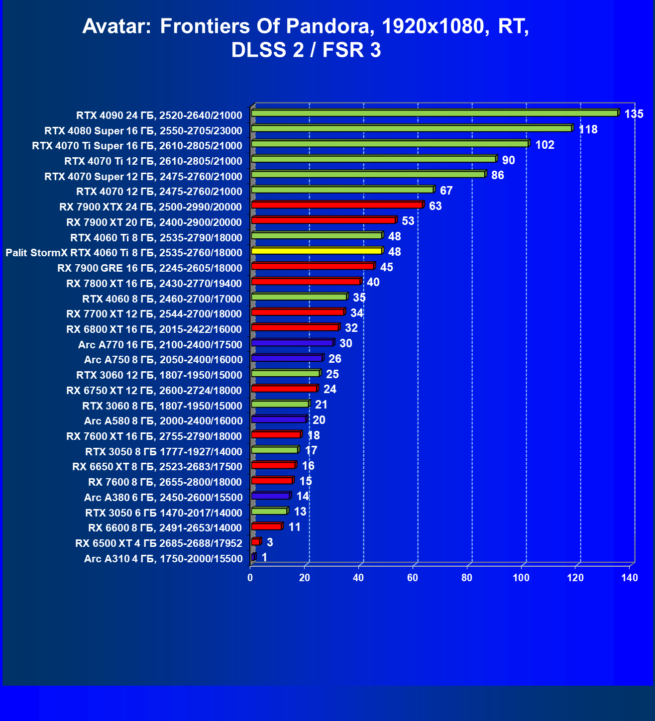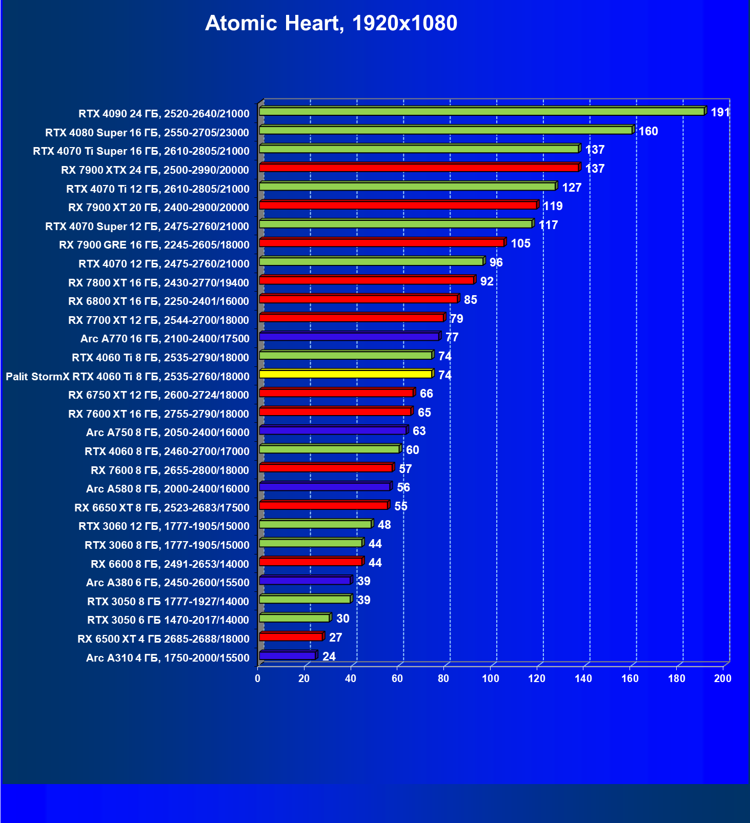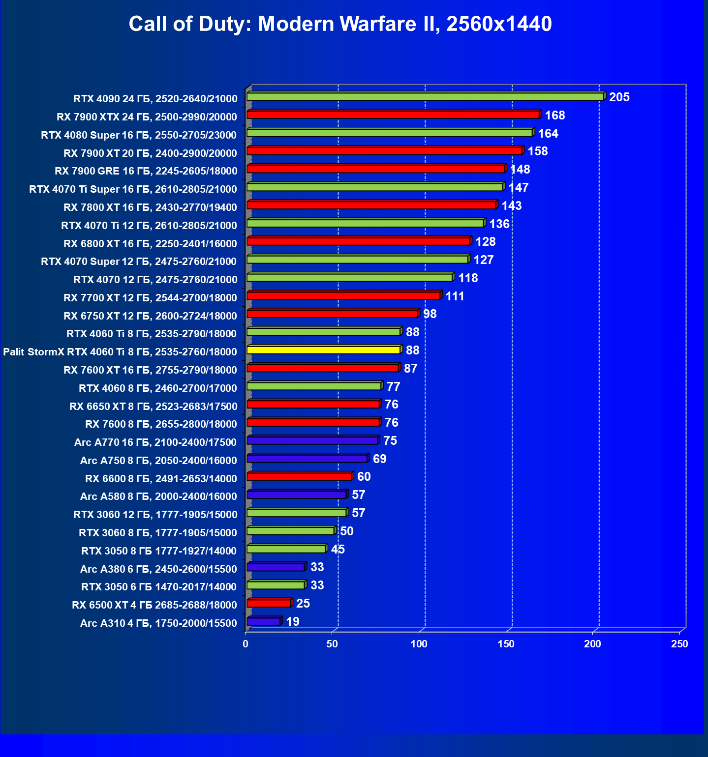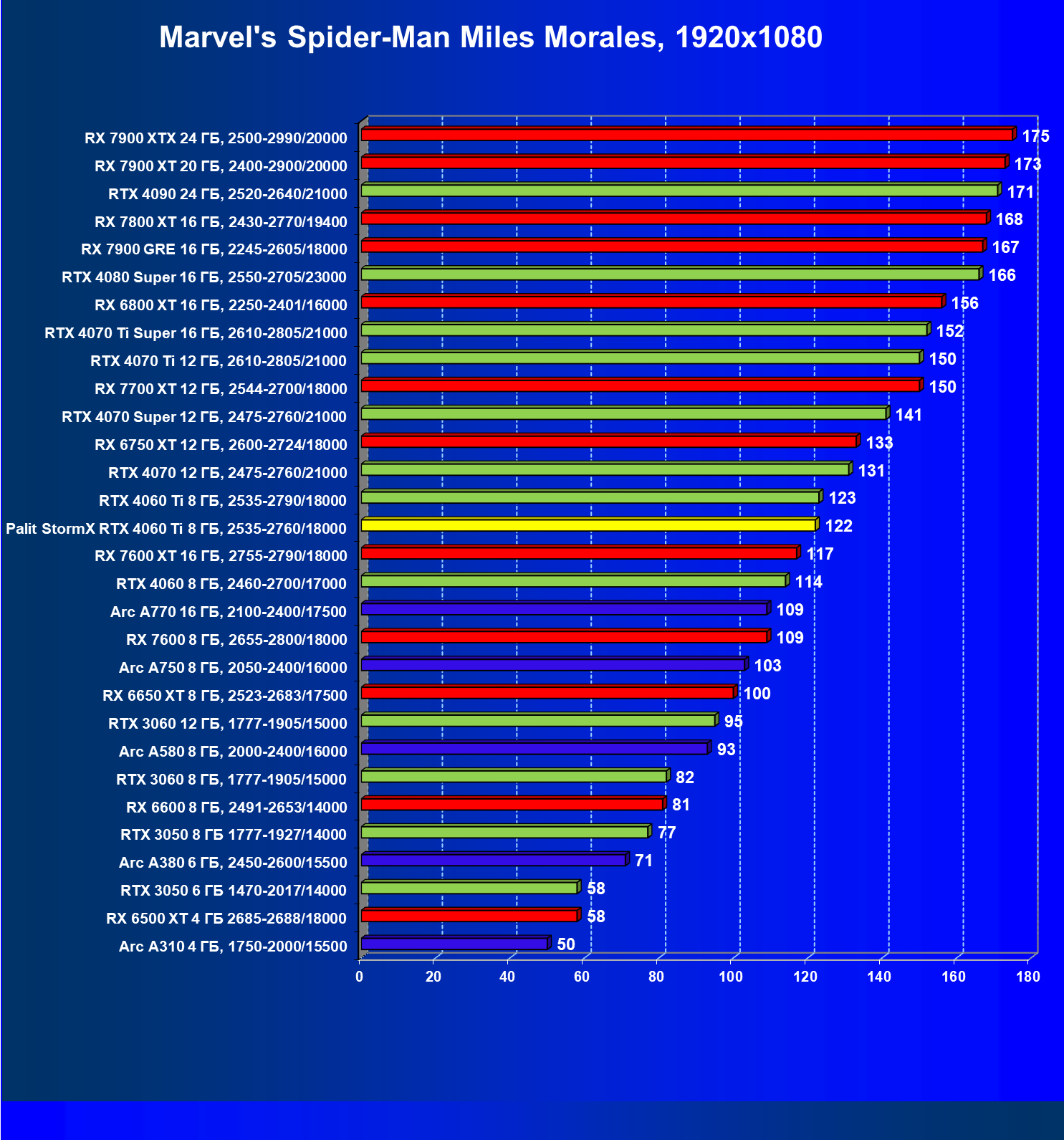 | 15 | Palit StormX RTX 4060 Ti 8 ГБ, 2535—2760/18000 | 743 | 196 | 38 000 |