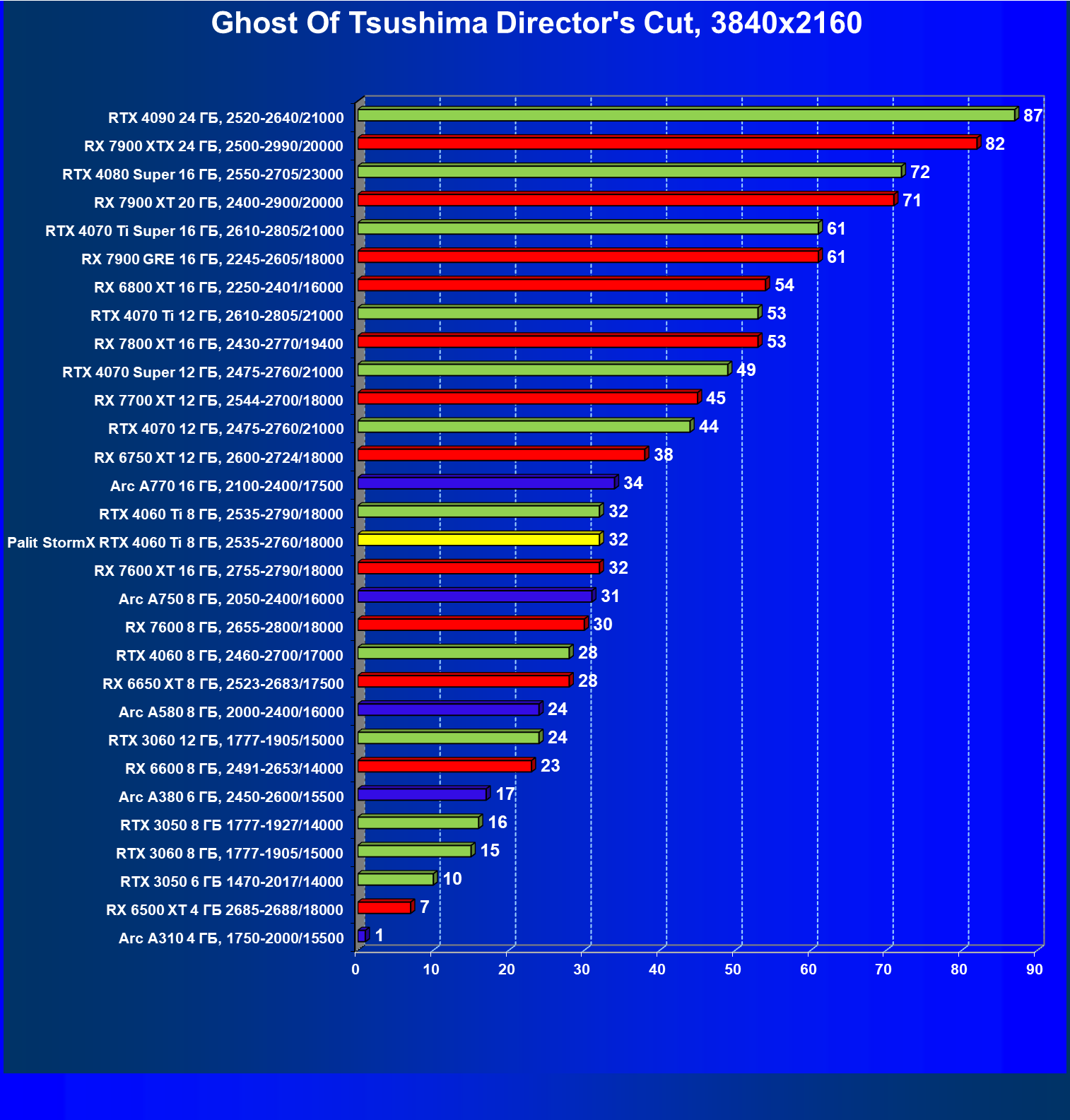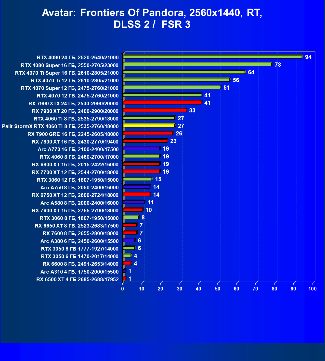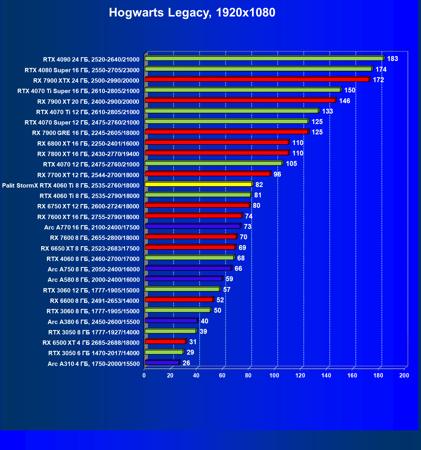 | 15 | Palit StormX RTX 4060 Ti 8 ГБ, 2535—2760/18000 | 743 | 196 | 38 000 |