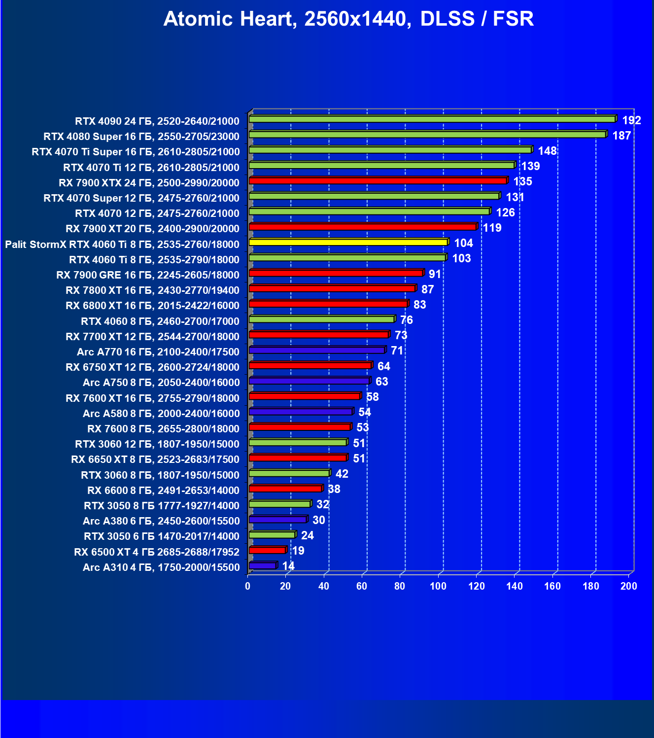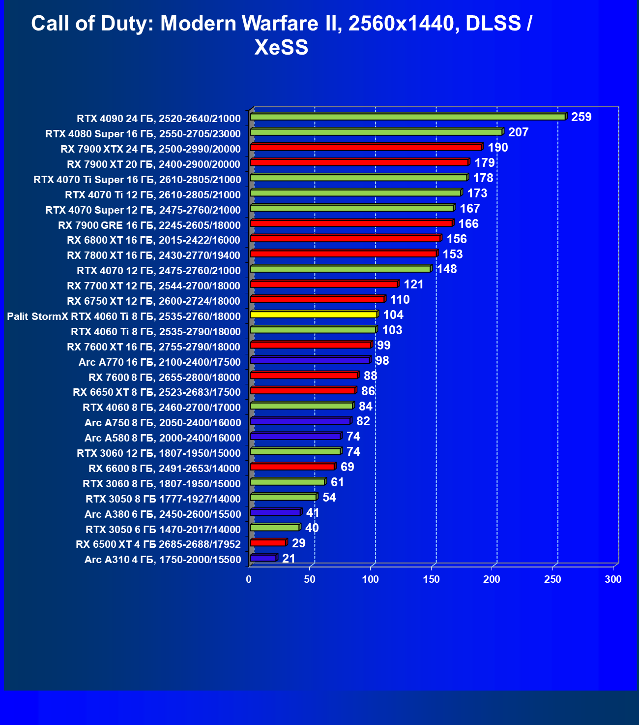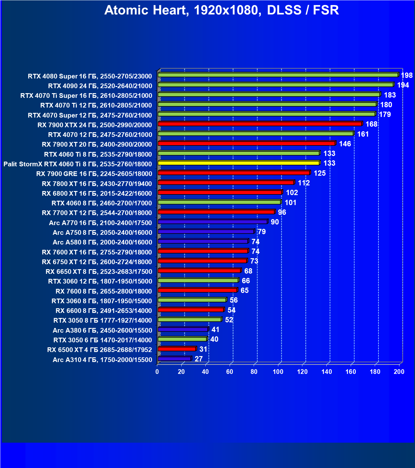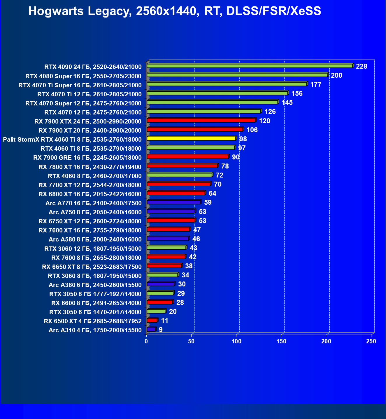 | 15 | Palit StormX RTX 4060 Ti 8 ГБ, 2535—2760/18000 | 743 | 196 | 38 000 |