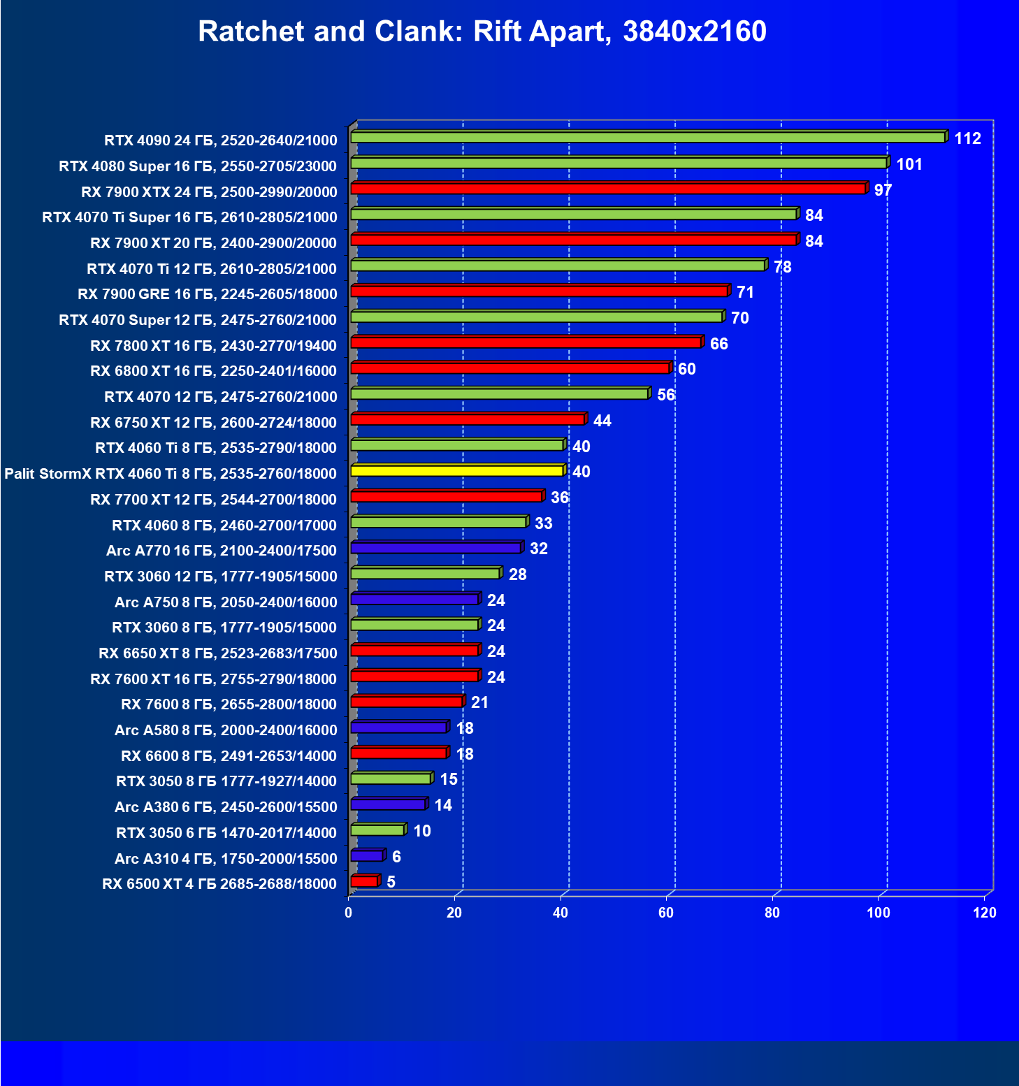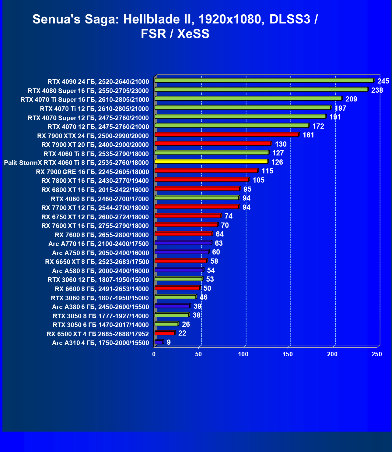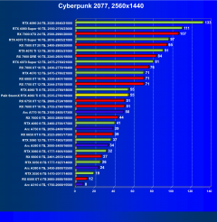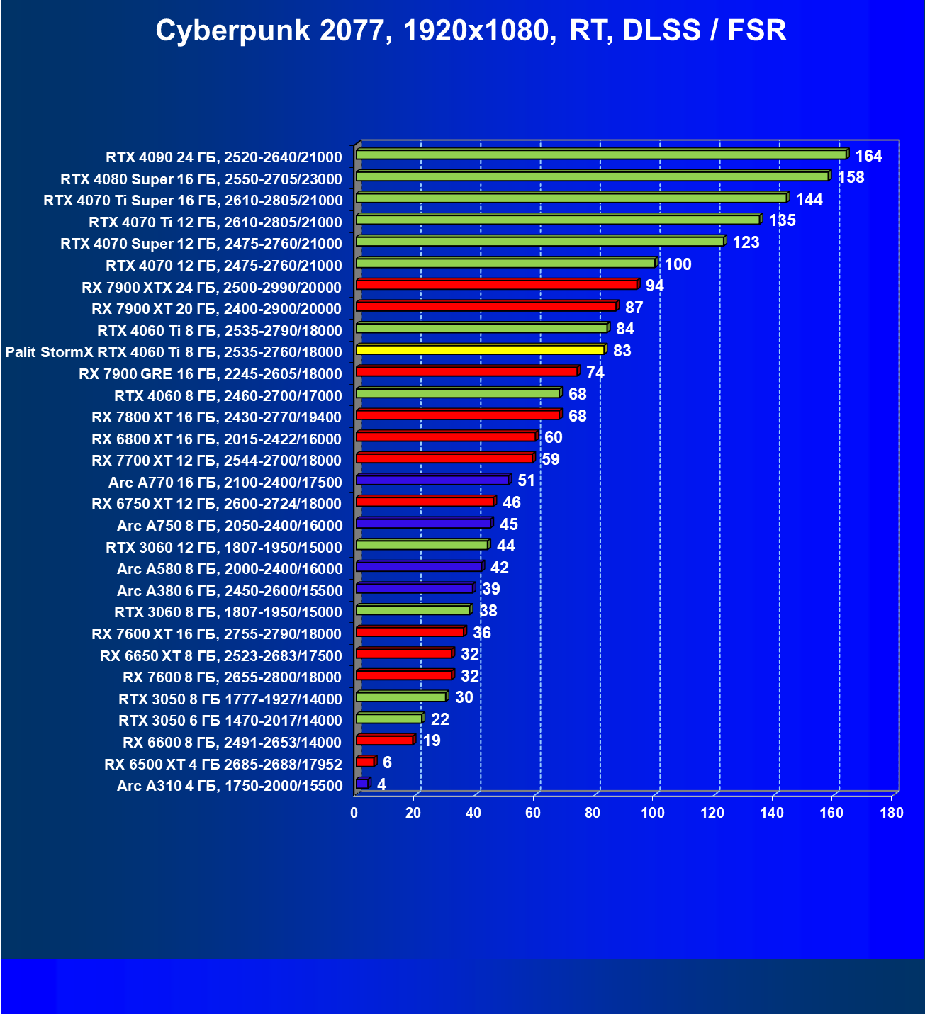 | 12 | RX 7700 XT 12 ГБ, 2544—2700/18000 | 913 | 208 | 44 000 |