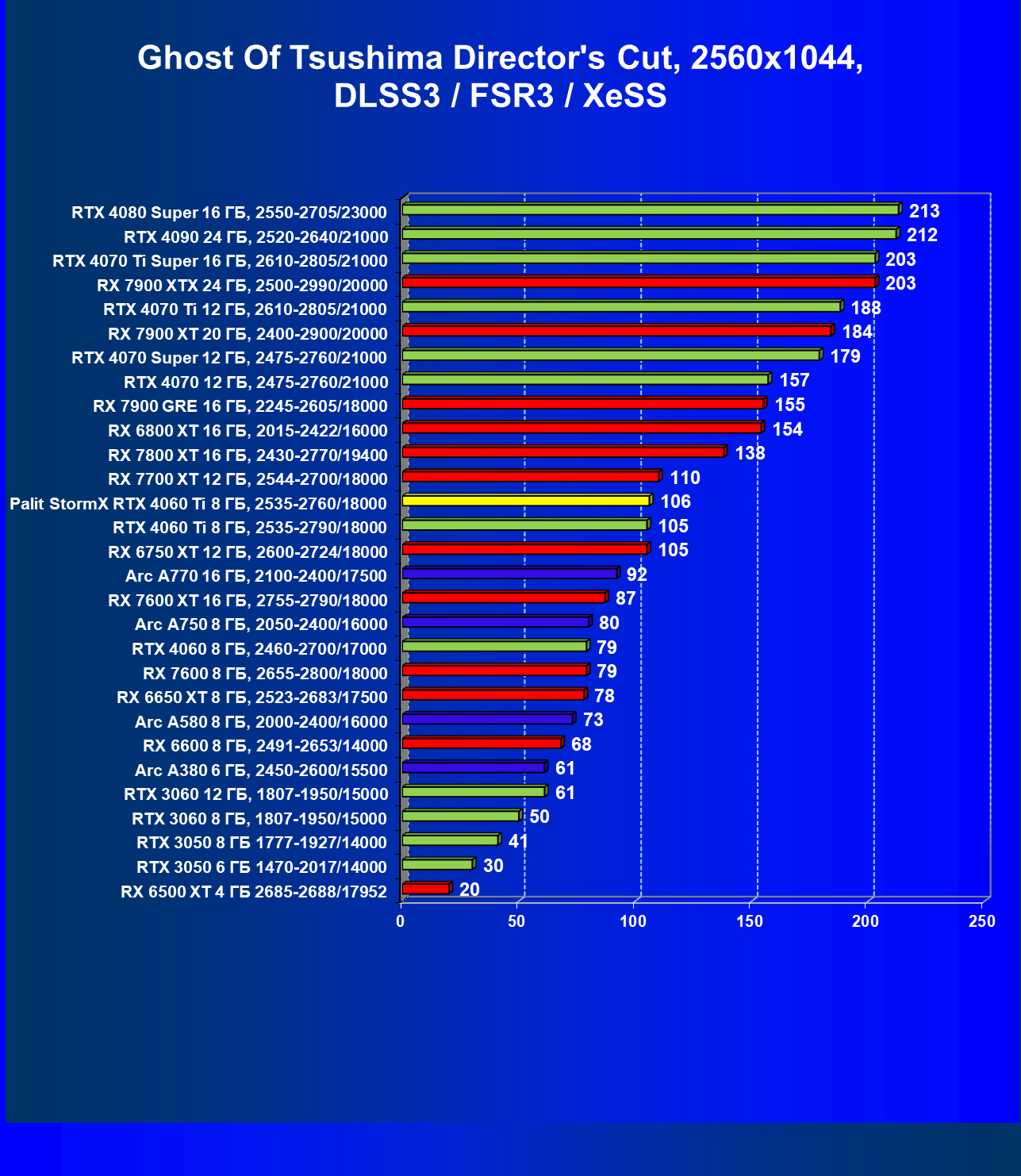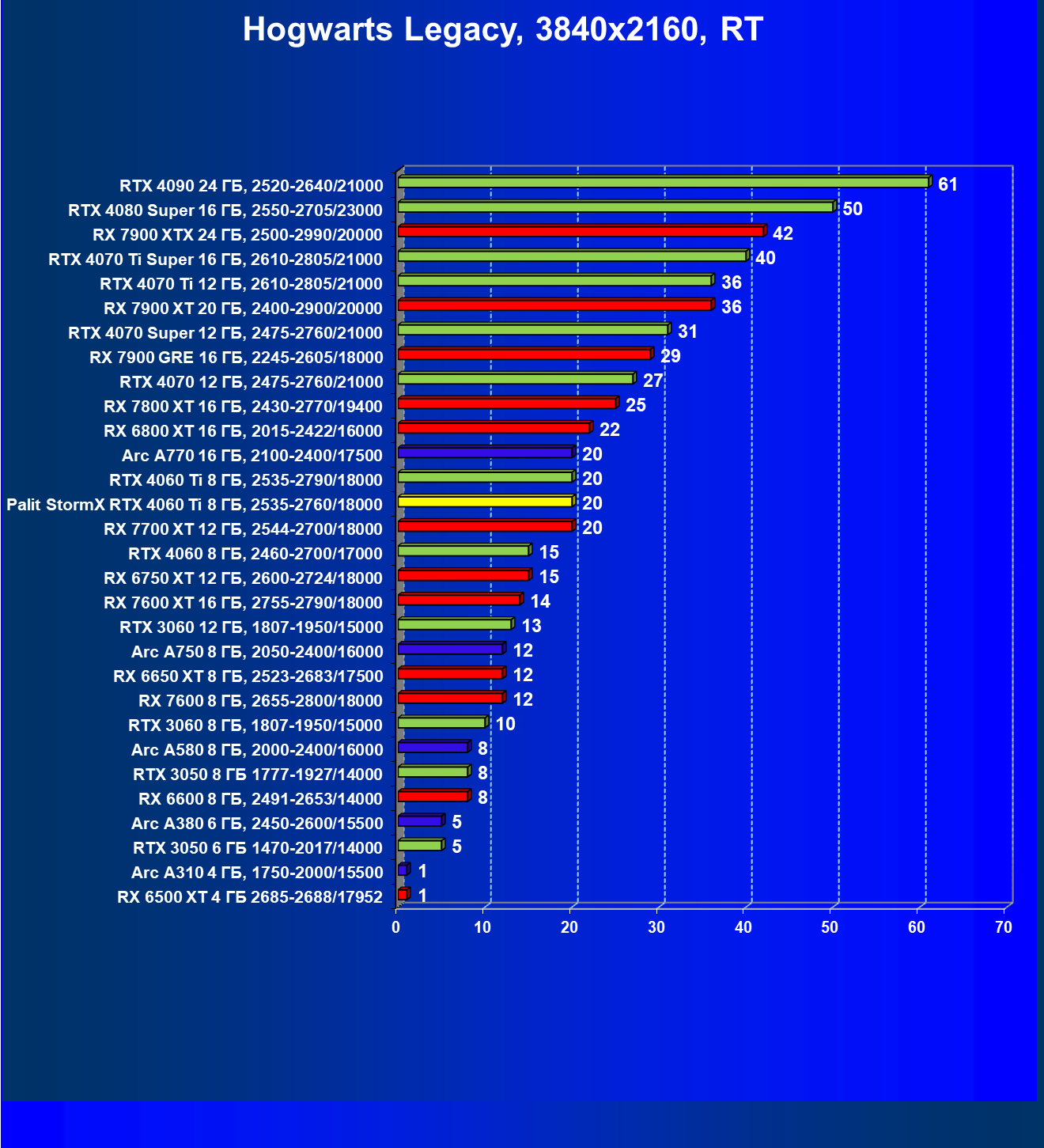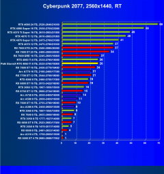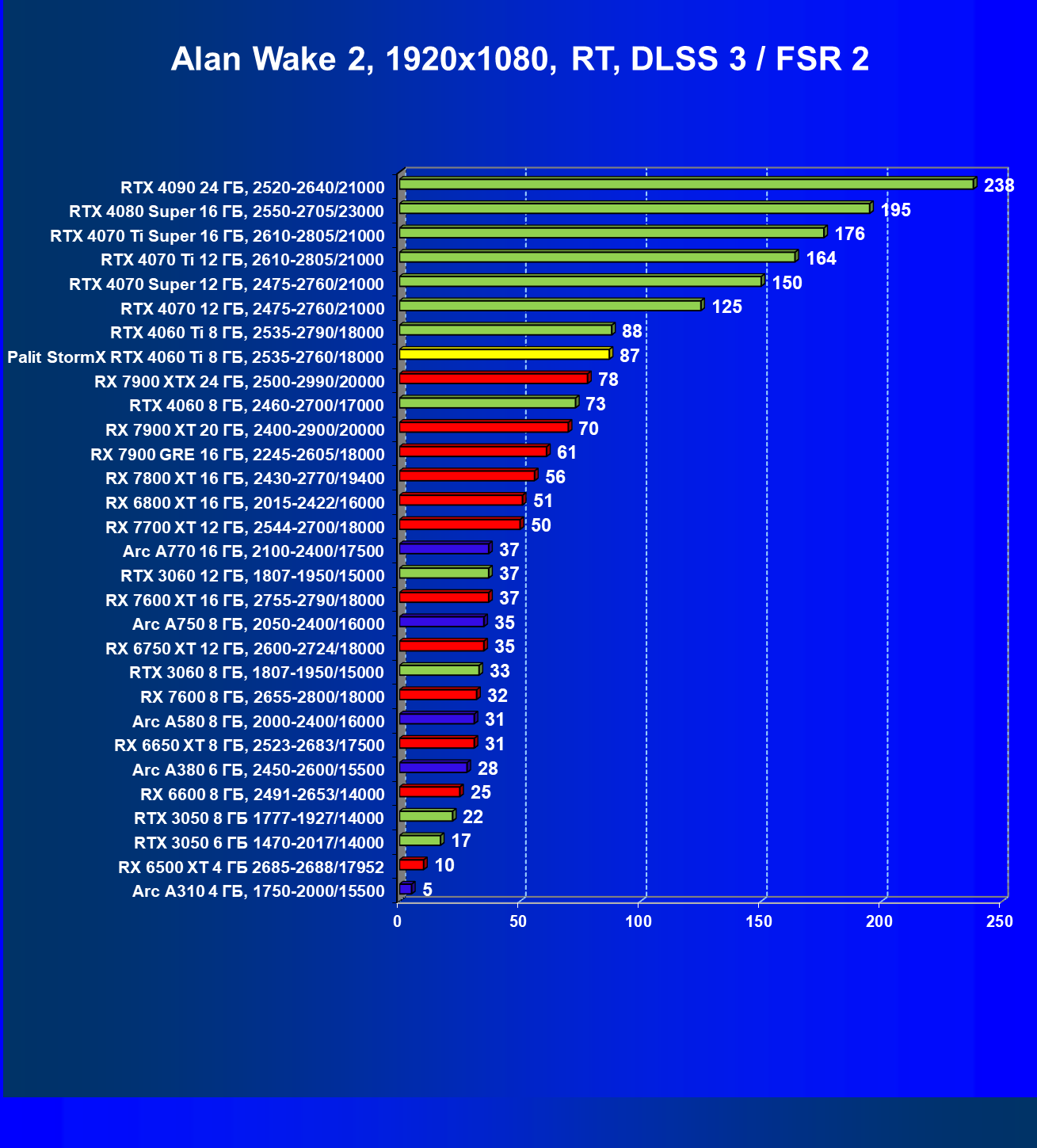 | 12 | RX 7700 XT 12 ГБ, 2544—2700/18000 | 913 | 208 | 44 000 |