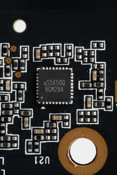 На лицевой стороне платы имеется контроллер uS5650Q (uPI Semi), который отвечает за мониторинг карты (отслеживание напряжений и температуры).