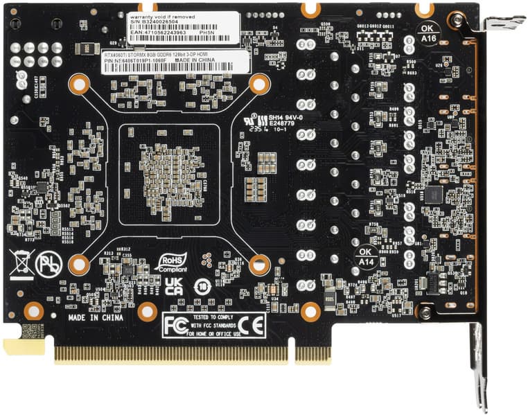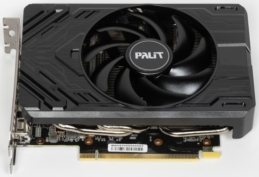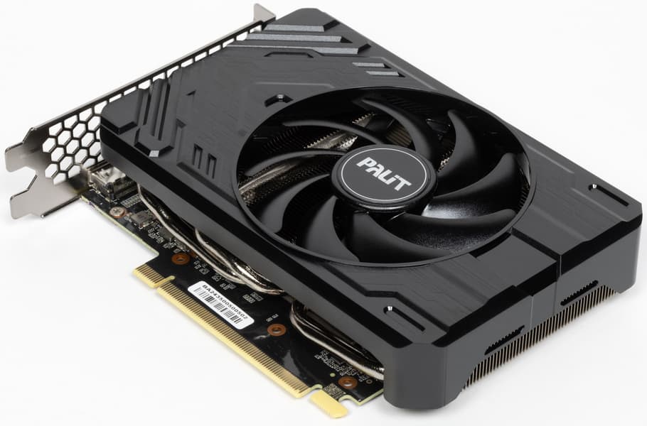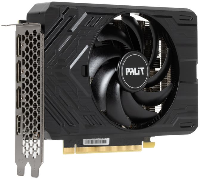 А как насчет видеокарты уровнем выше, на базе GeForce RTX 4060 Ti? Сможет ли столь компактная система охлаждения справиться с графическим процессором, который выделяет больше тепла? У нас на рассмотрении снова видеокарта Palit из серии StormX, которая тоже характеризуется размерами, пригодными для установки в очень маленькие корпуса форм-фактора Mini-ITX, и занимает всего 2 слота в системном блоке.