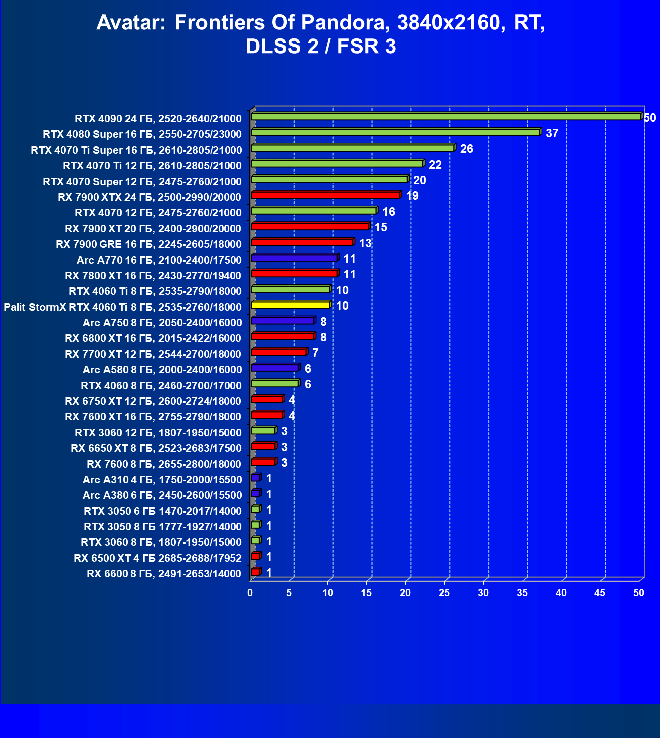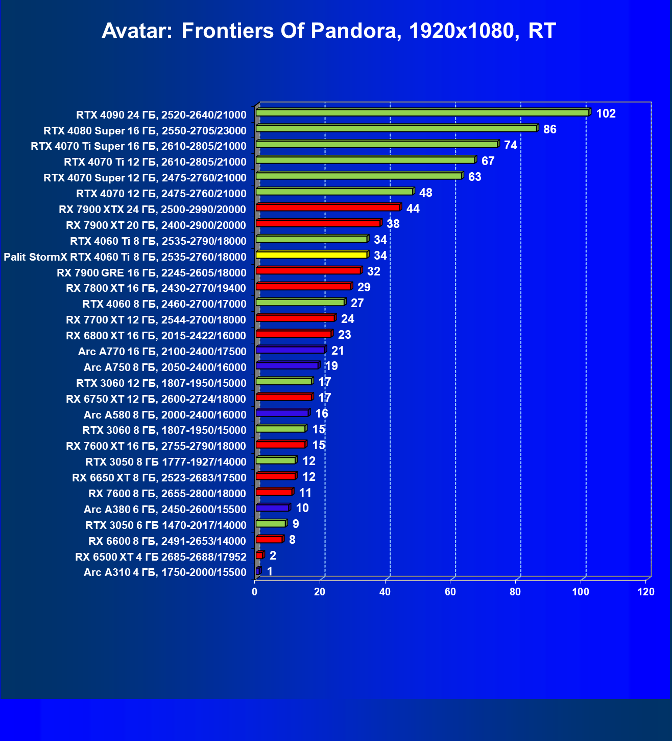 | 12 | RX 7700 XT 12 ГБ, 2544—2700/18000 | 314 | 1380 | 44 000 |