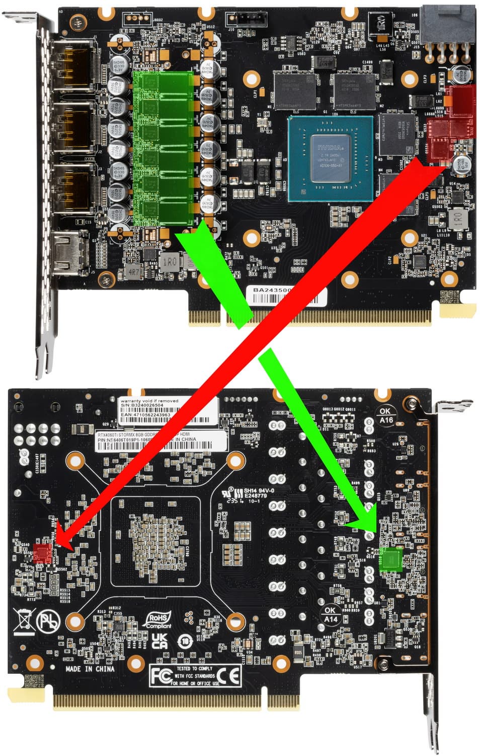 Зеленым цветом отмечена схема питания ядра, красным — памяти. Все ШИМ-контроллеры расположены на оборотной стороне PCB.