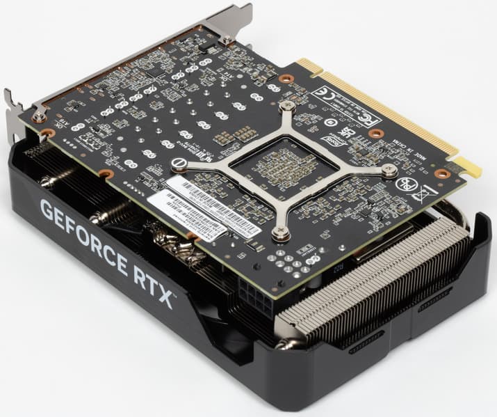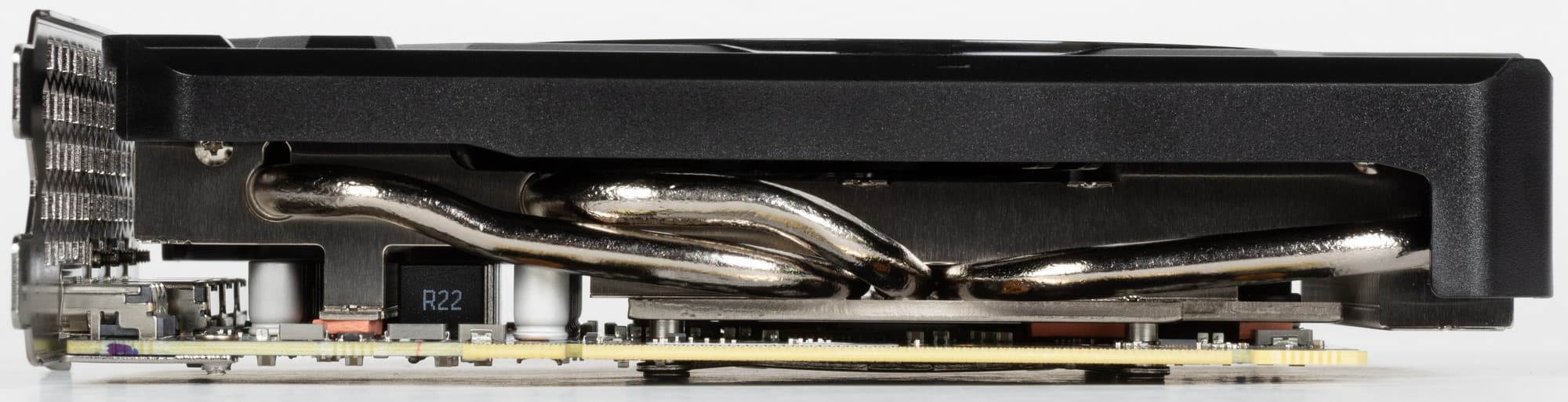 Основой СО является небольшой никелированный радиатор с тепловыми трубками. В сравнении с картой из той же серии на базе GeForce RTX 4060, у которой используется простенький алюминиевый радиатор без тепловых трубок, здесь кулер намного более серьезный.