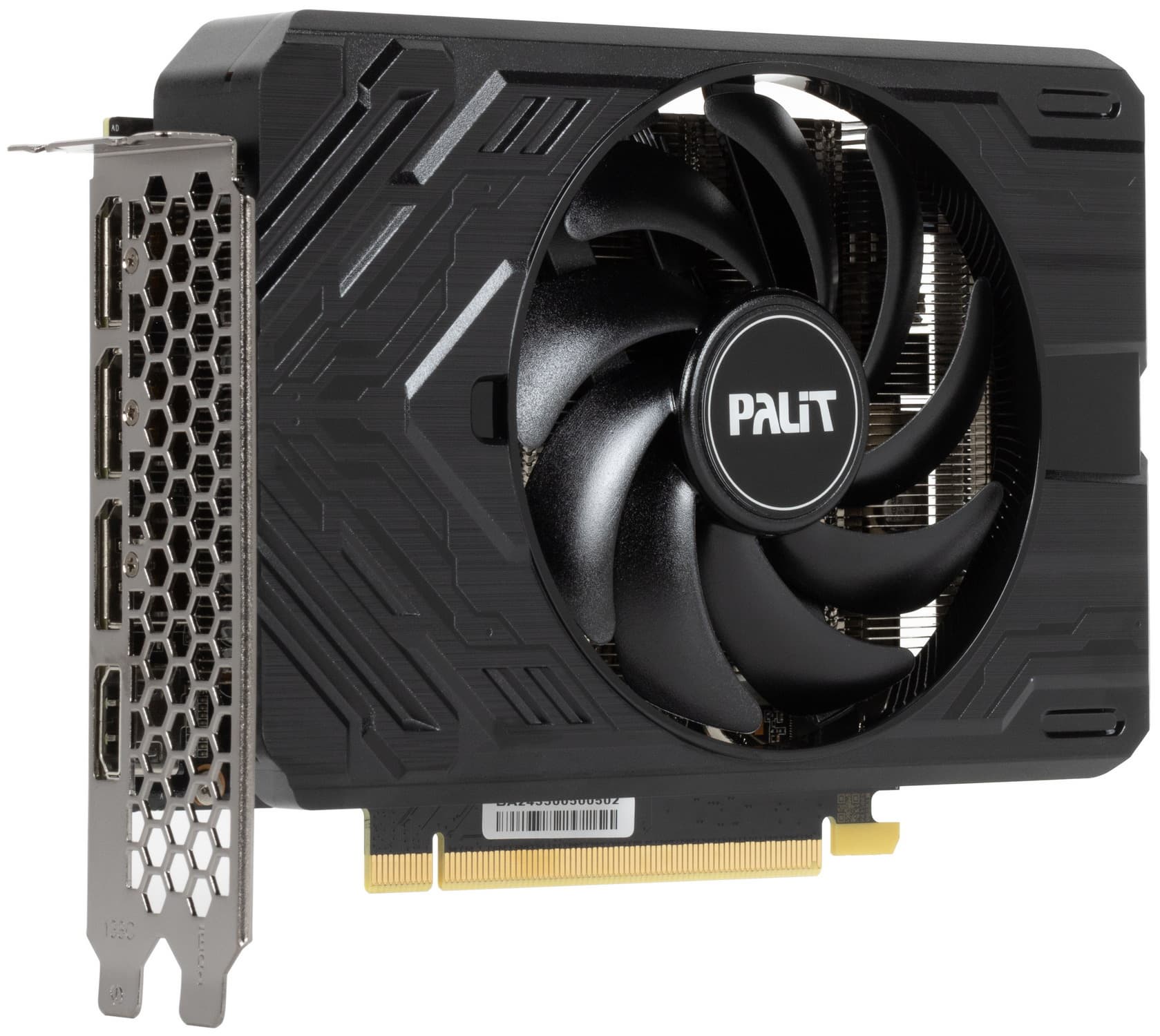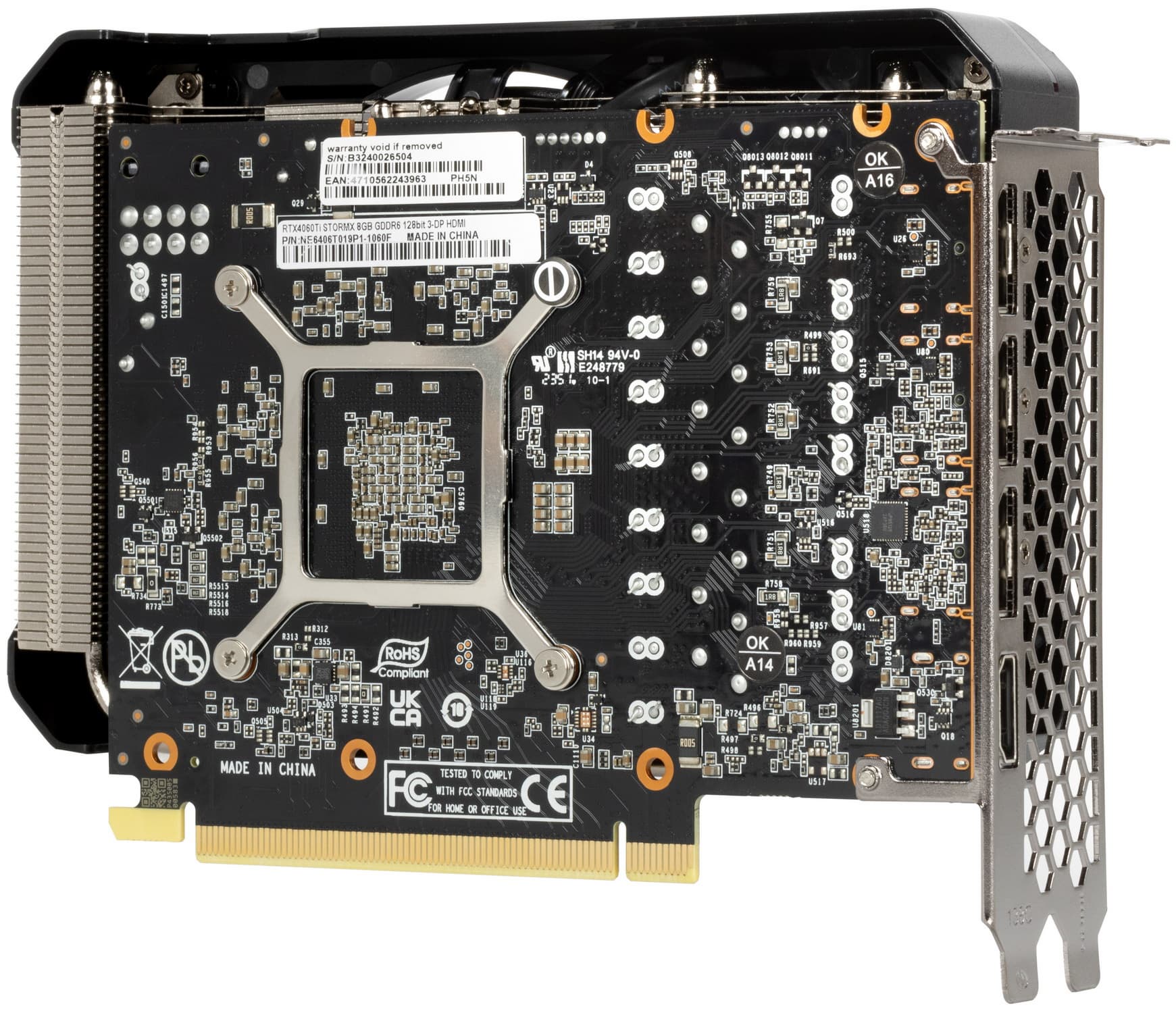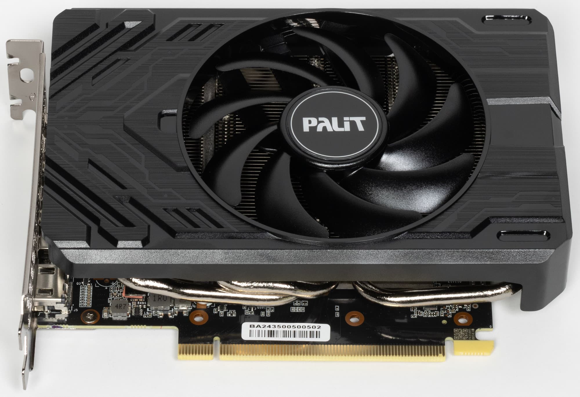 Palit GeForce RTX 4060 Ti StormX (8 ГБ) — одна из самых компактных современных видеокарт на одном из младших GPU Nvidia последнего поколения. Размеры карты составляют 17×12,5×4 см, она занимает 2 слота в системном блоке и подходит для корпусов форм-фактора Mini-ITX. При этом, в отличие от Palit GeForce RTX 4060 StormX, система охлаждения весьма эффективная, хотя и шумная при настройках по умолчанию. Карта может потреблять до 157 Вт и имеет стандартный 8-контактный разъем питания, она полностью лишена подсветки. Набор видеовыходов стандартный: три DP 1.4a и один HDMI 2.1.