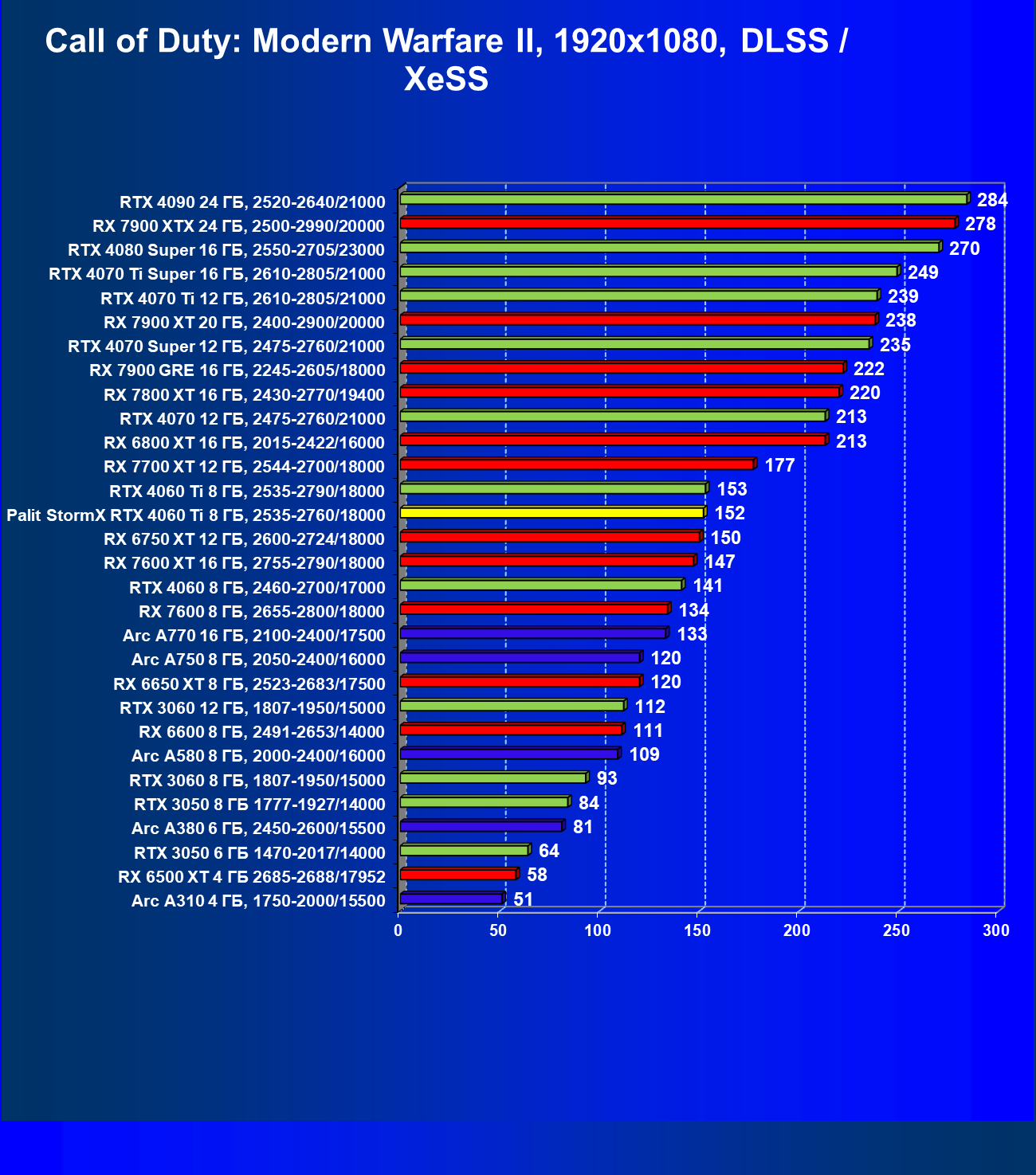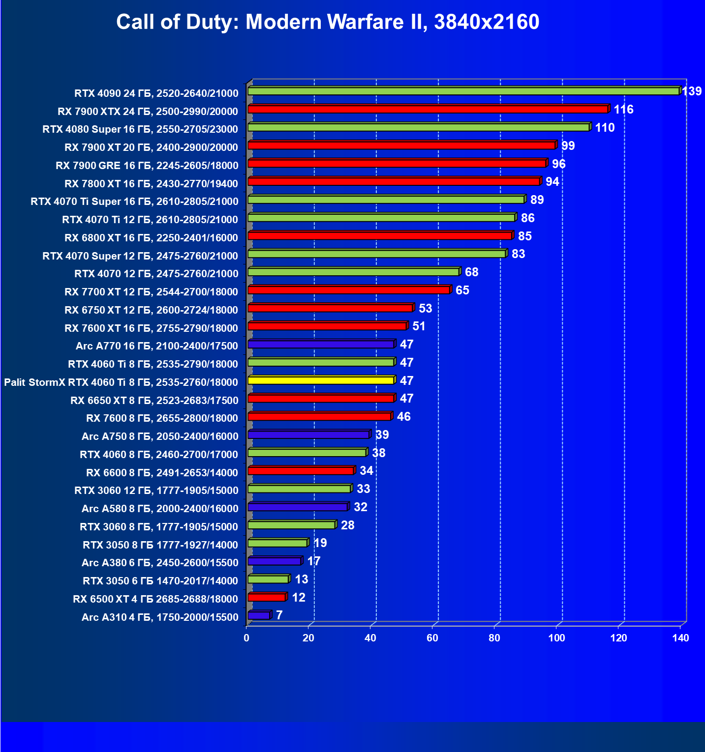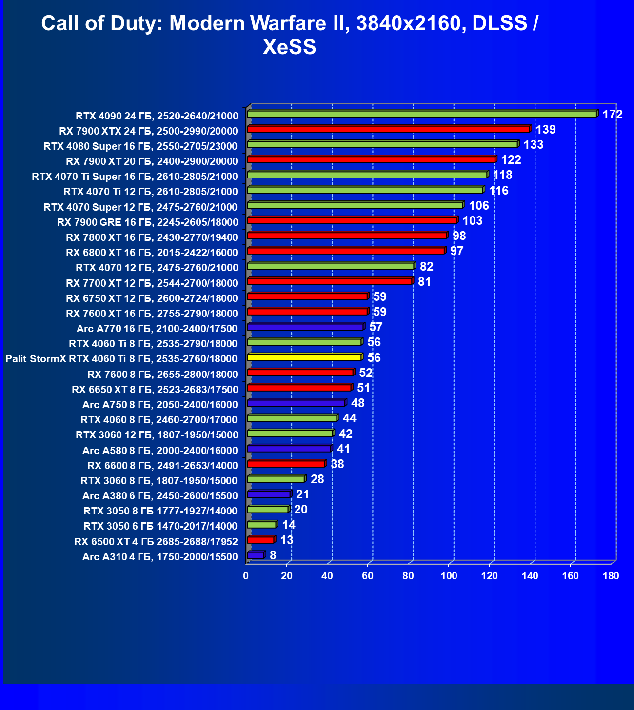 | 09 | Palit StormX RTX 4060 Ti 8 ГБ, 2535—2760/18000 | 196 | 743 | 38 000 |