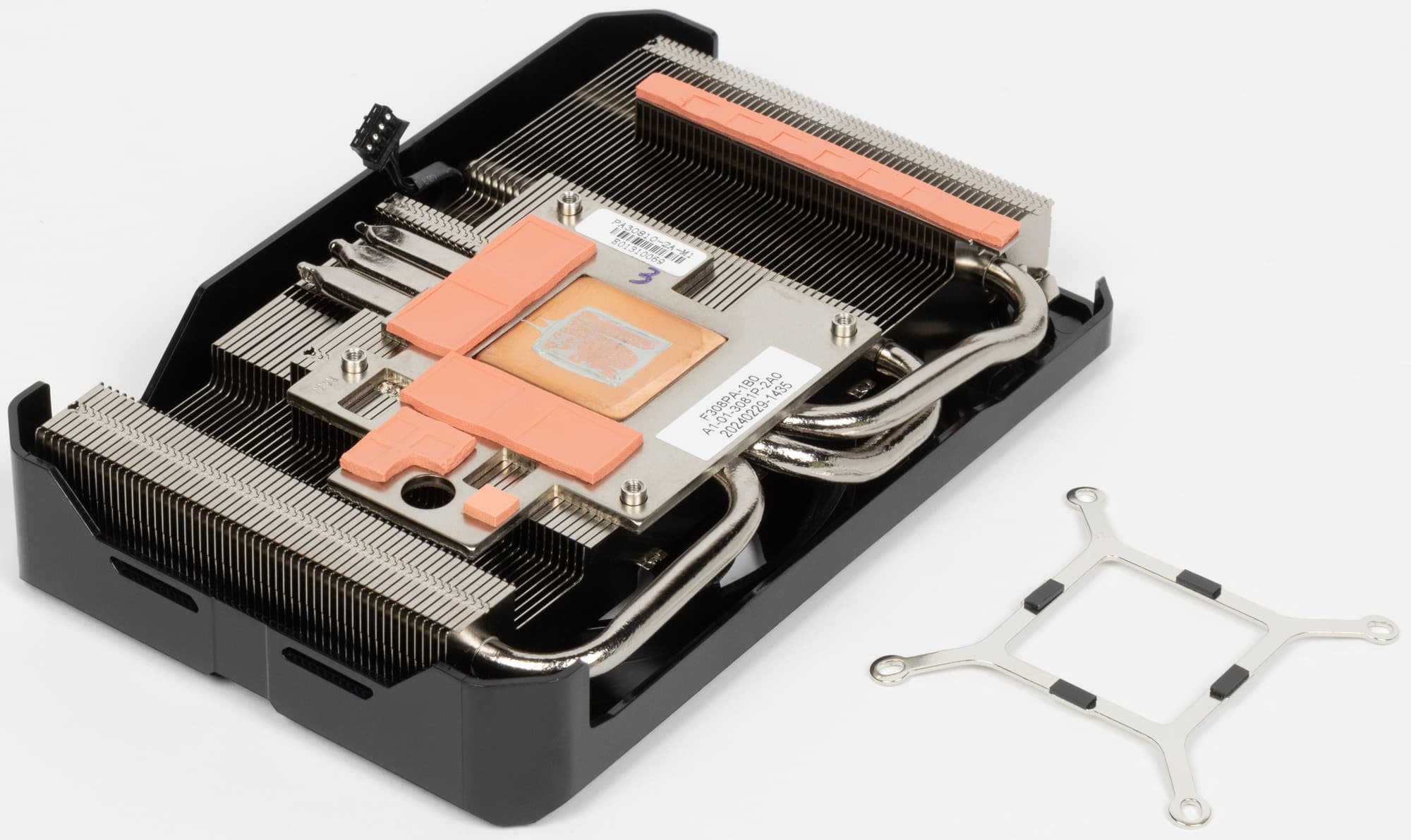 Тепловые трубки припаяны к большой пластине, которая служит теплосъемником и для микросхем памяти через термоинтерфейс. Компоненты преобразователей питания VRM памяти охлаждает эта же пластина, компоненты VRM ядра имеют отдельный маленький теплосъемник на том же радиаторе.