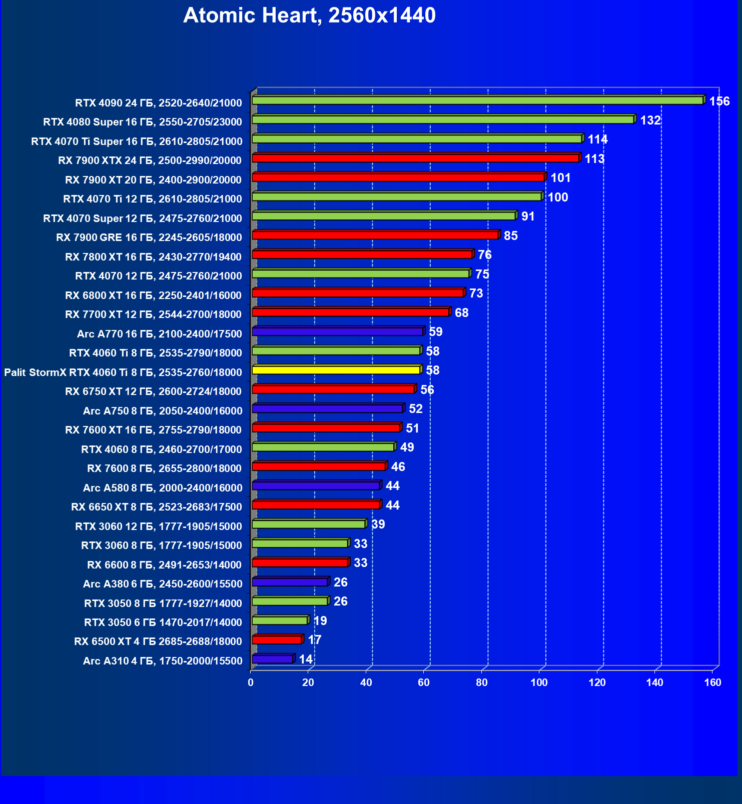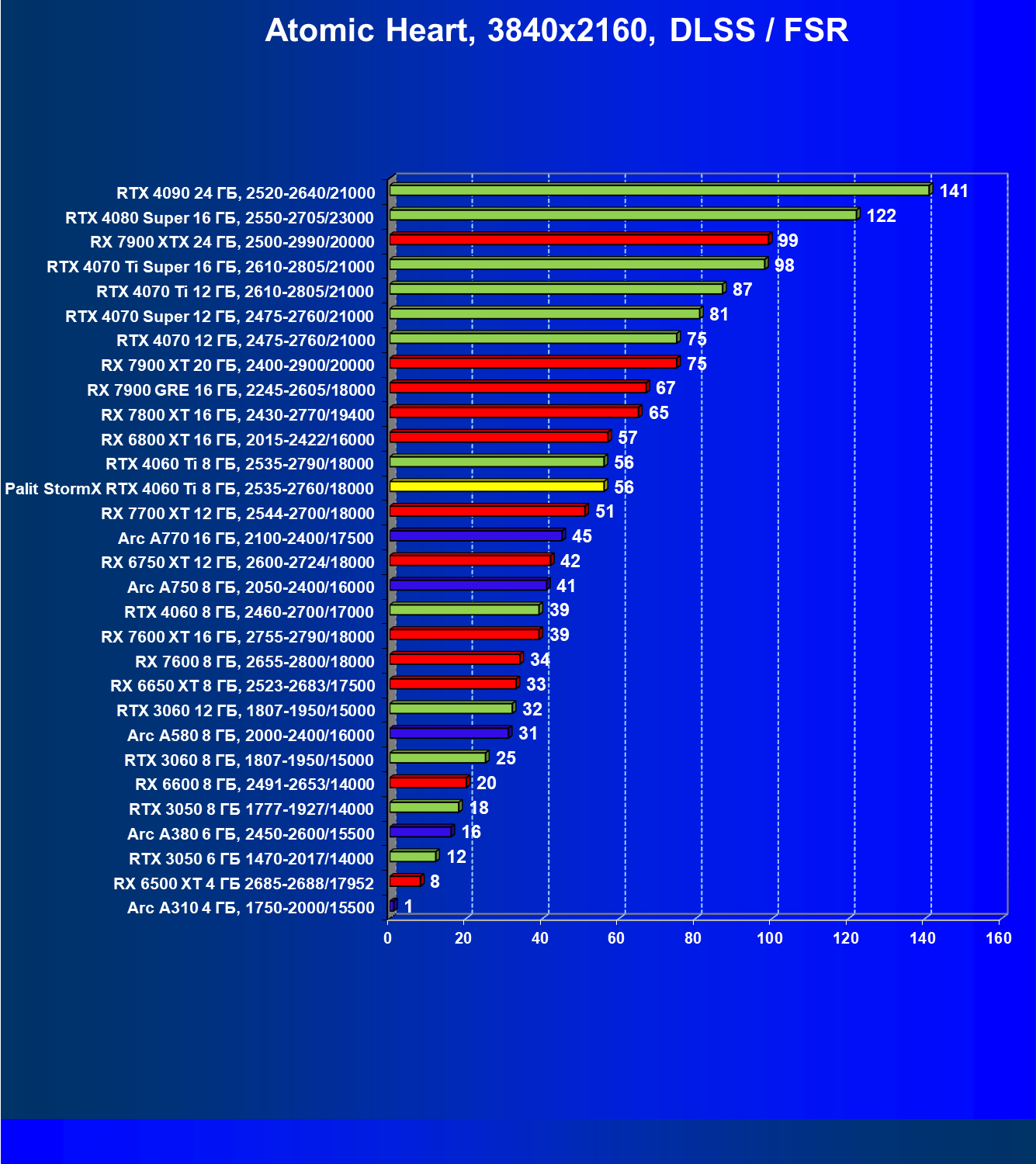 | 02 | Palit StormX RTX 4060 Ti 8 ГБ, 2535—2760/18000 | 458 | 1739 | 38 000 |