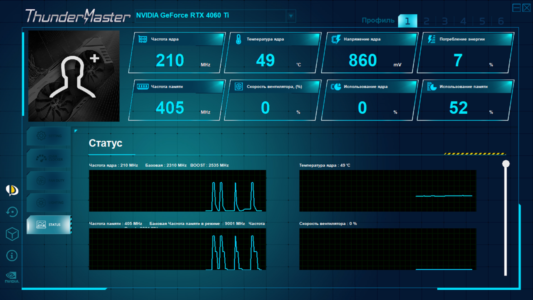 Управление работой карты обеспечивается с помощью фирменной утилиты Palit.