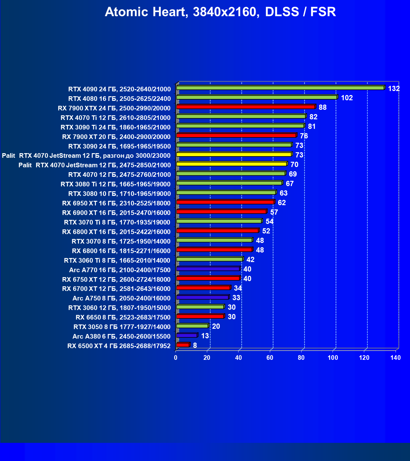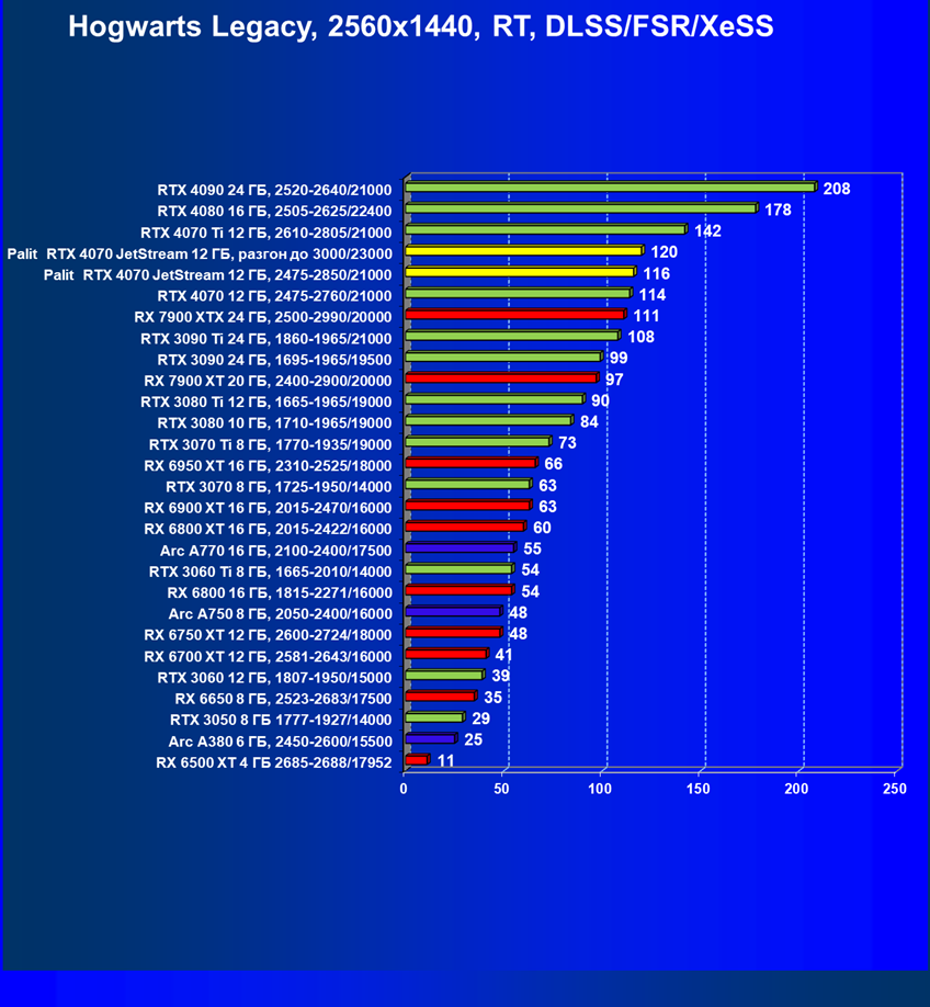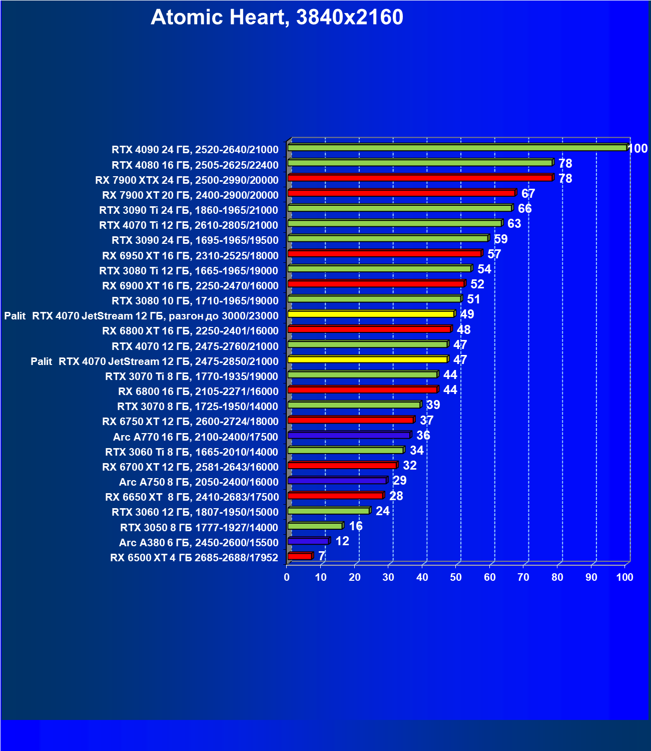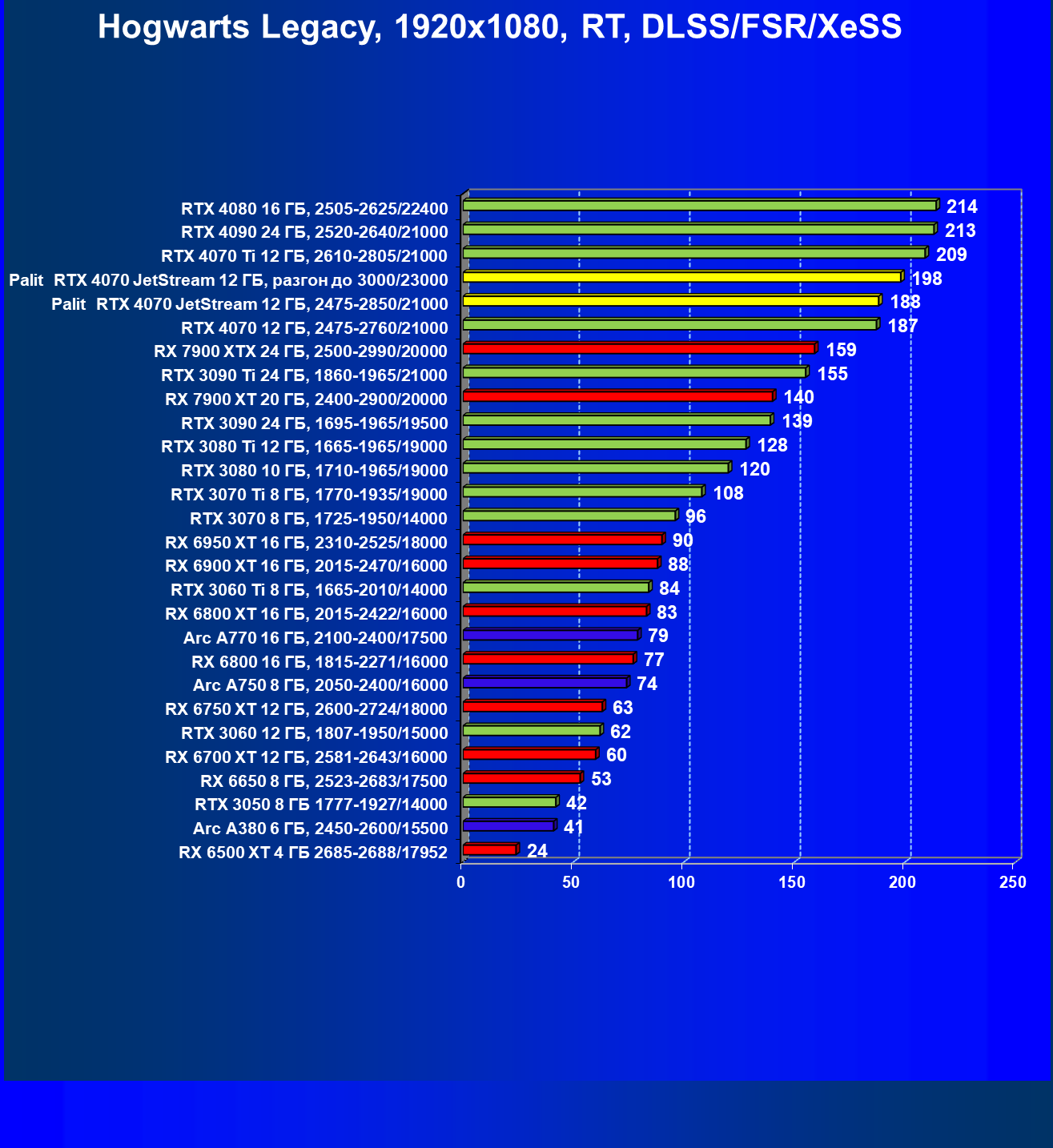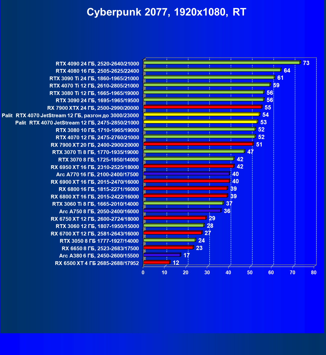 | 14 | Palit RTX 4070 JetStream 12 ГБ, 2475—2850/21000 | 73 | 458 | 62 500 |