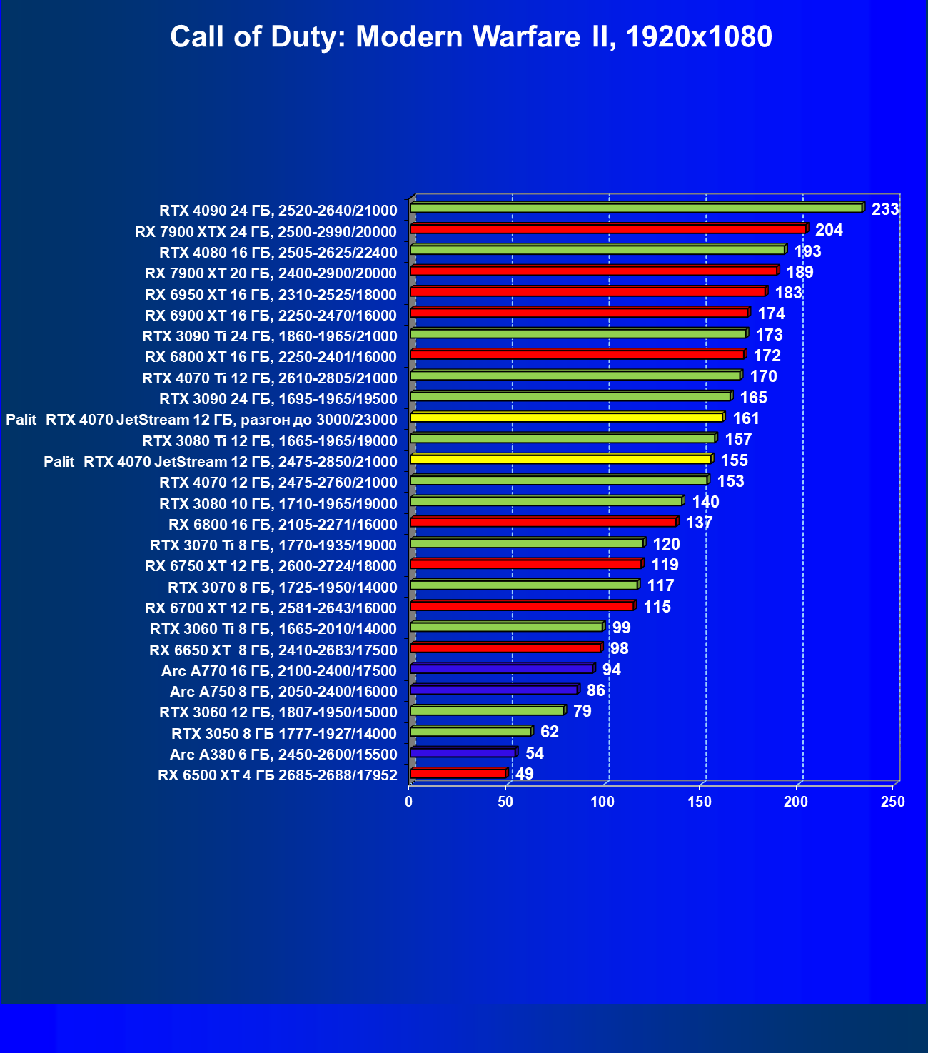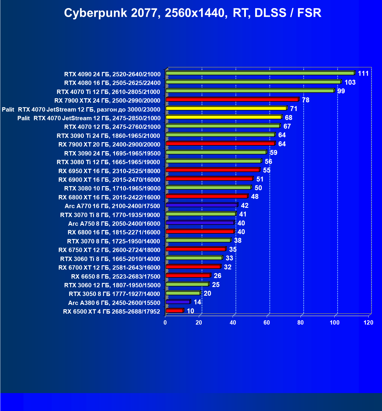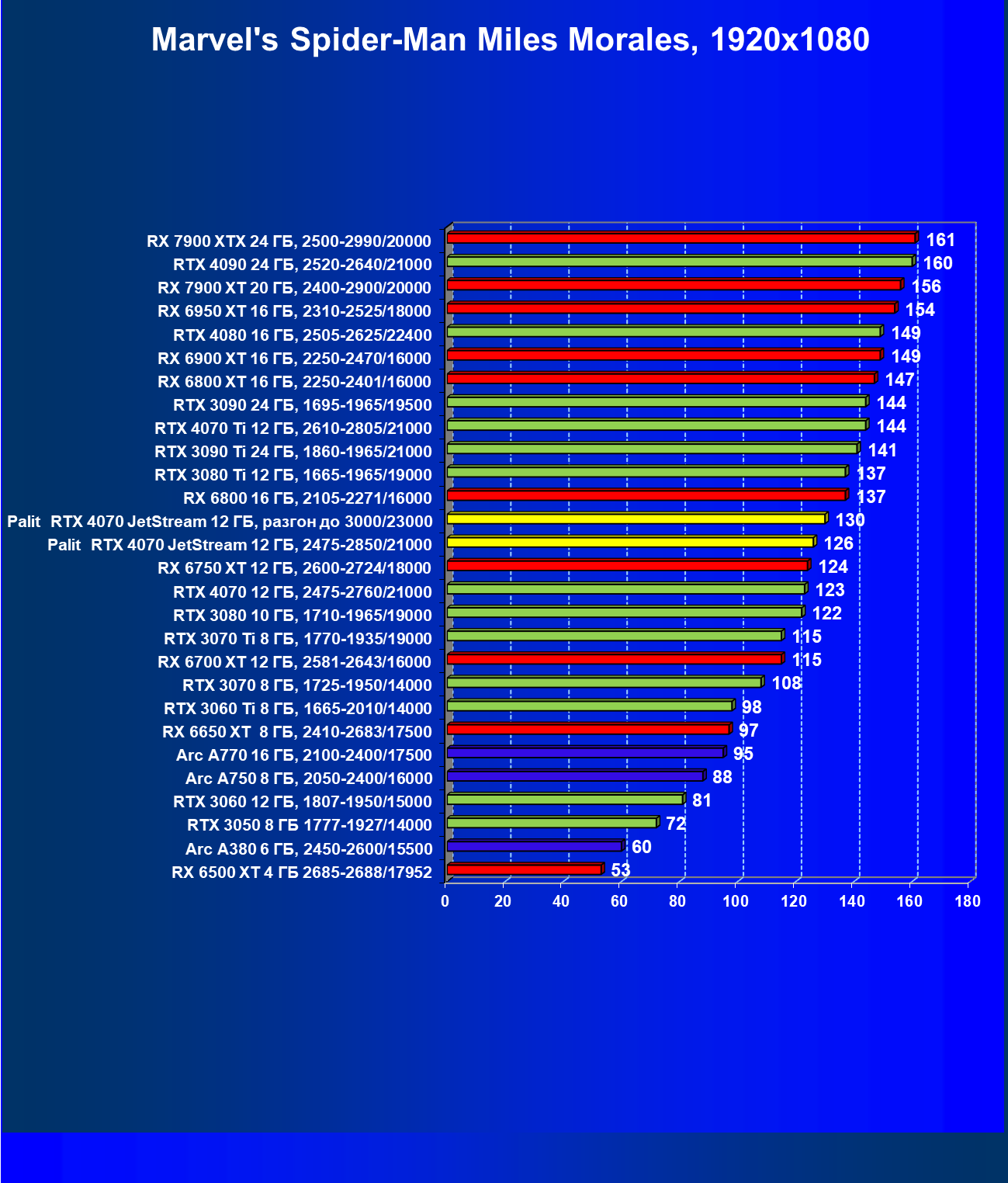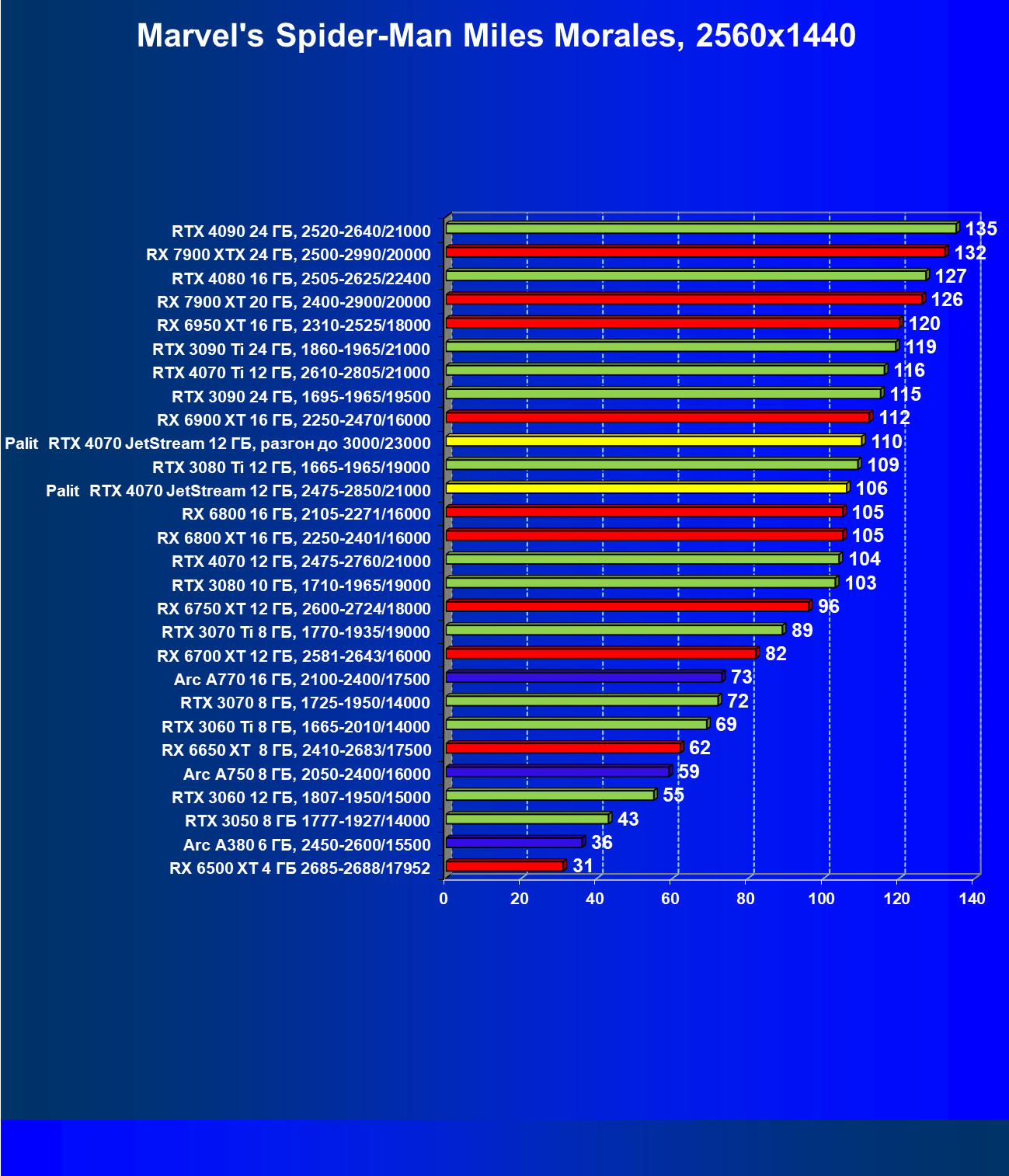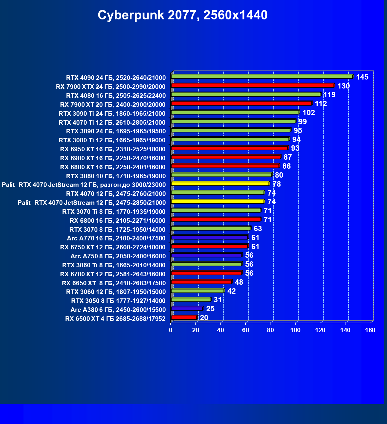 | 14 | Palit RTX 4070 JetStream 12 ГБ, 2475—2850/21000 | 73 | 458 | 62 500 |