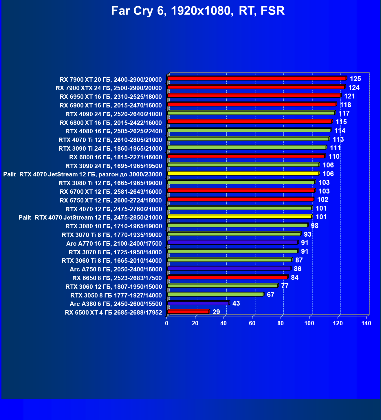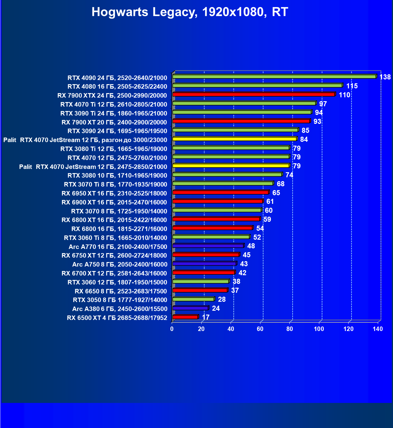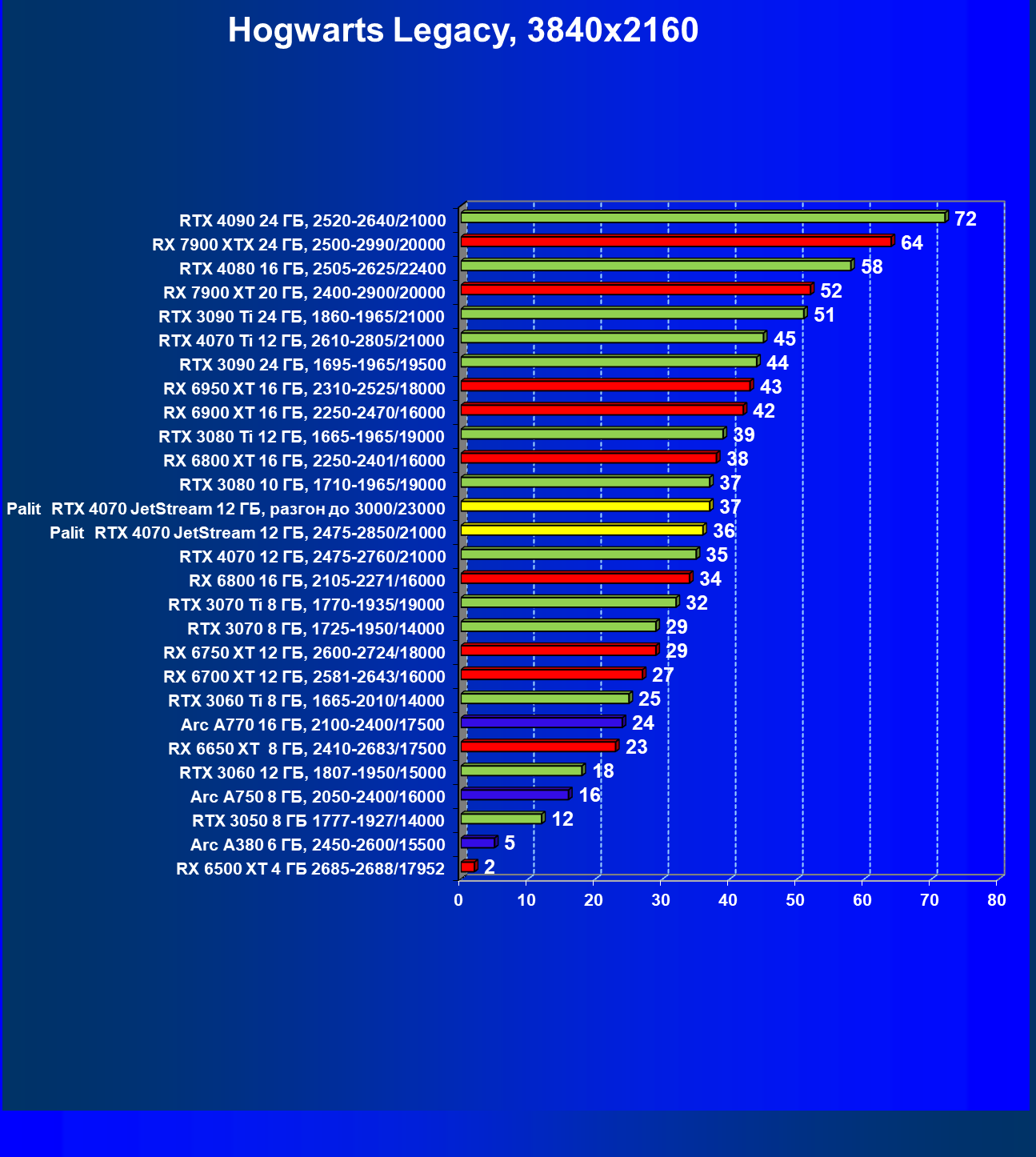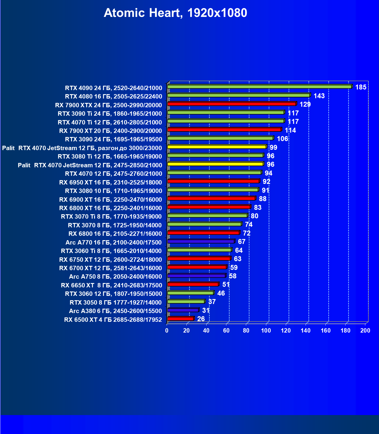 | 14 | Palit RTX 4070 JetStream 12 ГБ, 2475—2850/21000 | 73 | 458 | 62 500 |