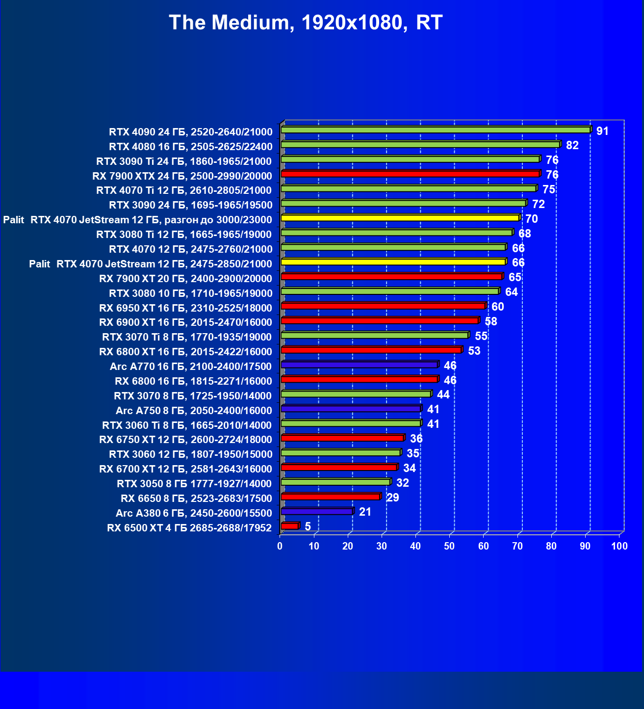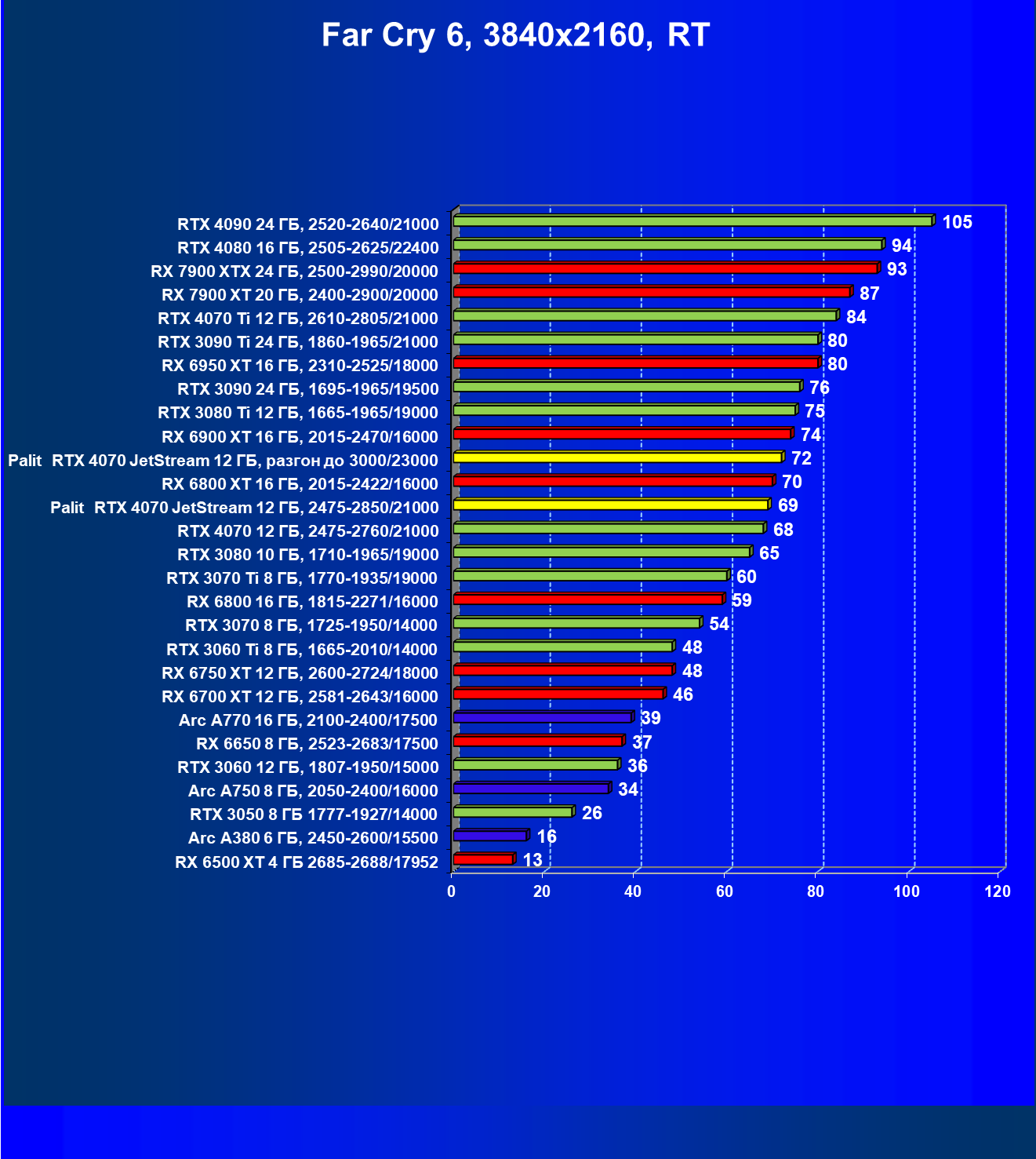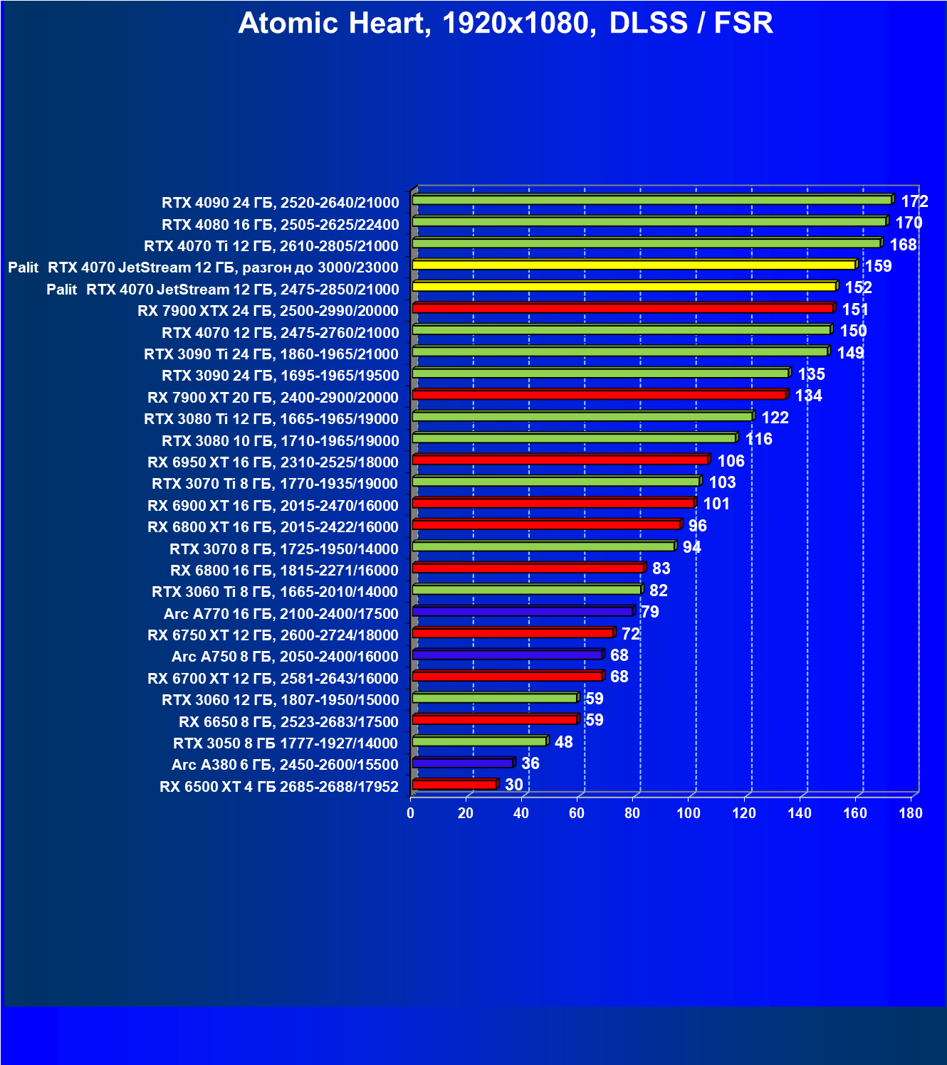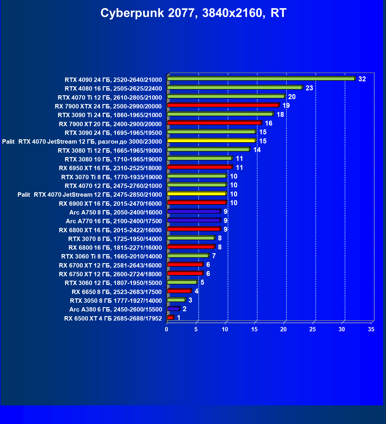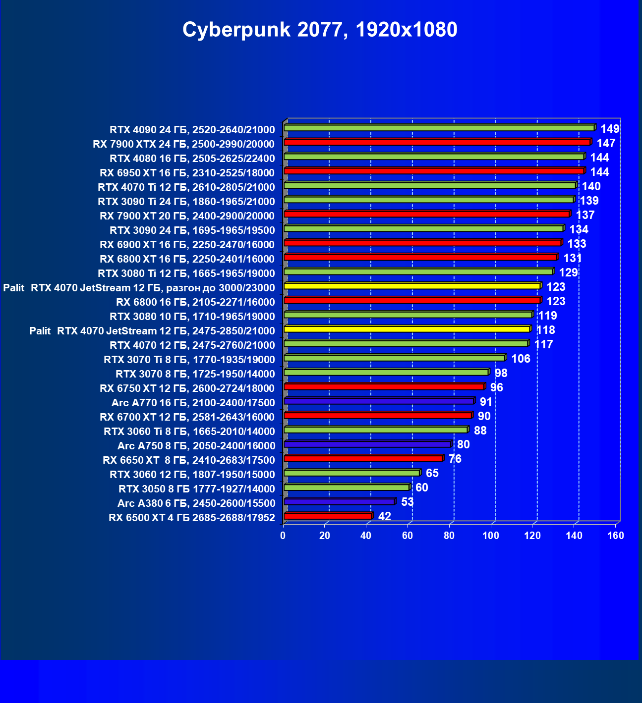 | 14 | Palit RTX 4070 JetStream 12 ГБ, 2475—2850/21000 | 73 | 458 | 62 500 |