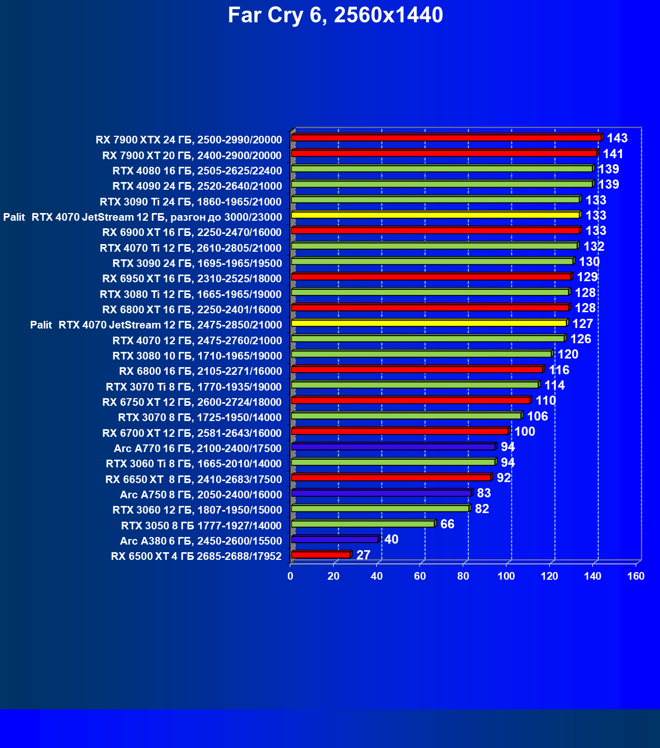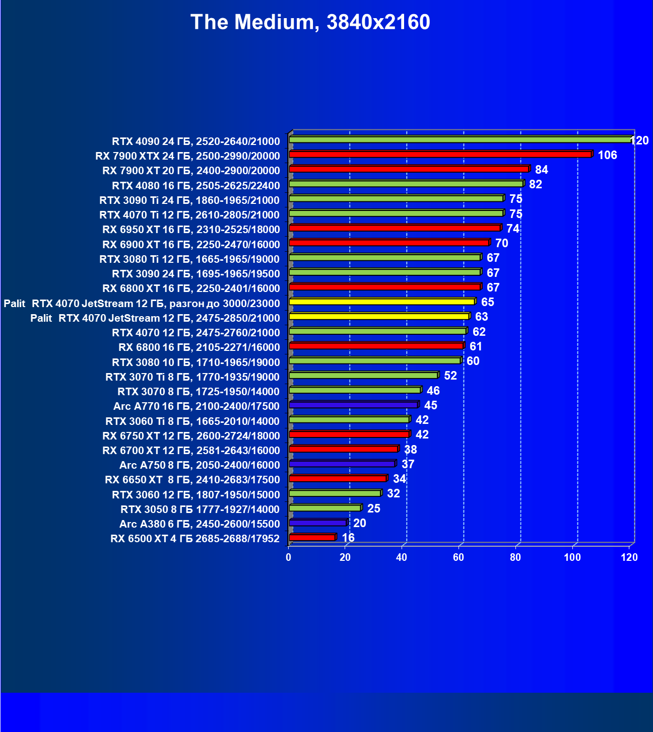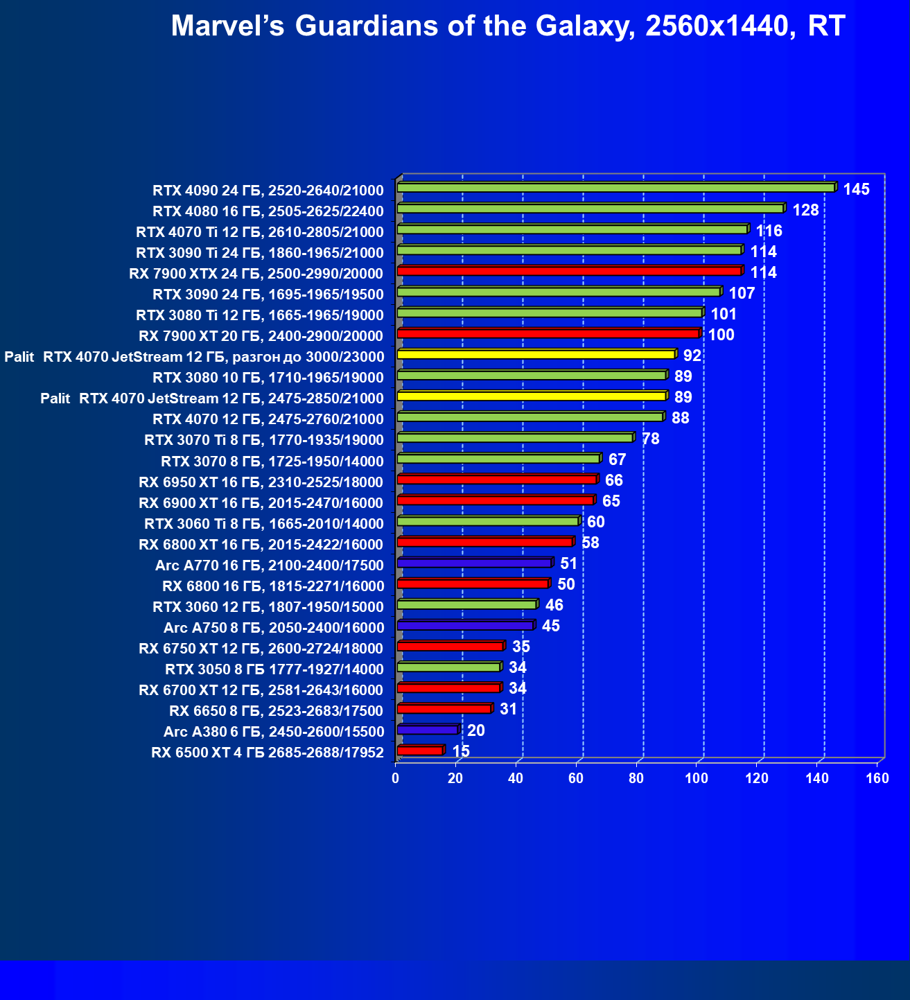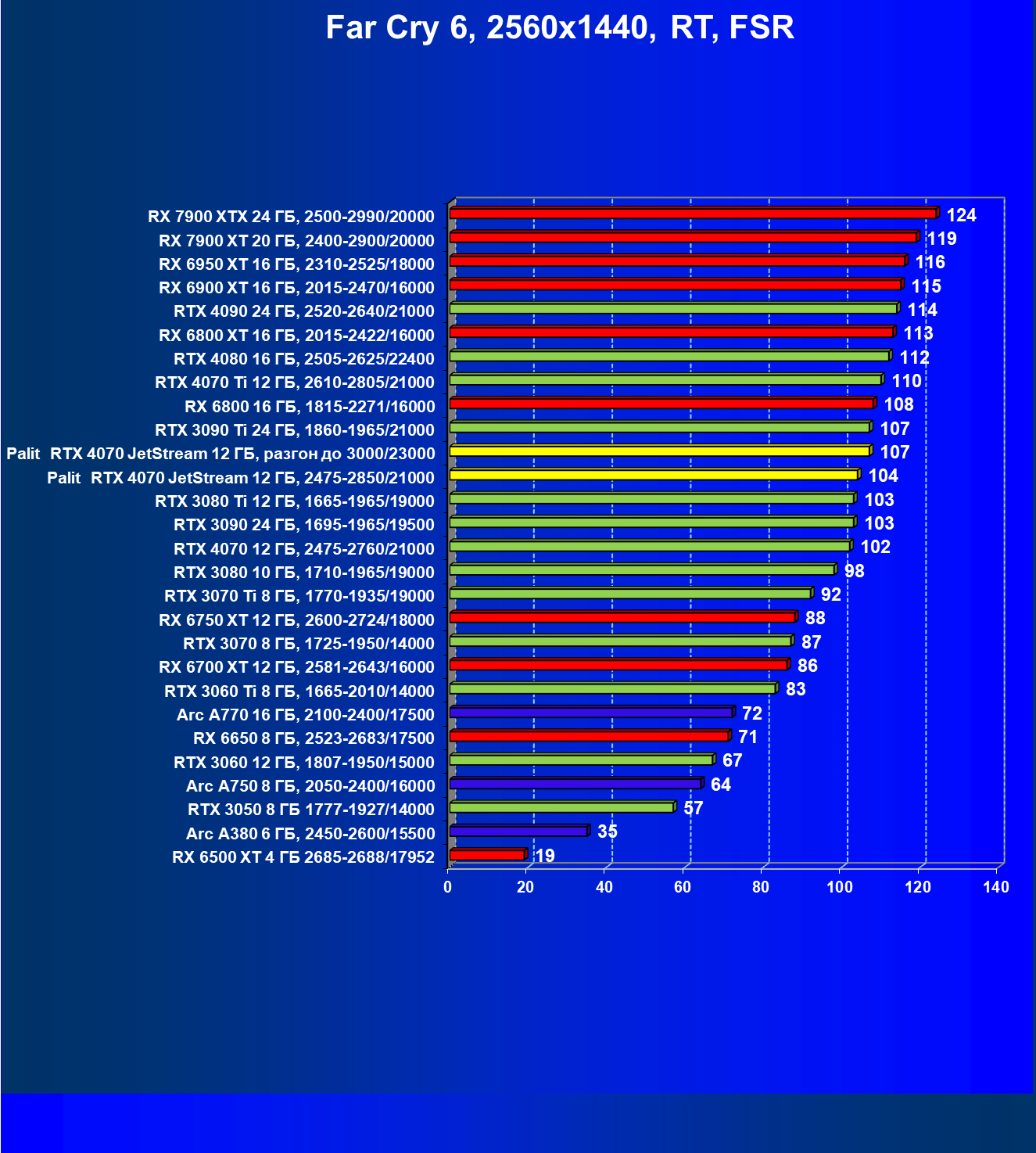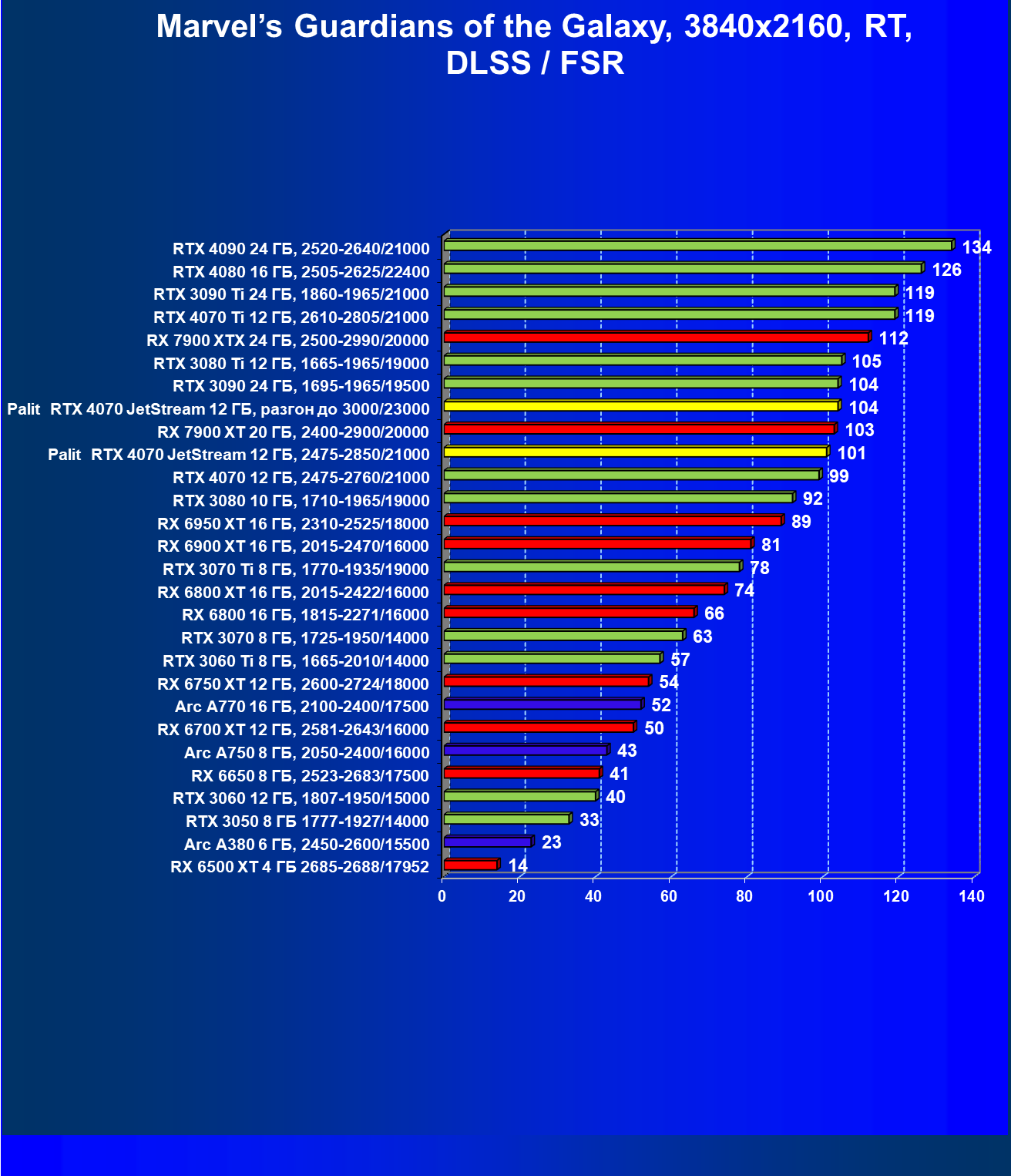 | 14 | Palit RTX 4070 JetStream 12 ГБ, 2475—2850/21000 | 73 | 458 | 62 500 |
