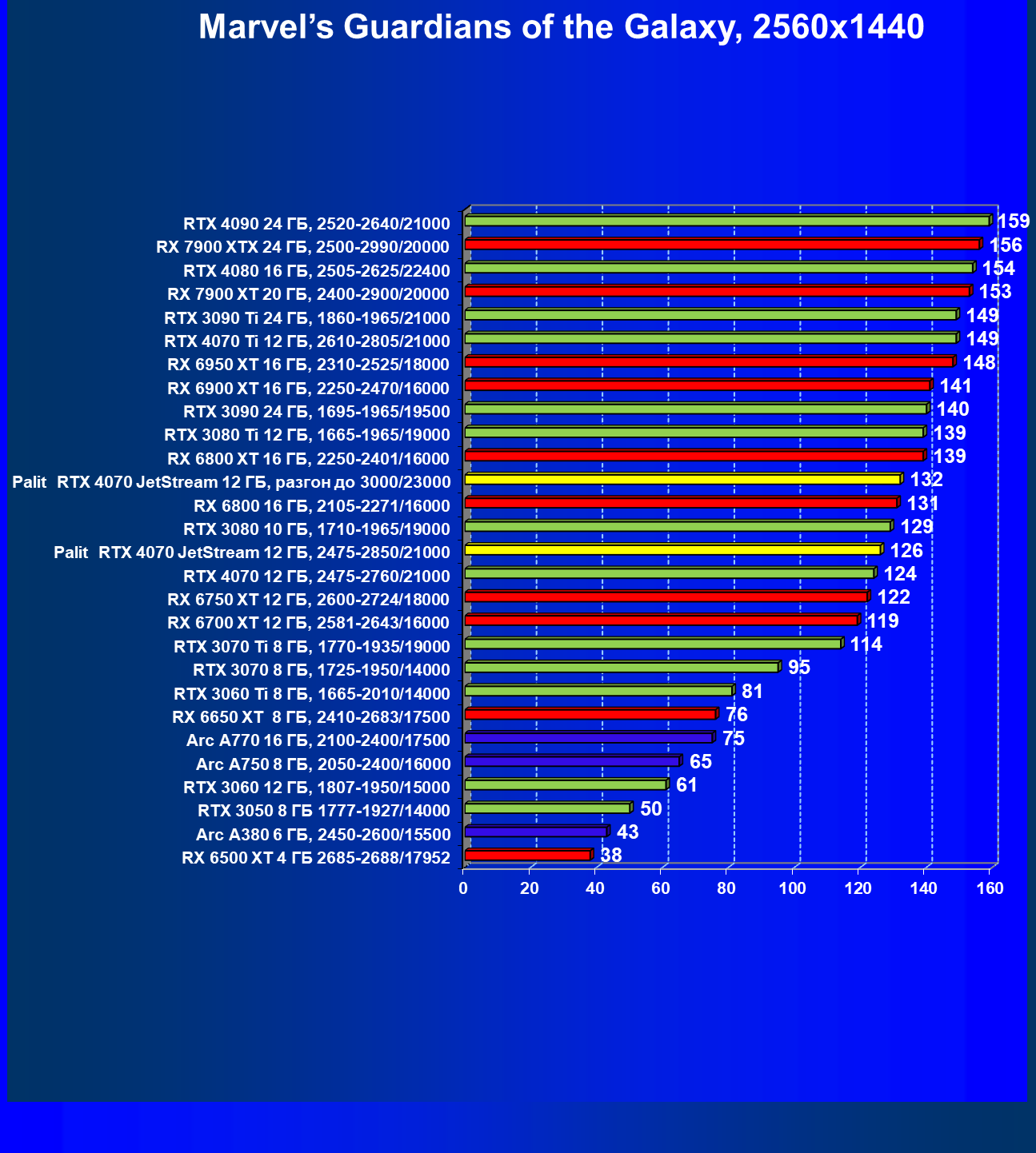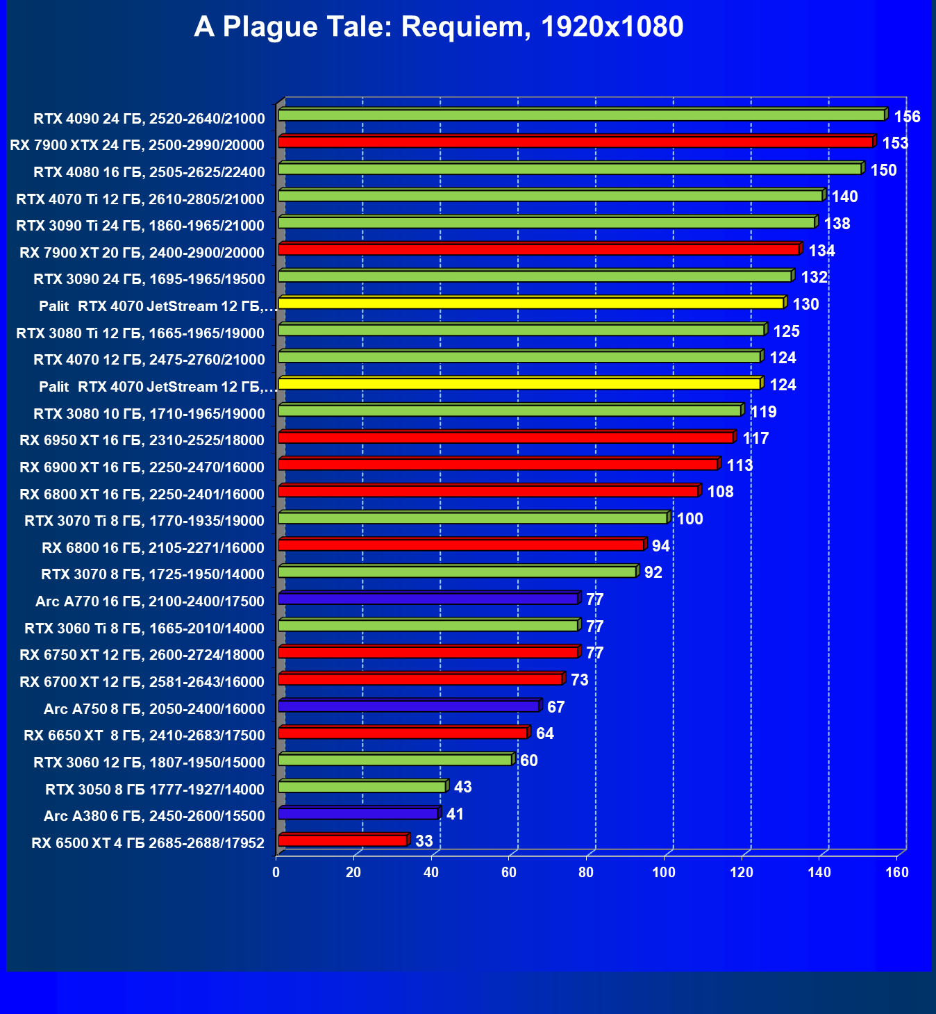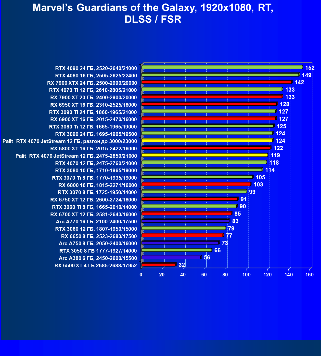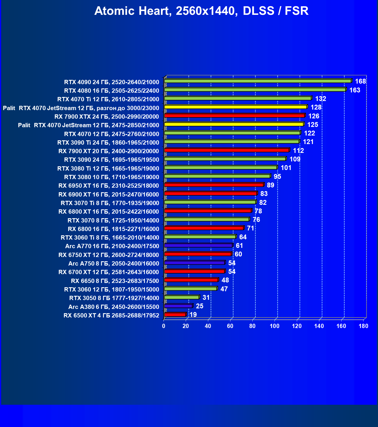 | 14 | Palit RTX 4070 JetStream 12 ГБ, 2475—2850/21000 | 73 | 458 | 62 500 |
