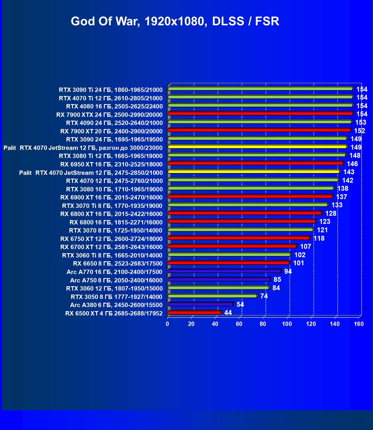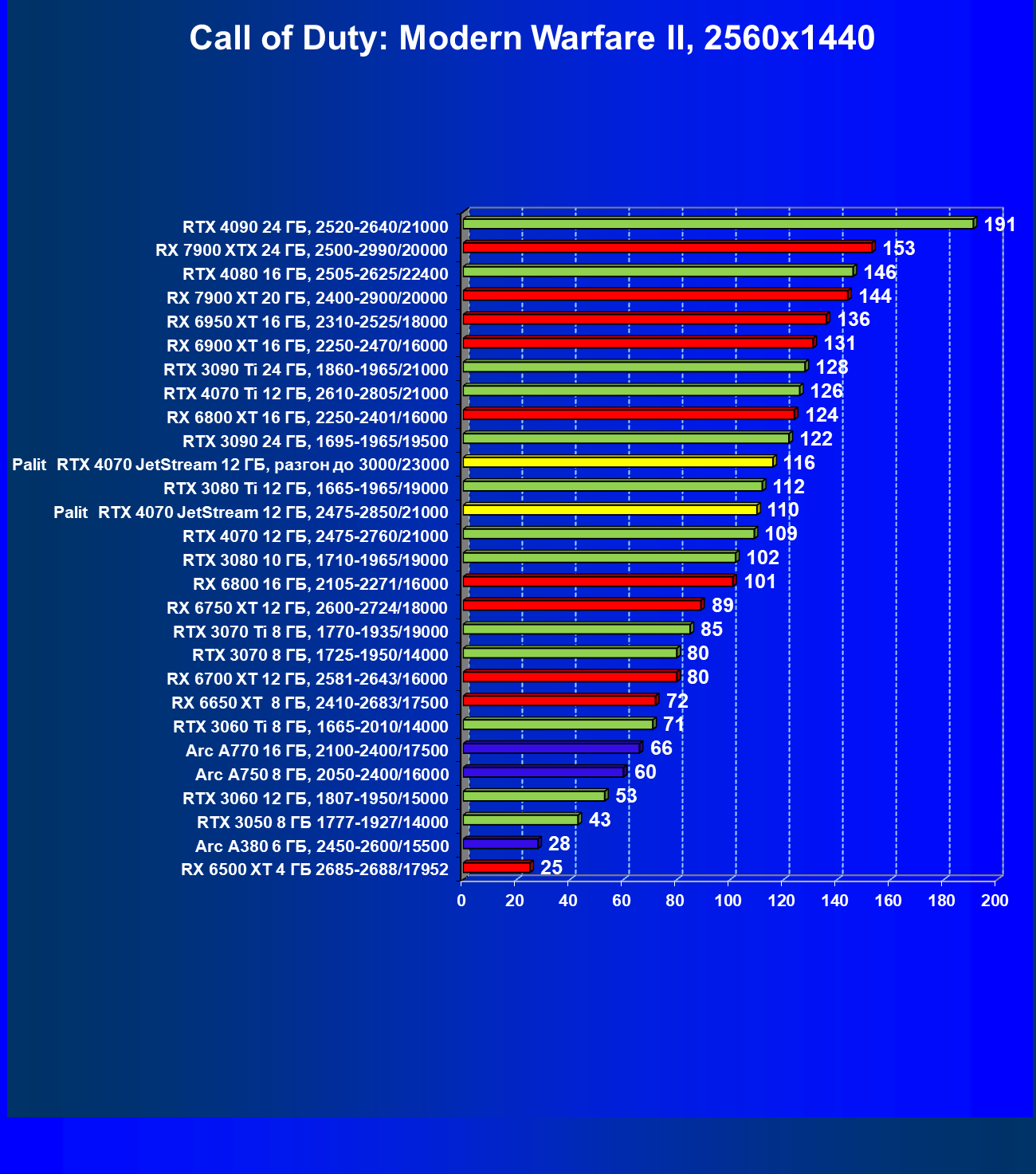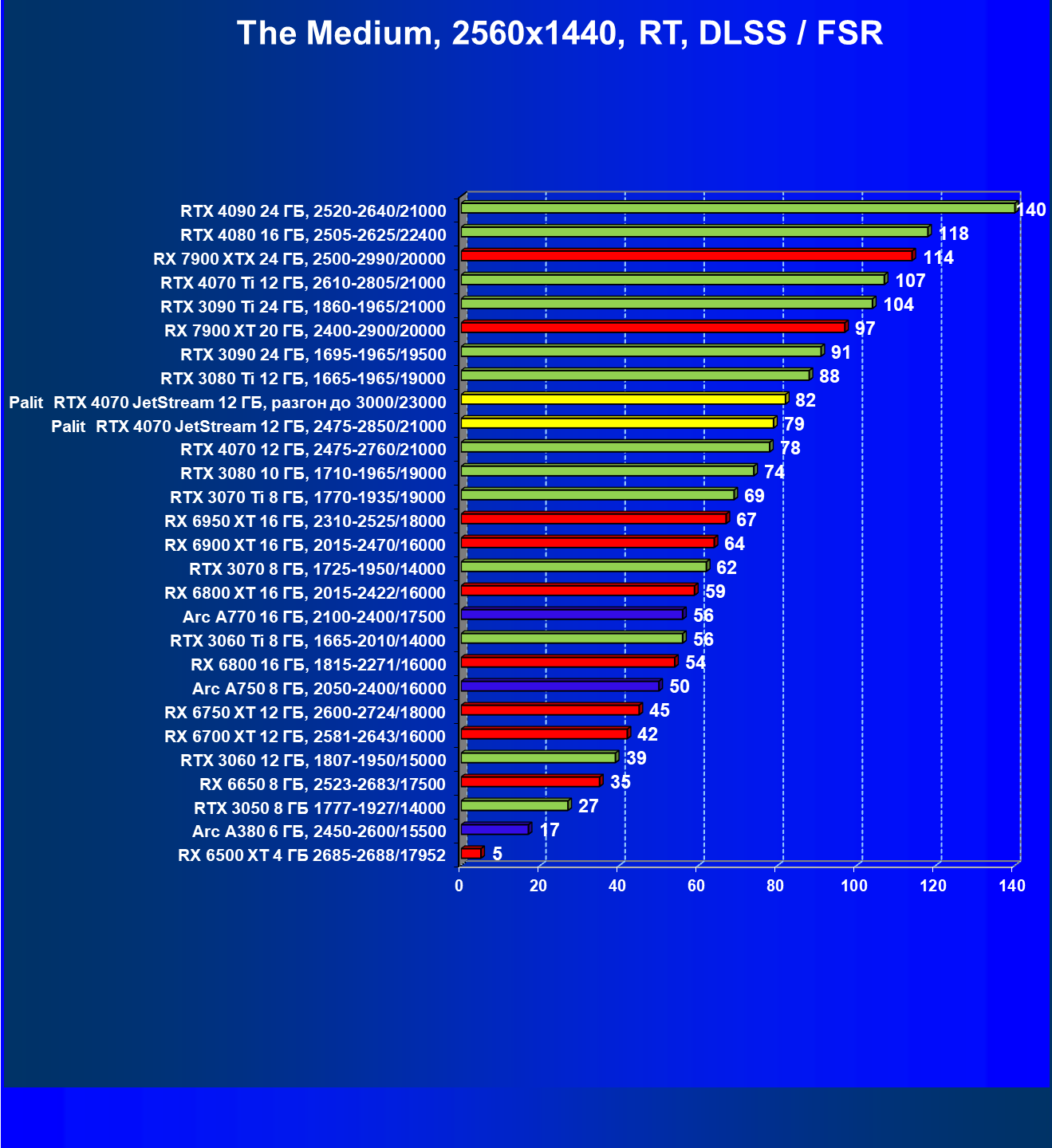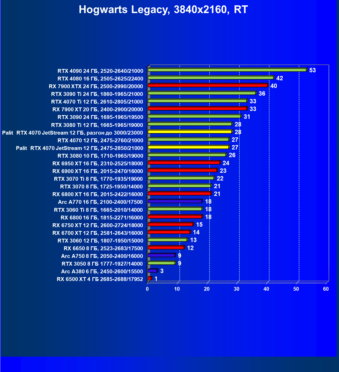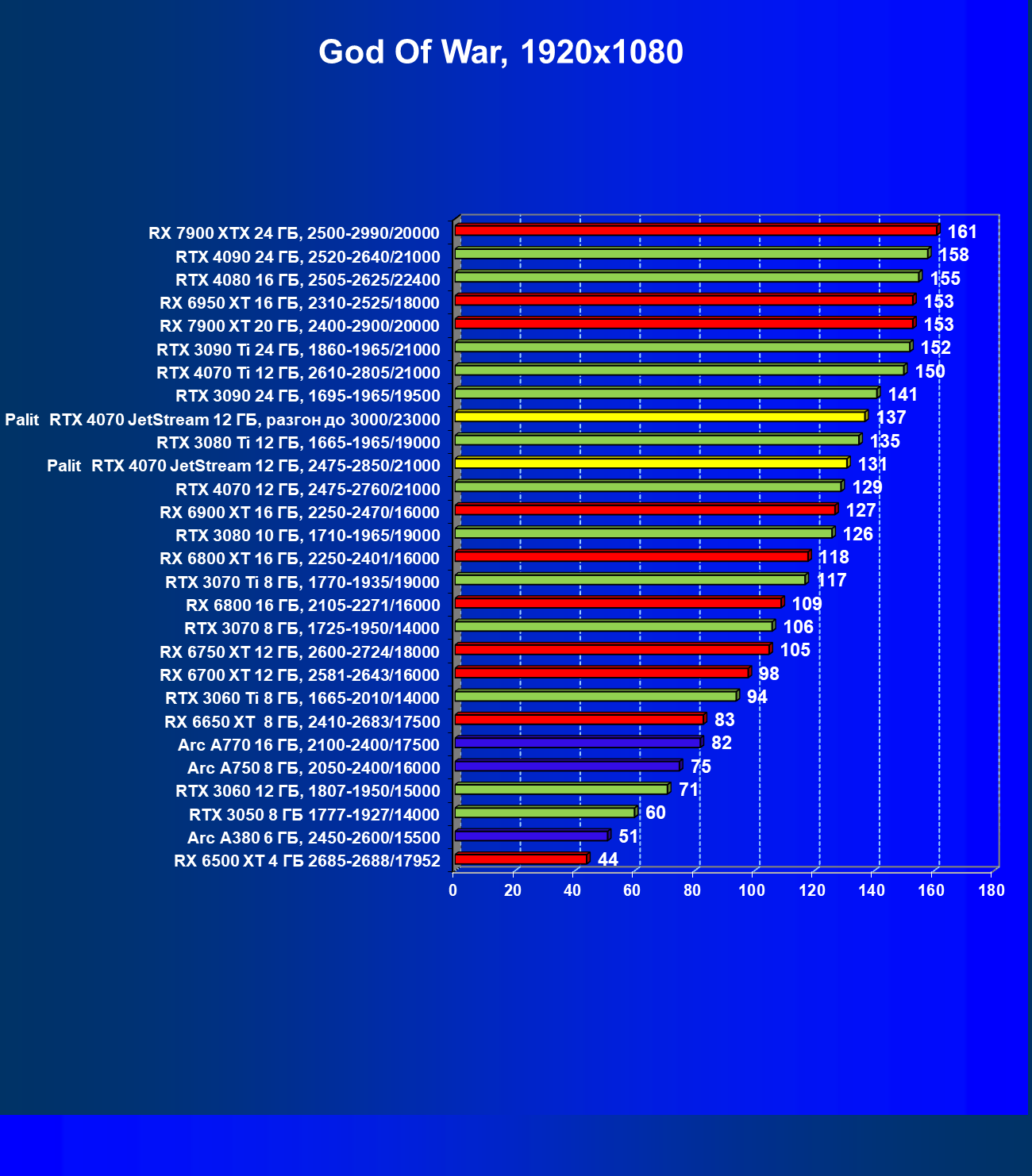 | 14 | Palit RTX 4070 JetStream 12 ГБ, 2475—2850/21000 | 73 | 458 | 62 500 |