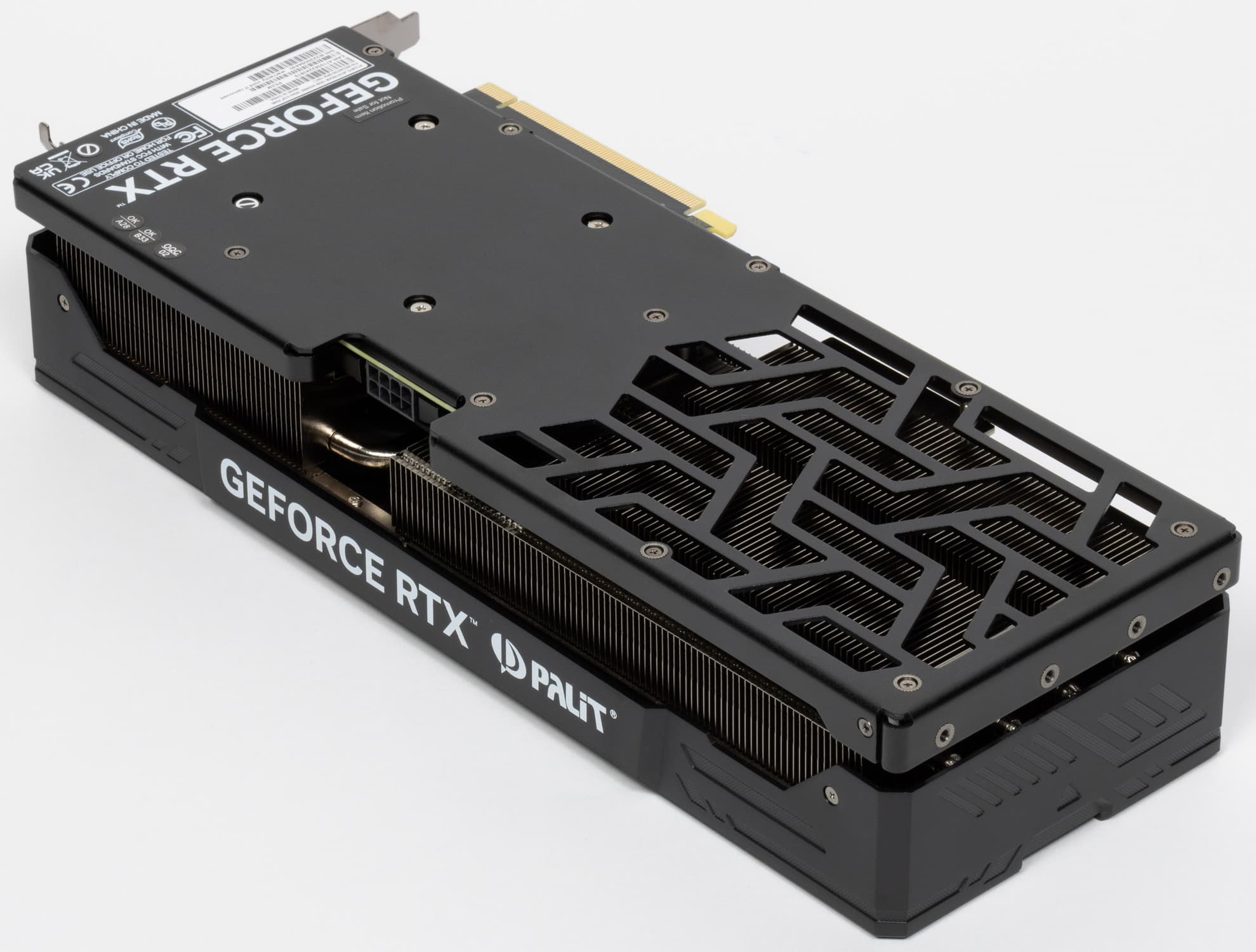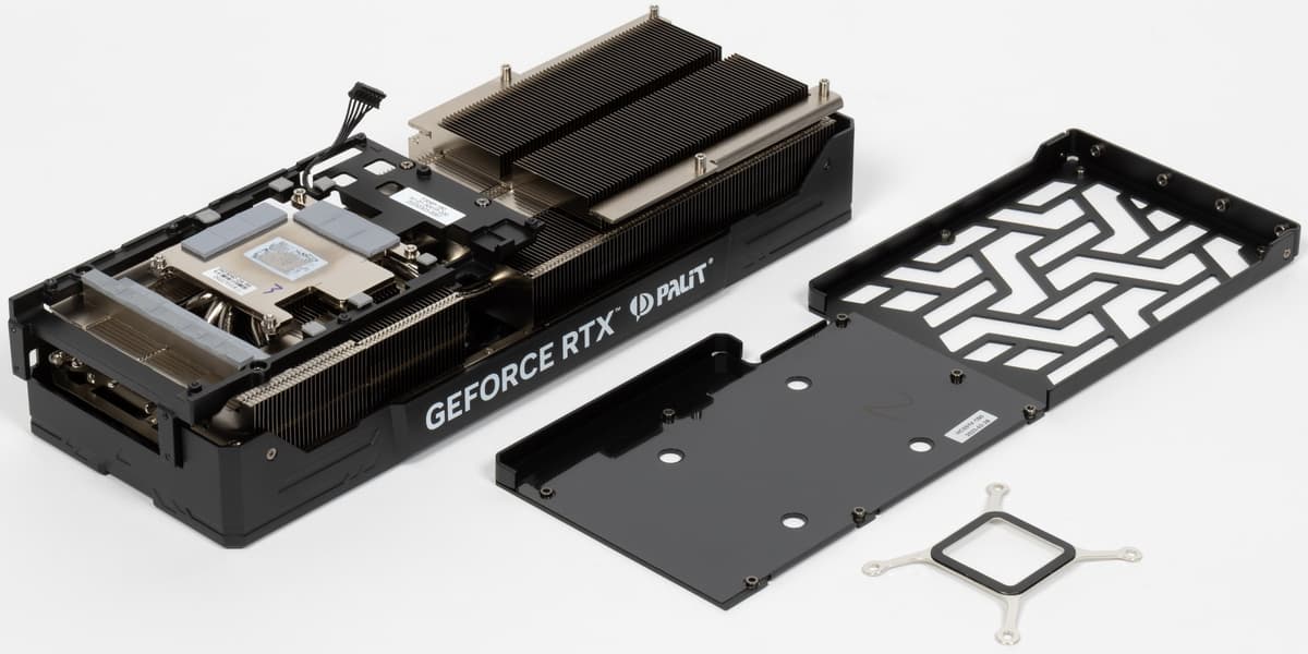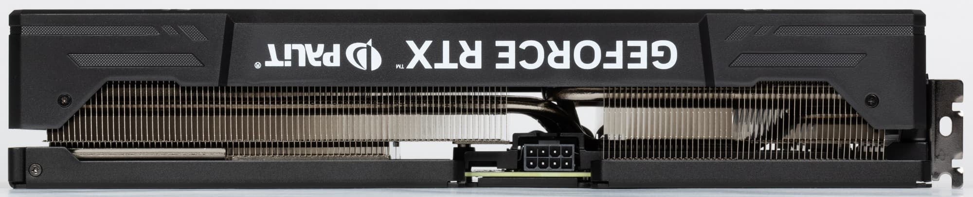 У карты Palit основой кулера является многосекционный пластинчатый никелированный радиатор с тепловыми трубками, распределяющими тепло по ребрам радиатора. Трубки припаяны к огромной медной никелированной подошве, которая охлаждает как ядро, так и микросхемы памяти (через термопрокладки). А для охлаждения преобразователей питания VRM имеется своя подошва на массивной черной раме, прикрученной к радиаторе (сам рама служит также элементом жесткости всей конструкции).