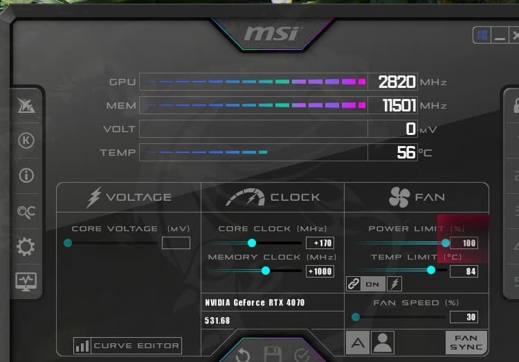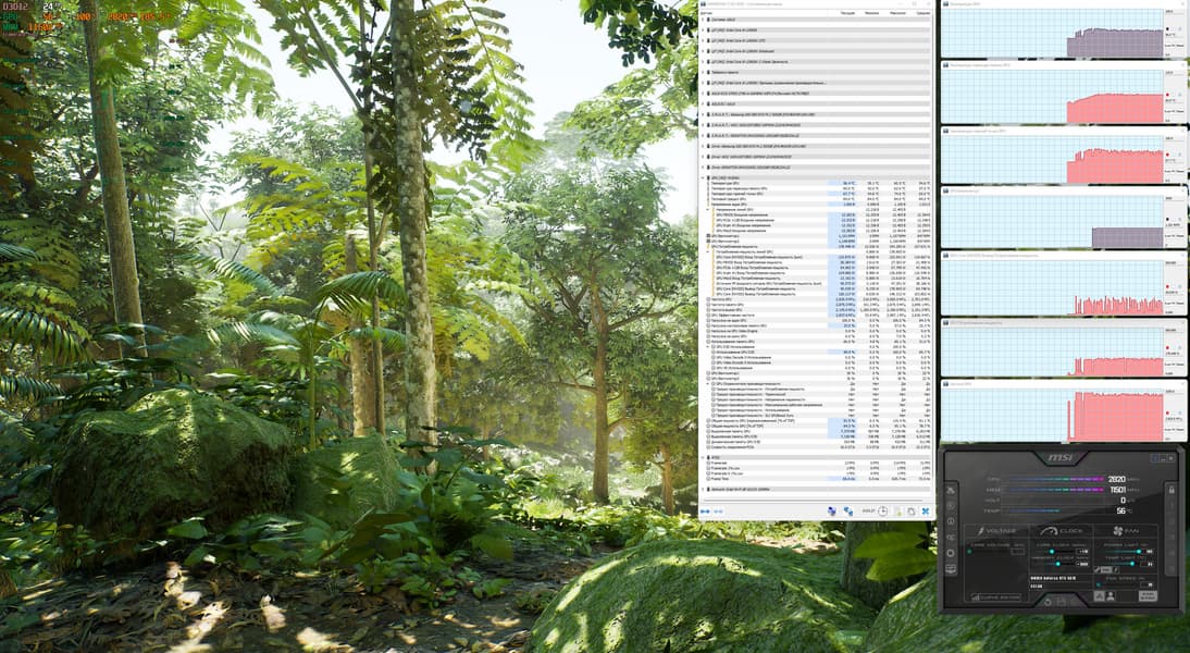 Я попробовал ручной разгон и получил максимальные частоты 3000/23000 МГц, что на 8,7% больше, чем максимальные референс-частоты, и это обеспечило прирост FPS в играх в среднем почти на 3,5% относительно референс-показателей (при этом не представляется возможным поднять лимит потребления выше 100%), энергопотребление карты почти не изменилось.