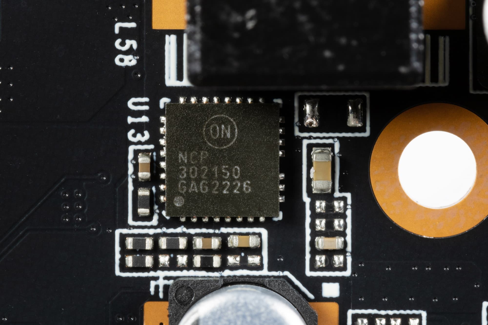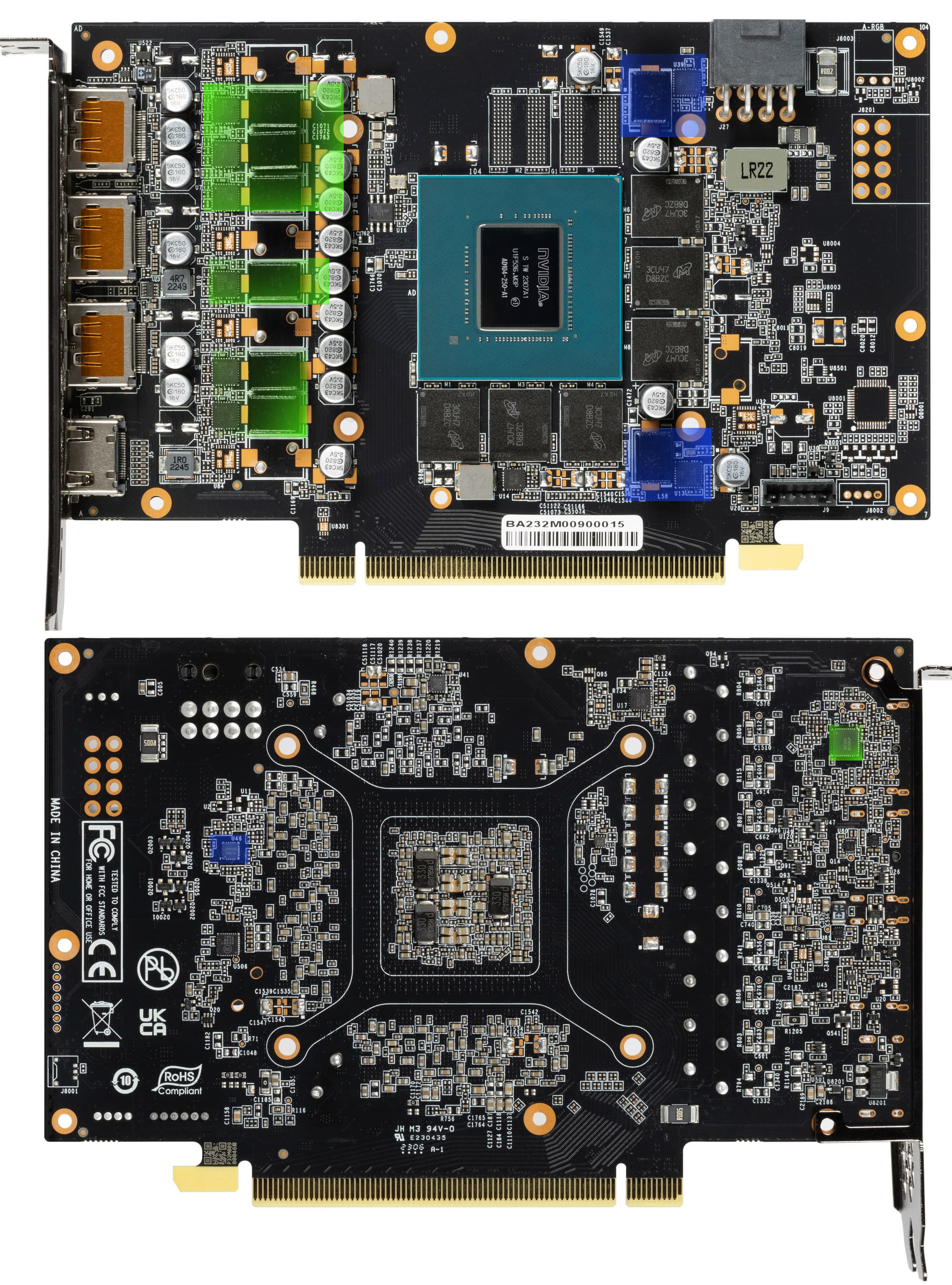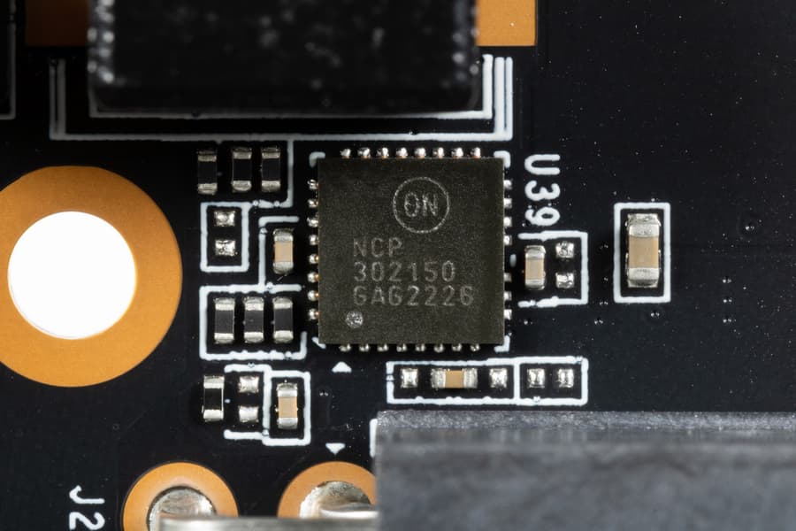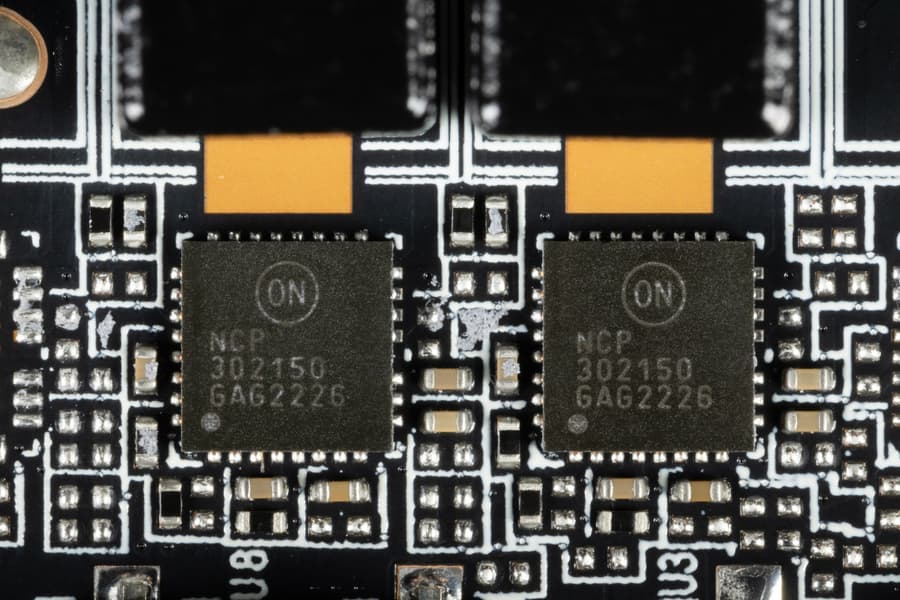 В преобразователе питания, традиционно для всех видеокарт Nvidia, используются транзисторные сборки DrMOS — в данном случае NCP302150 (On Semiconductor), каждая из которых рассчитана максимум на 50 А.