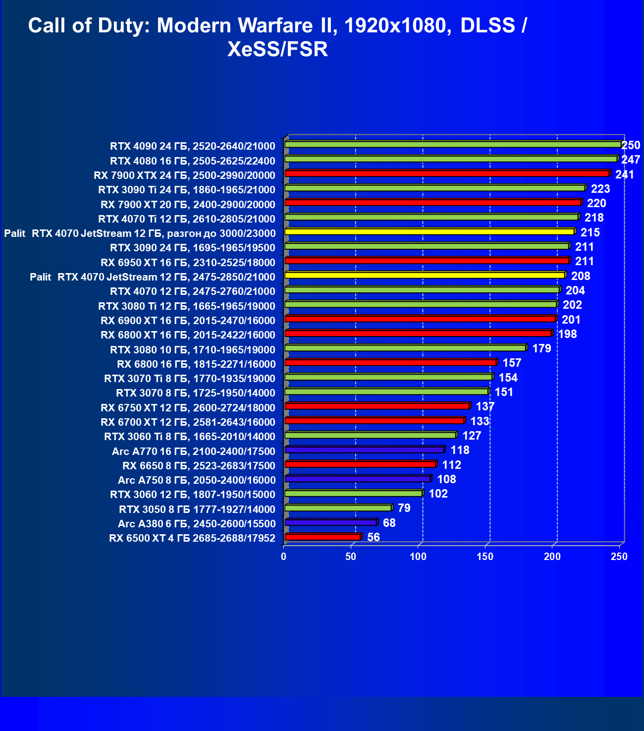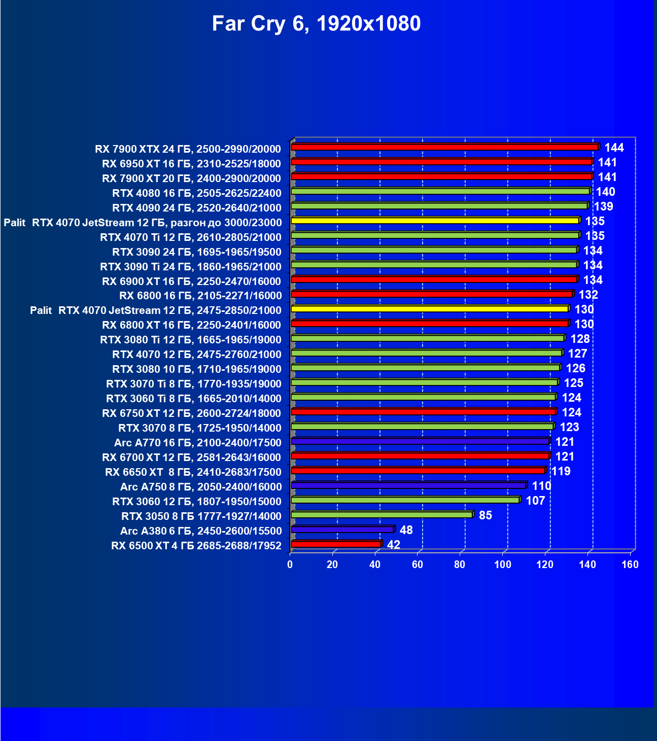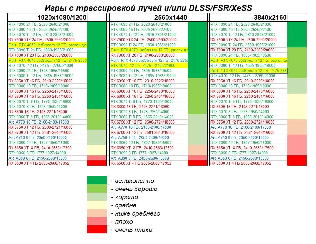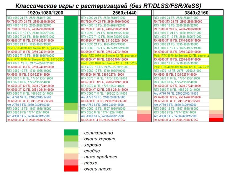 | 13 | Palit RTX 4070 JetStream 12 ГБ, 2475—2850/21000 | 458 | 73 | 62 500 |