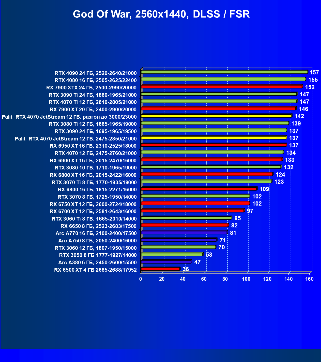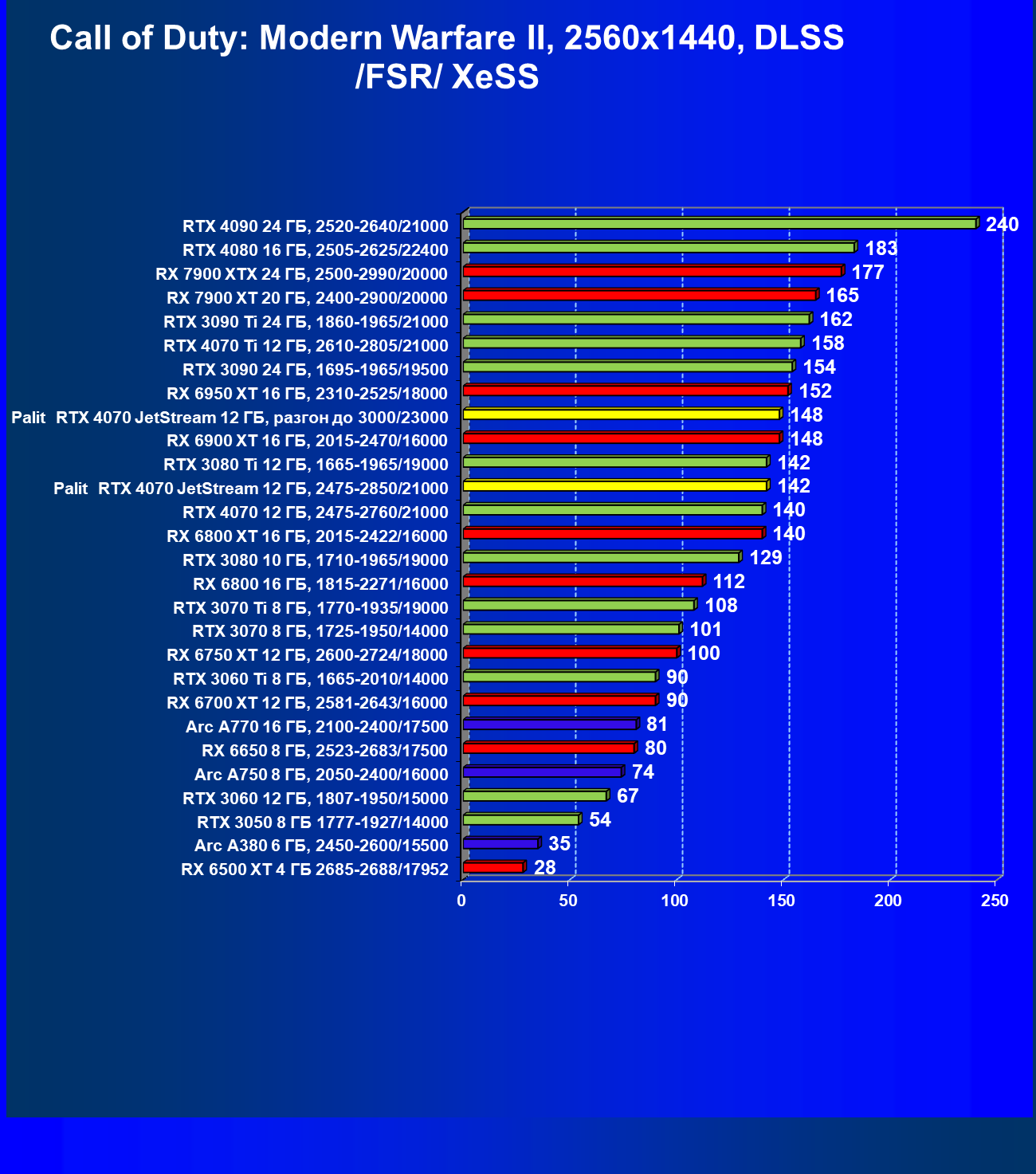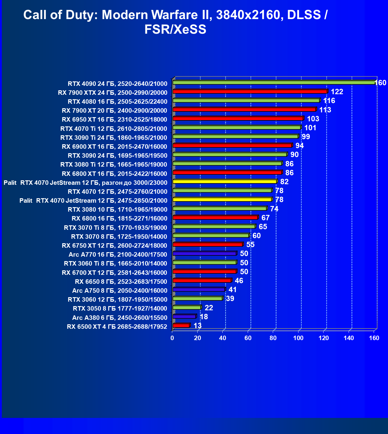| 13 | Palit RTX 4070 JetStream 12 ГБ, 2475—2850/21000 | 458 | 73 | 62 500 |